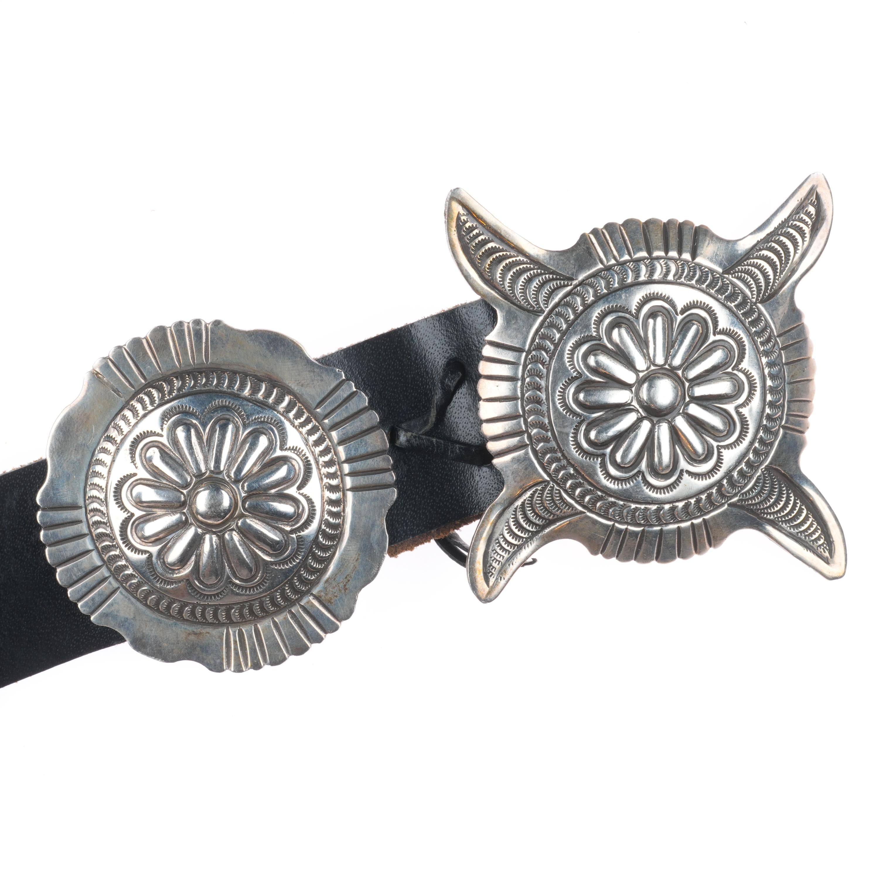 39" Vintage Navajo deep stamped sterling silver heavy concho belt. Tested and guaranteed solid sterling silver with weight and measurements in pictures. Fully functional. Fits up to a 39" waist with added holes, measurements of holes shown in pics, great condition, circa last quarter of the 20th century.