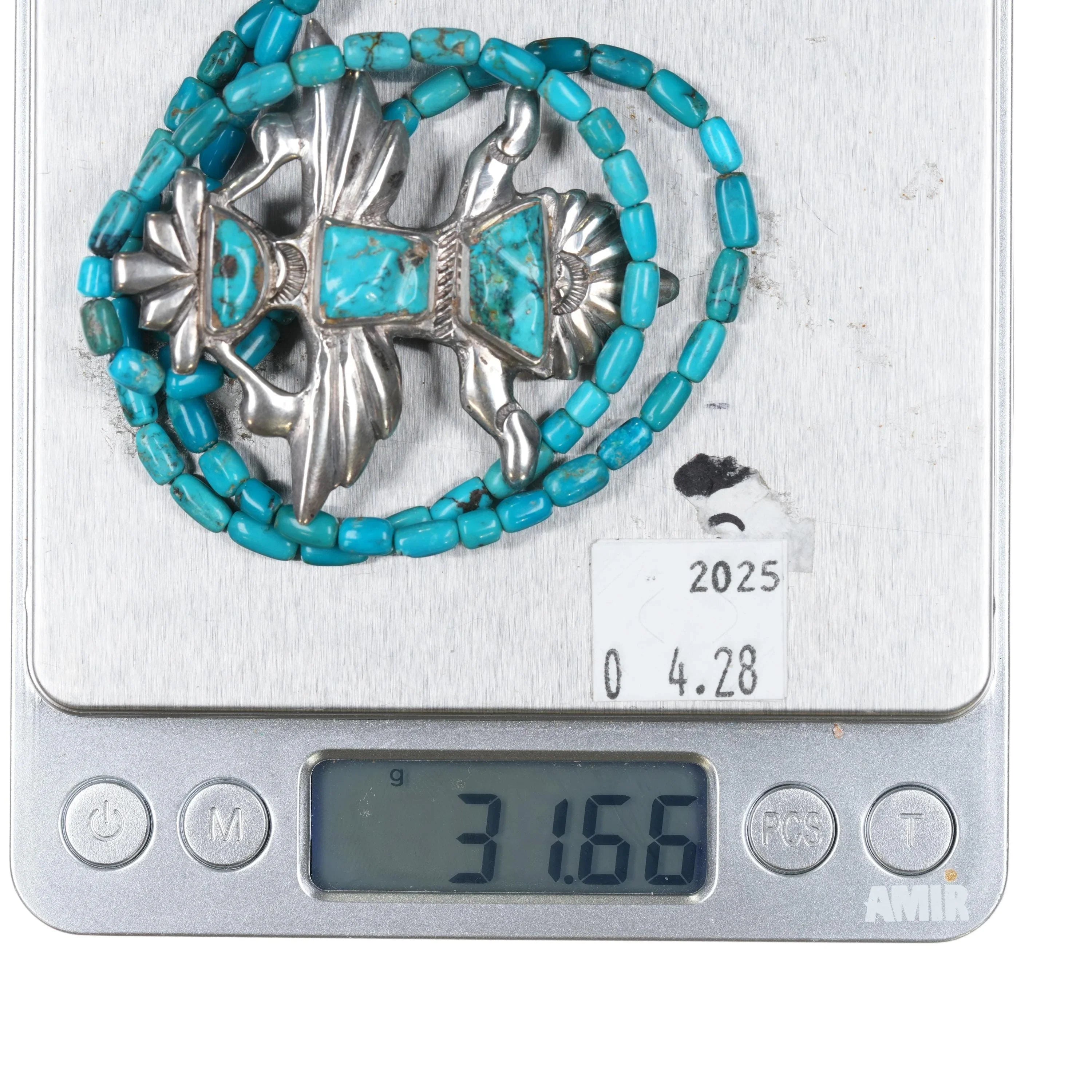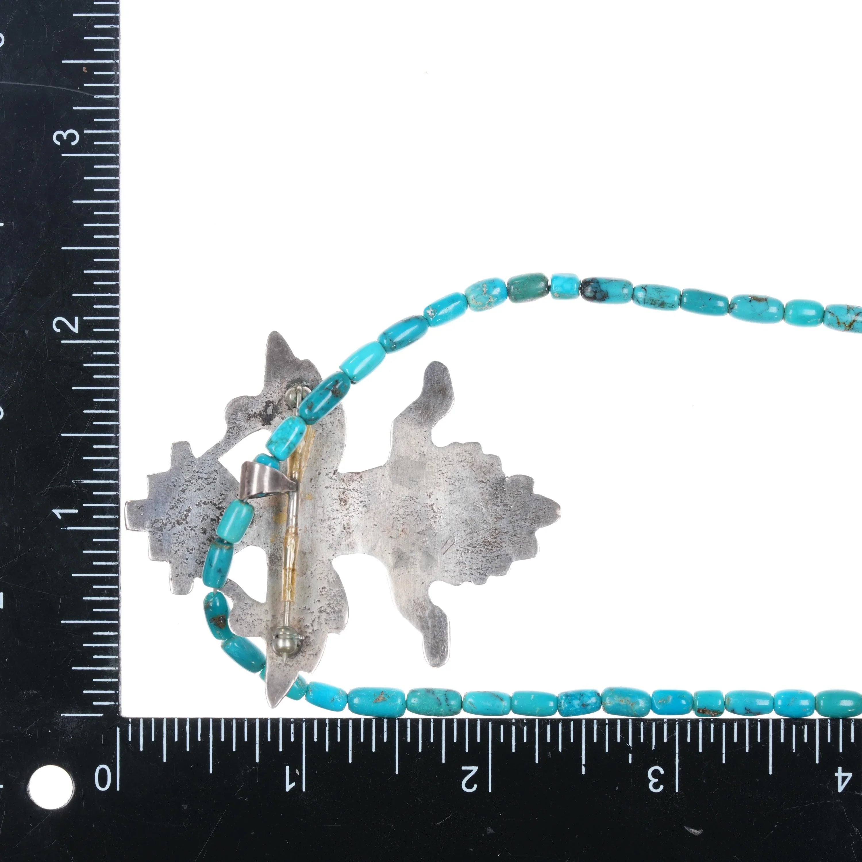 40‘s-50‘s Zuni cast silver high grade carved turquoise knifewing pin/necklace. Selling the great pin shown, circa mid 20th century. Approximately 40 years ago the adapted this removable sleeve that slides over the pin to make it a pendant and added this recent turquoise necklace. I should have separated it but it got photographed before I noticed it, so here it is as shown. Measurements in pictures, pin is unmarked. High quality one of a kind piece, likely made by Horace Iule.
