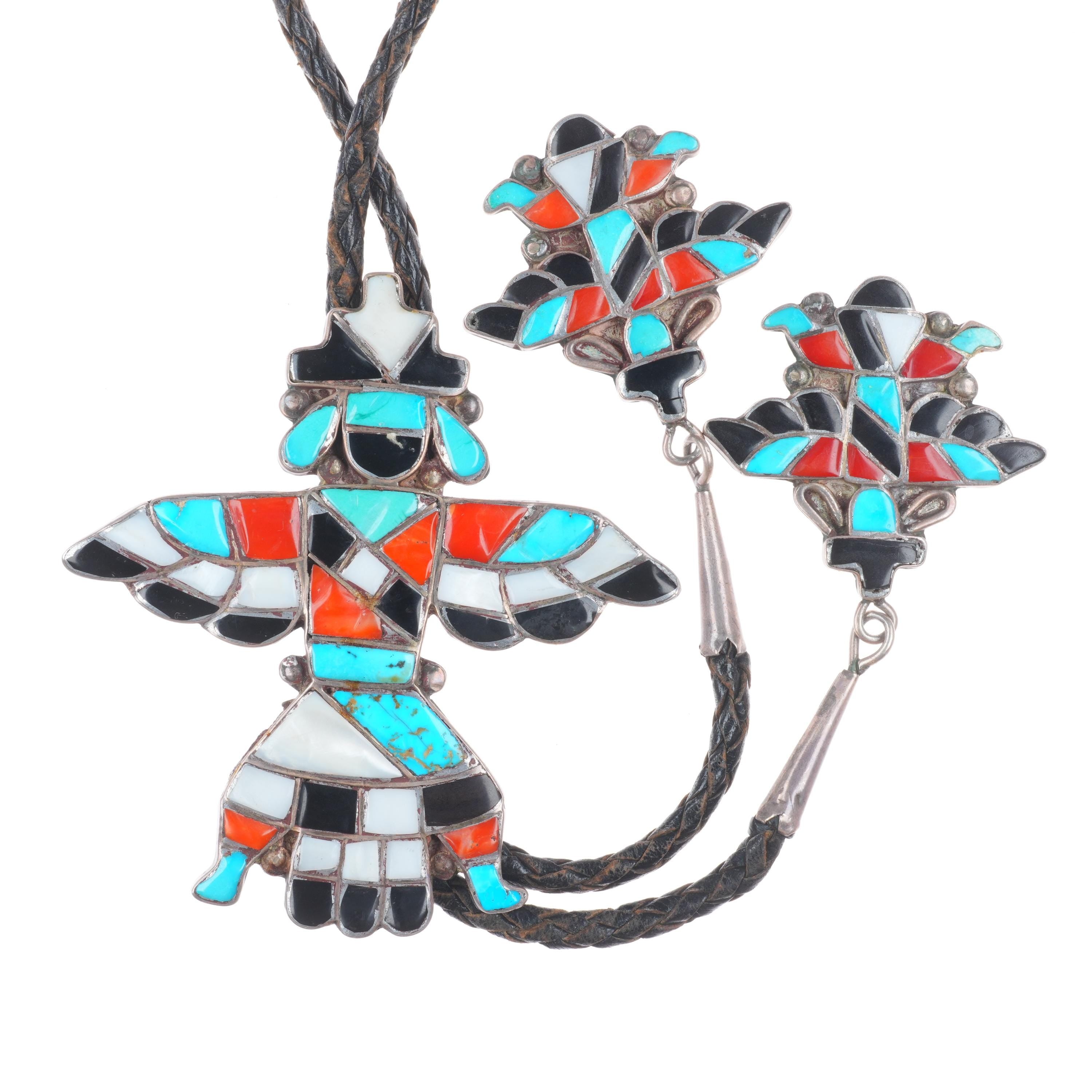 40's-50's Zuni sterling silver channel inlay Knifewing bolo tie fancy tips. Tested and guaranteed solid sterling silver. Weight and measurements in pictures. Great bolo, 39" long with no issues. Weight shown is the entire bolo.