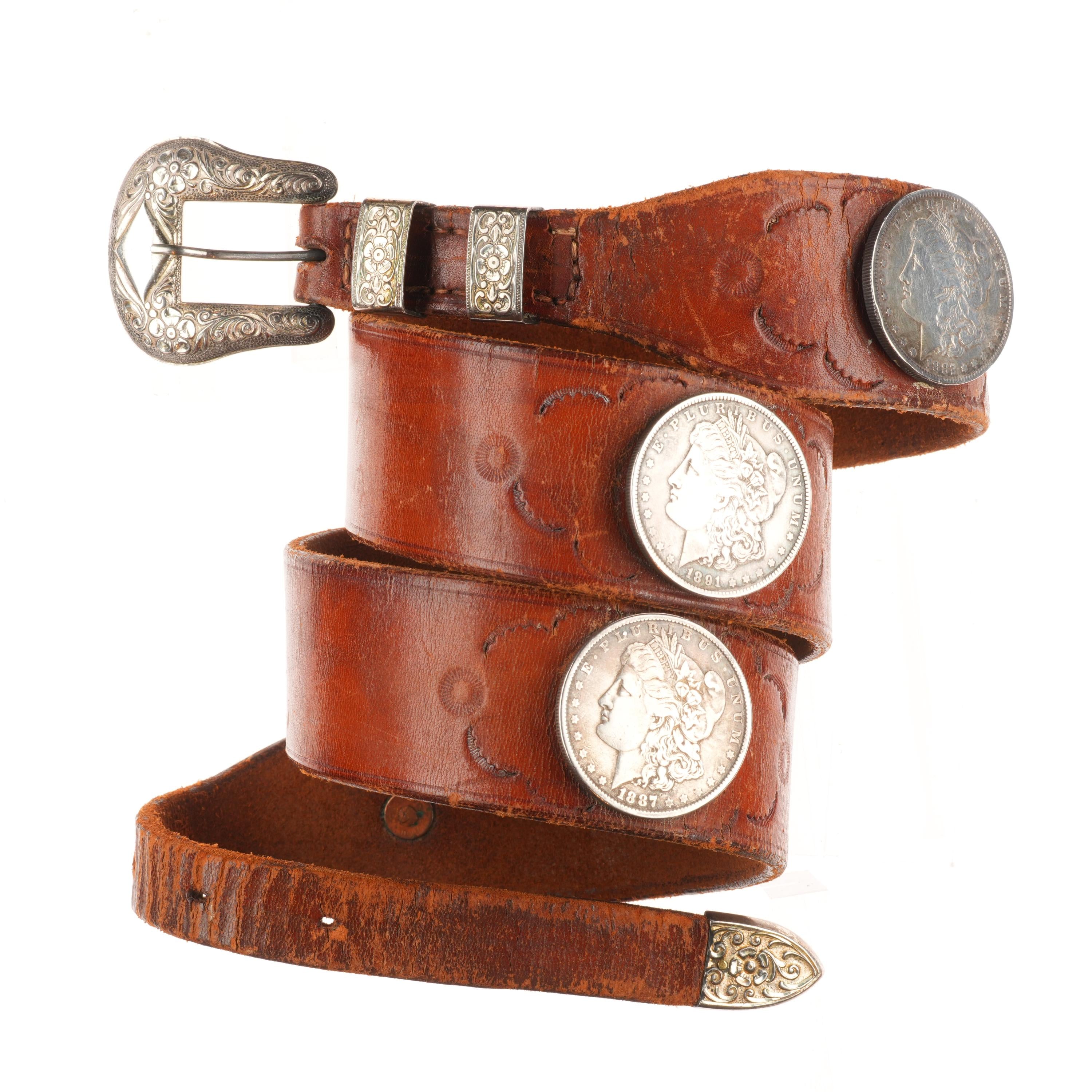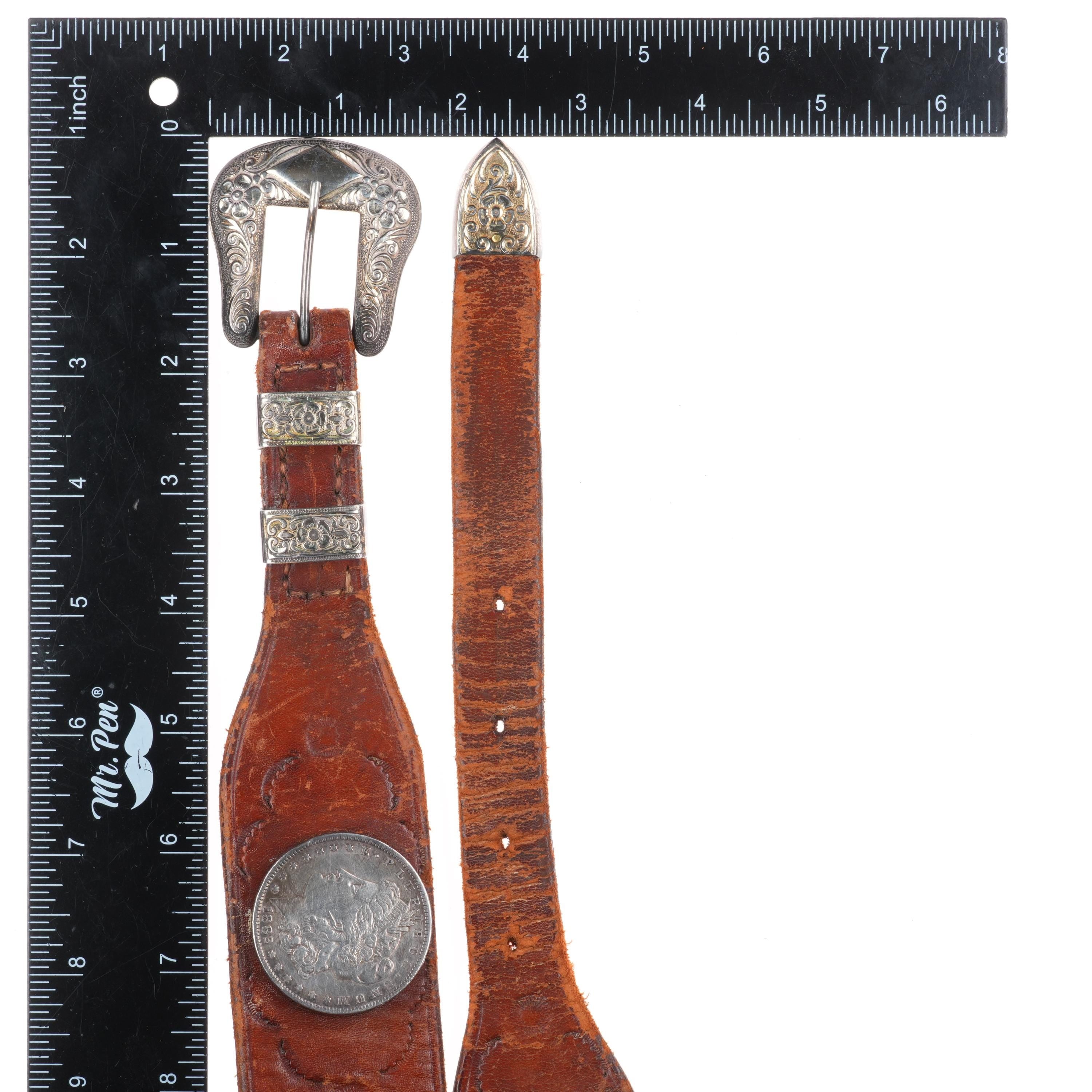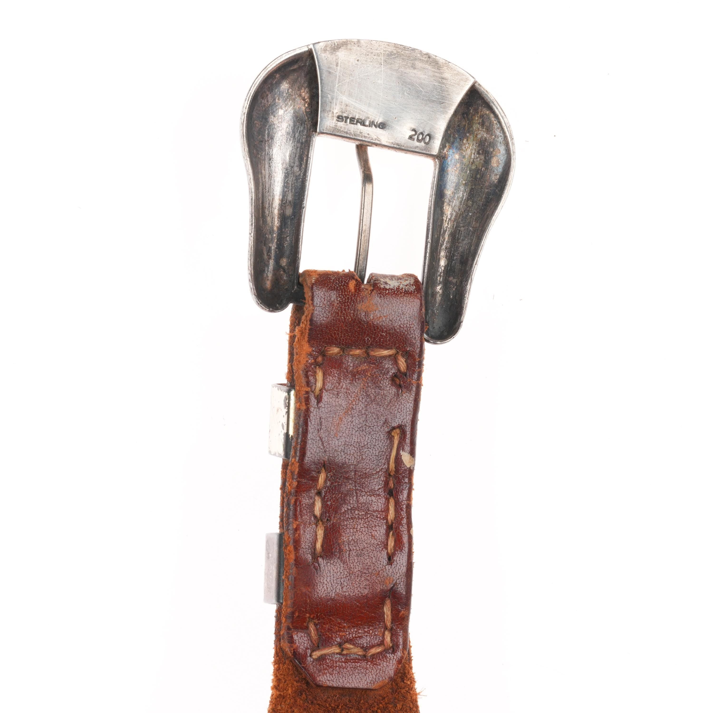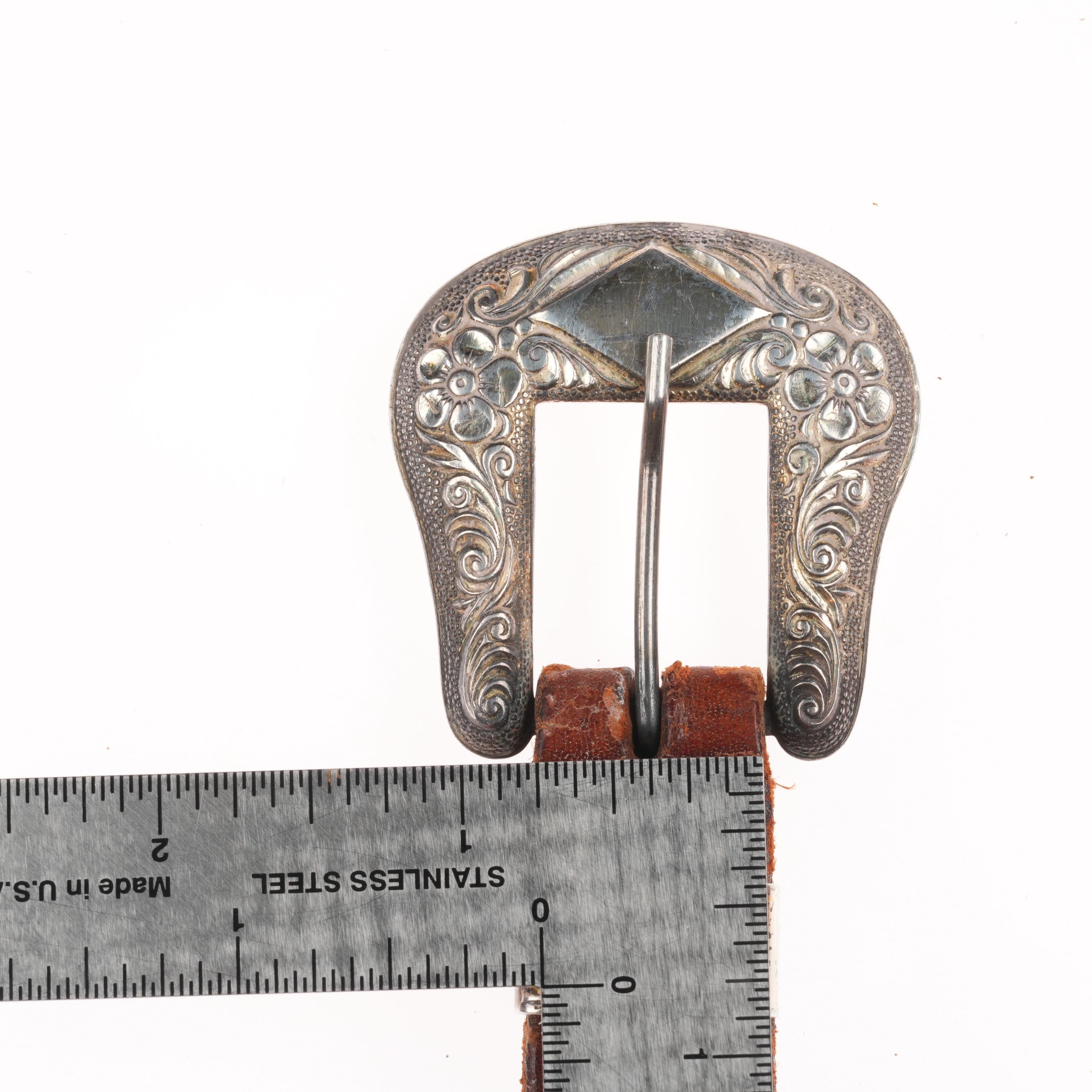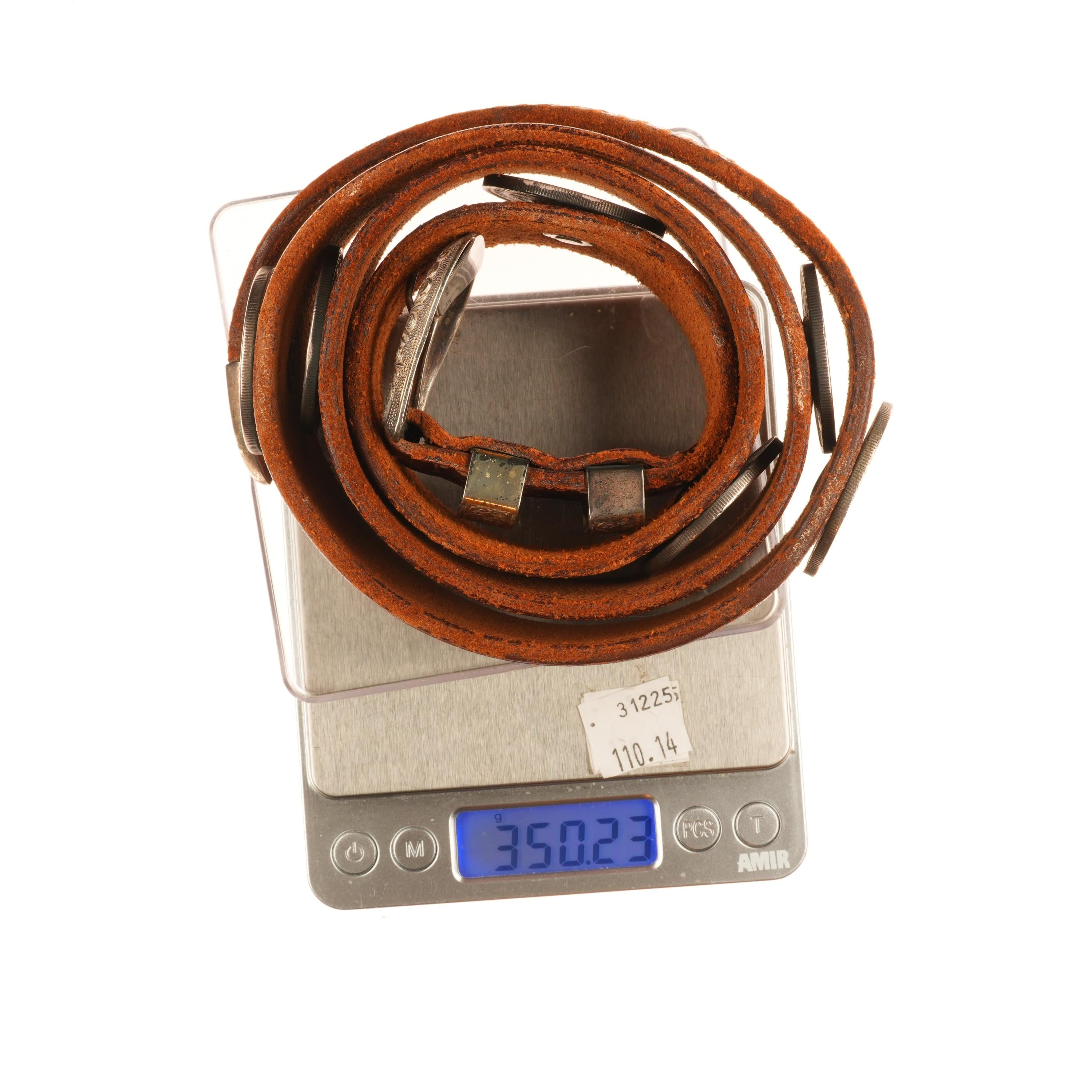 50‘s-60‘s Sterling ranger belt buckle set w/6 90% silver US Dollar coins. Vintage set with some expected wear but no significant issues. Fits up to 3/4" ranger belt. Ranger belts are wider and taper down at the buckle/keepers/tip. Selling the buckle set shown and silver coin conchos, giving the belt for free.