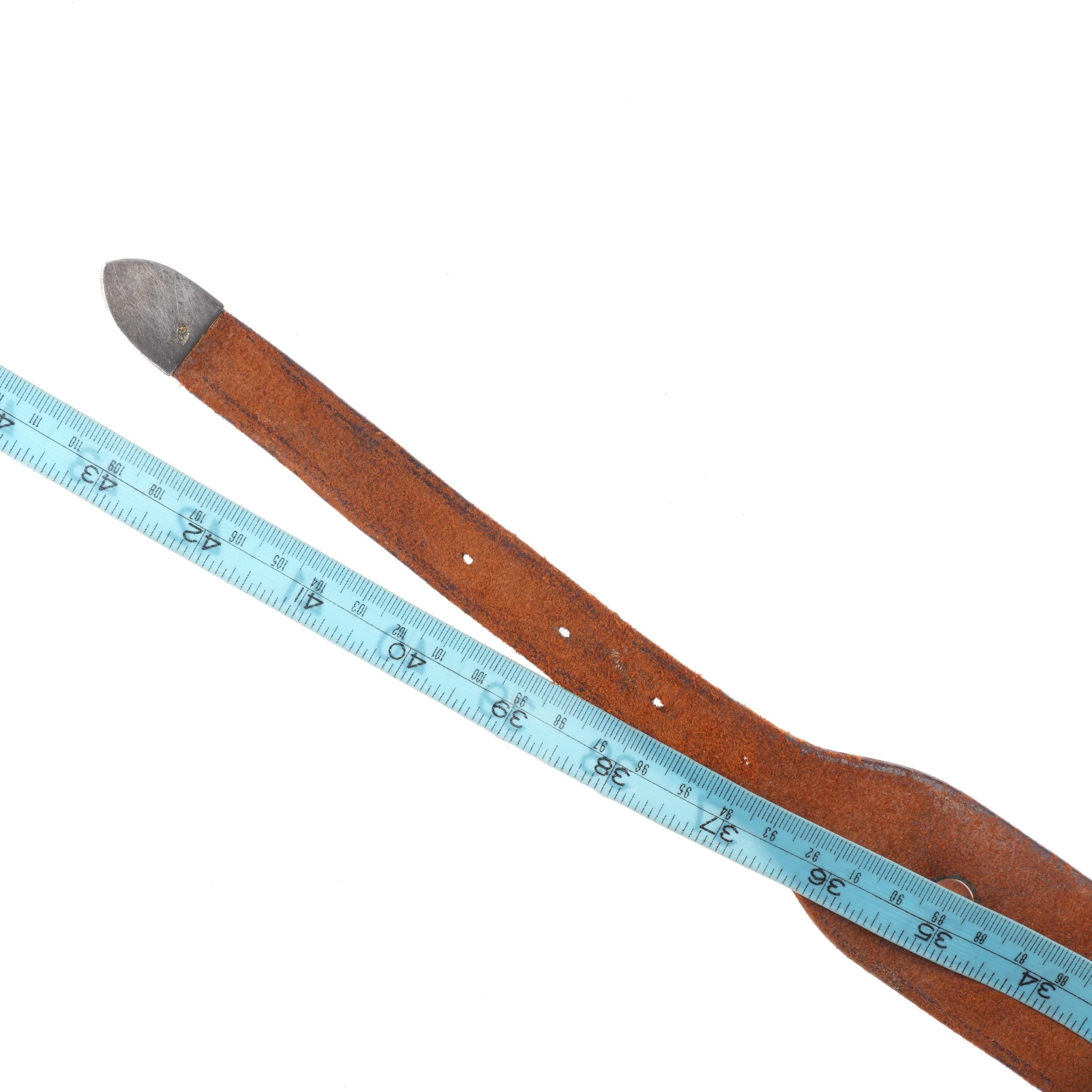 Belt fits up to a 40" waist with existing holes. Hole placements shown on tape measure, Could be cut a little shorter, possibly another hole added. Very cool old belt that seems to have some life left in it if taken care of.