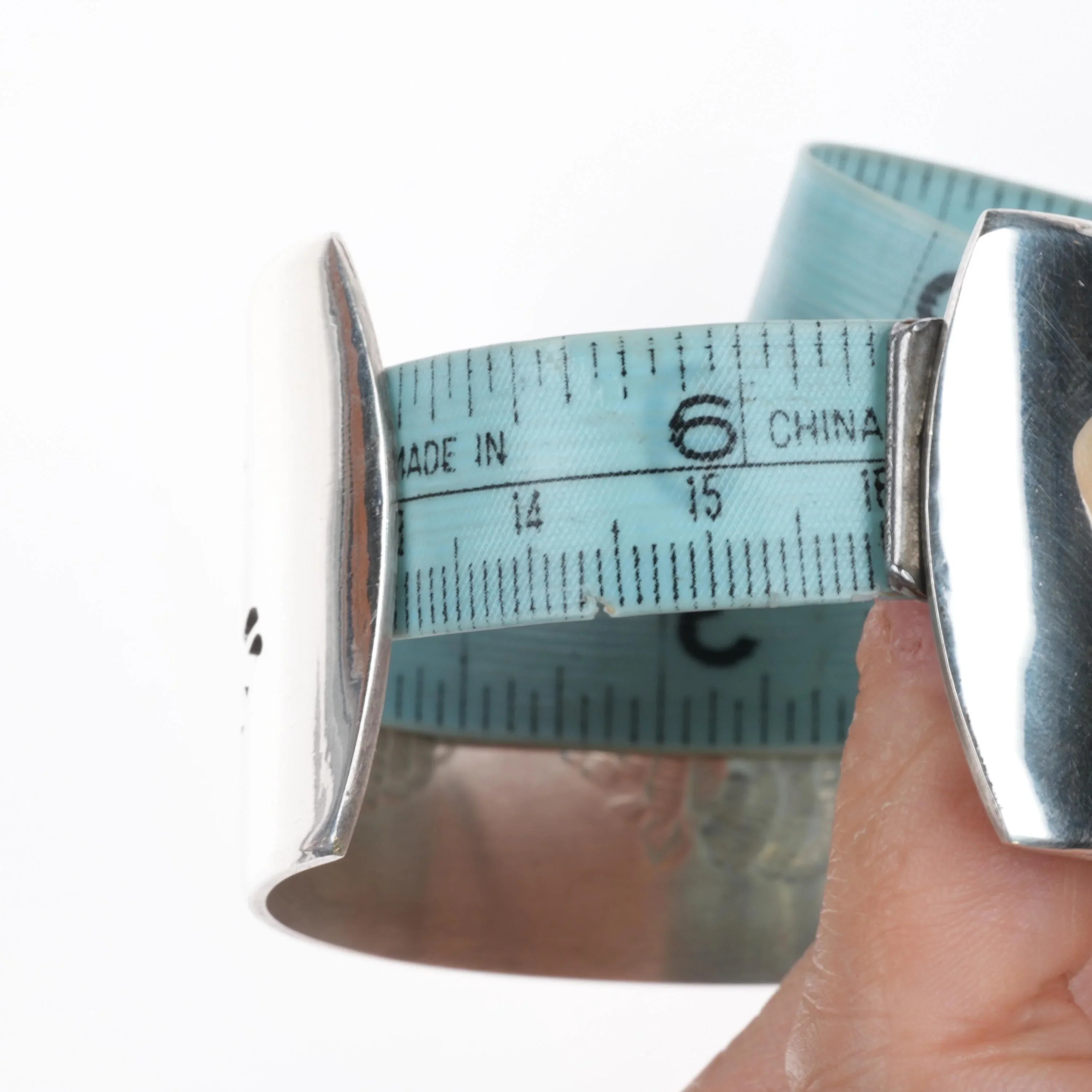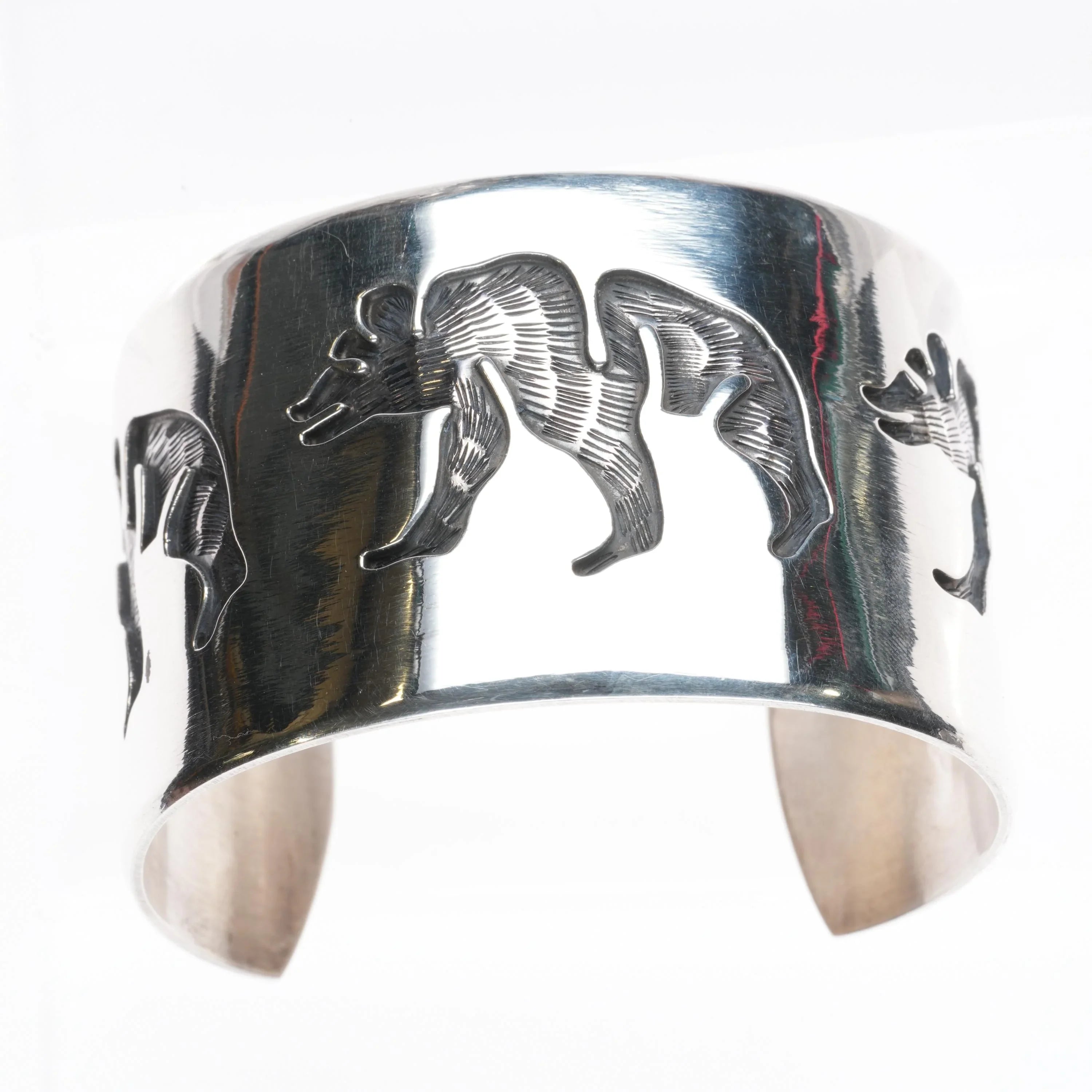 6.25" Andrew Saufkie Hopi Overlay bear pattern cuff bracelet sterling silver. Tested and guaranteed solid sterling silver with the markings shown.. Weight and measurements in pictures. Some expected wear, no cracks or breaks. Circa last quarter of the 20th century.