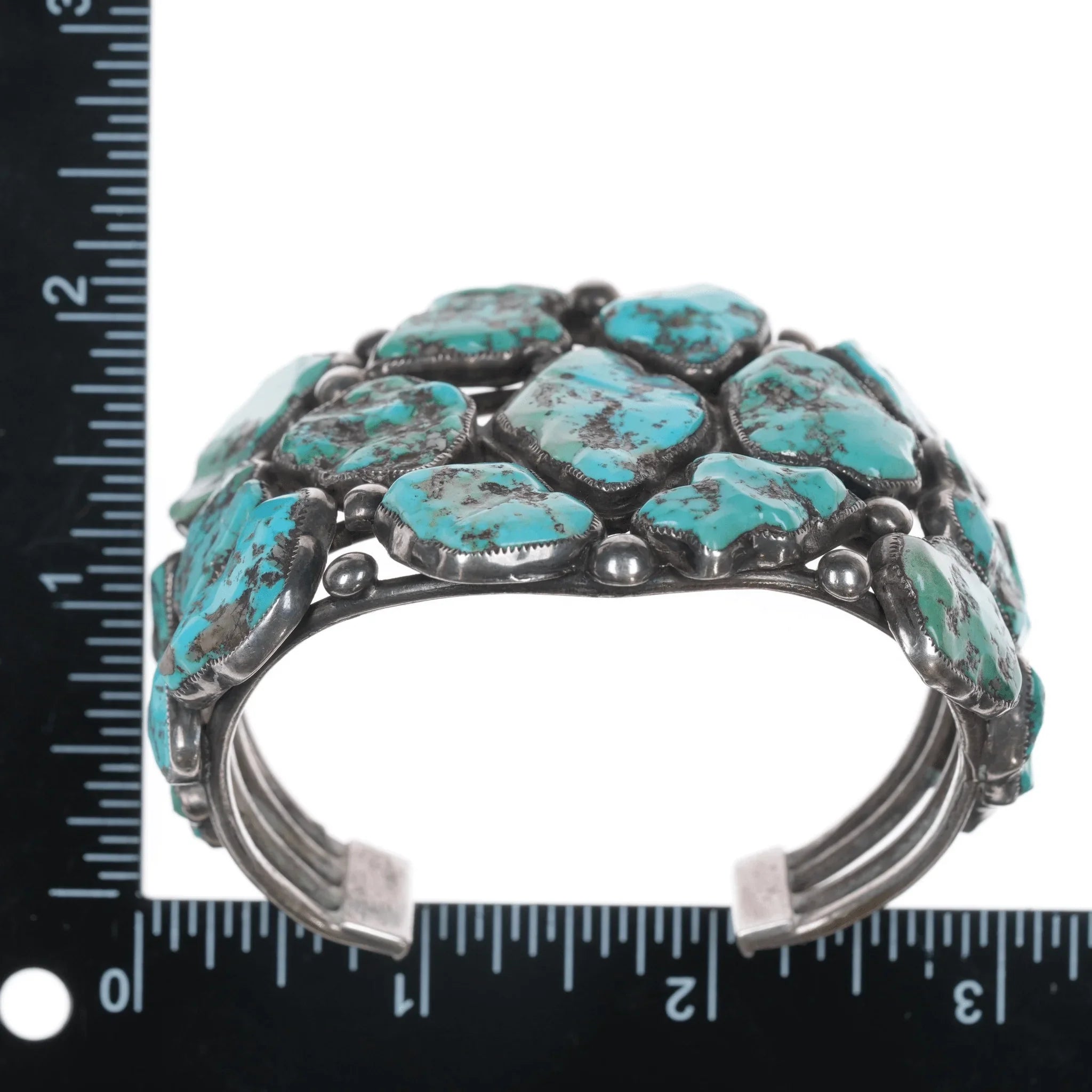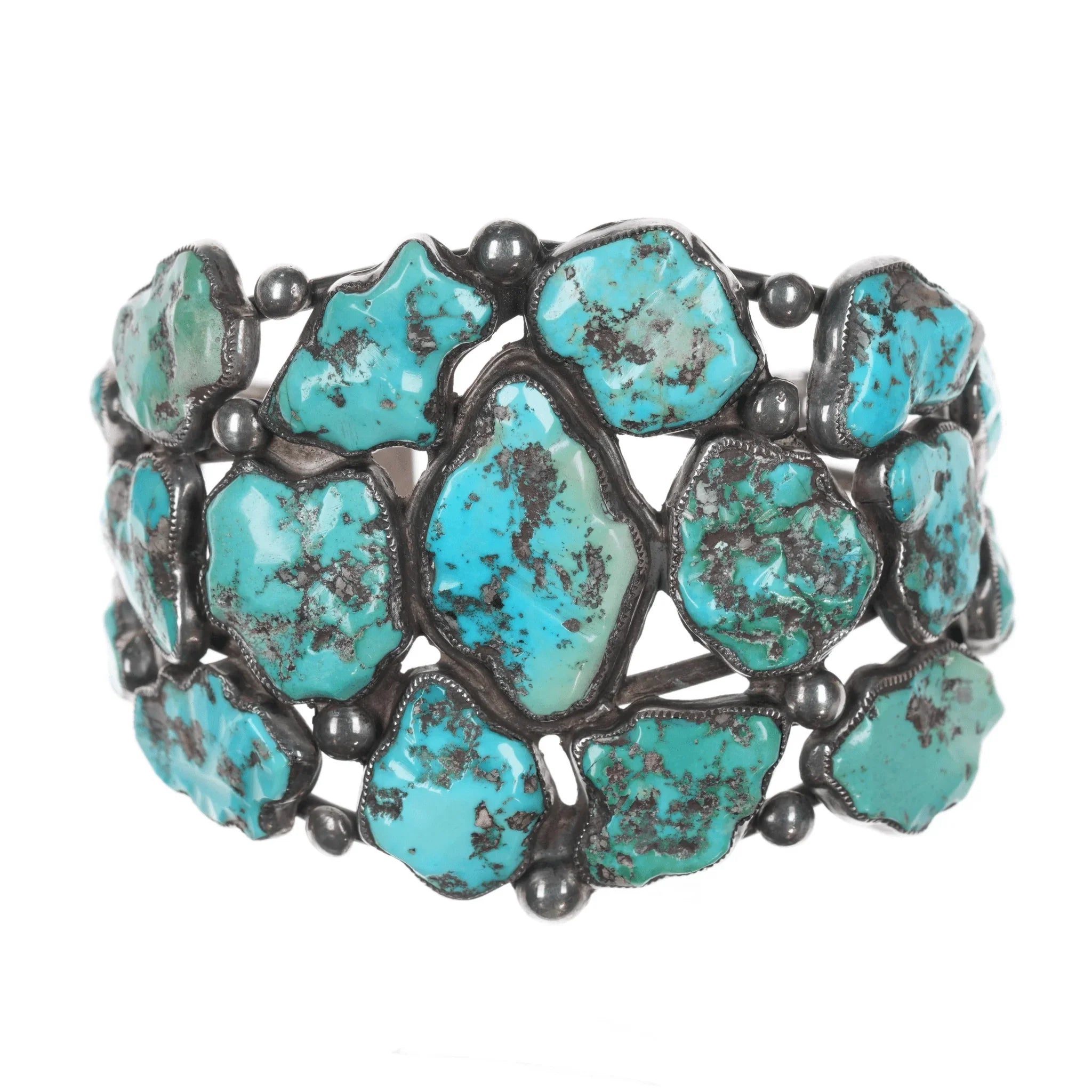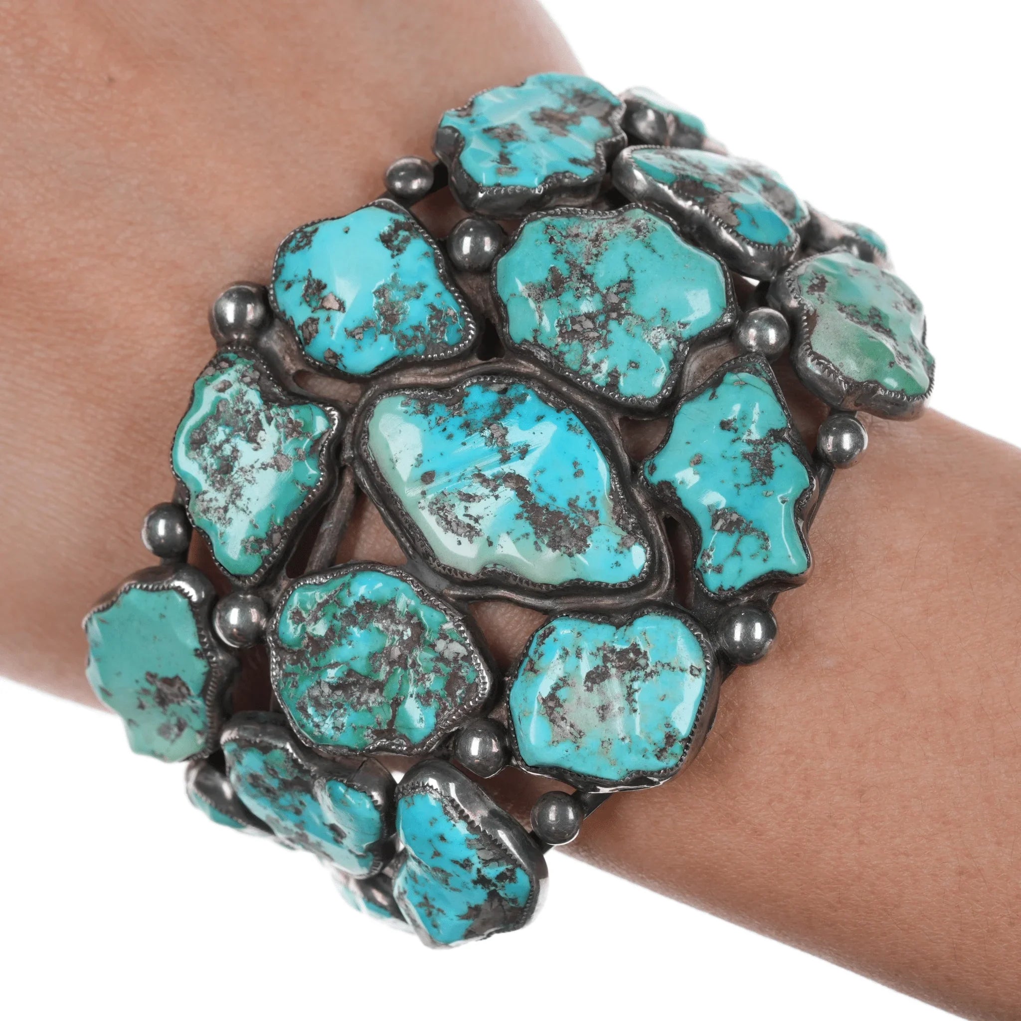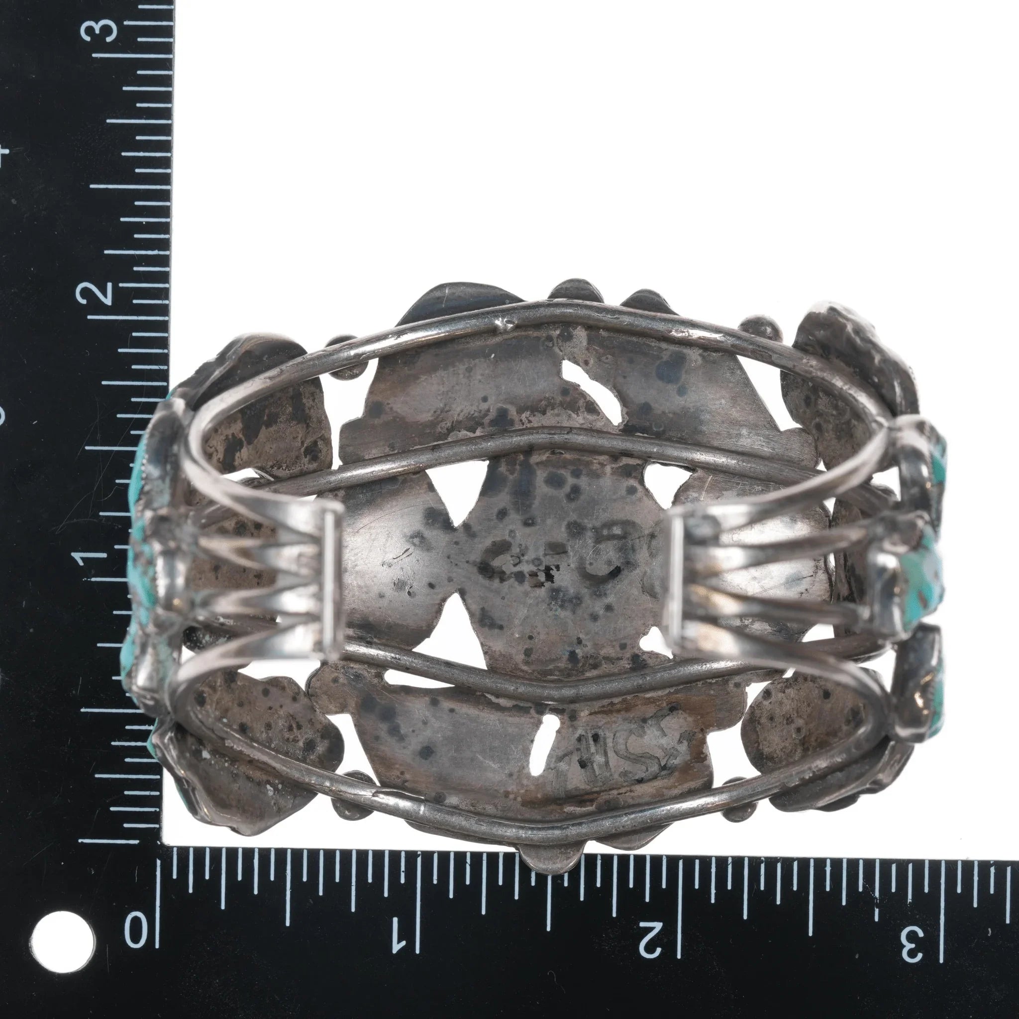 6 5/8" Early Zuni Ingot silver carved turquoise cuff bracelet. Extremely special, one of a kind c1930 hand carved turquoise nuggets. 4 Ingot silver wires with natural cracks going through the silver wires that have been there since this bracelet was made.