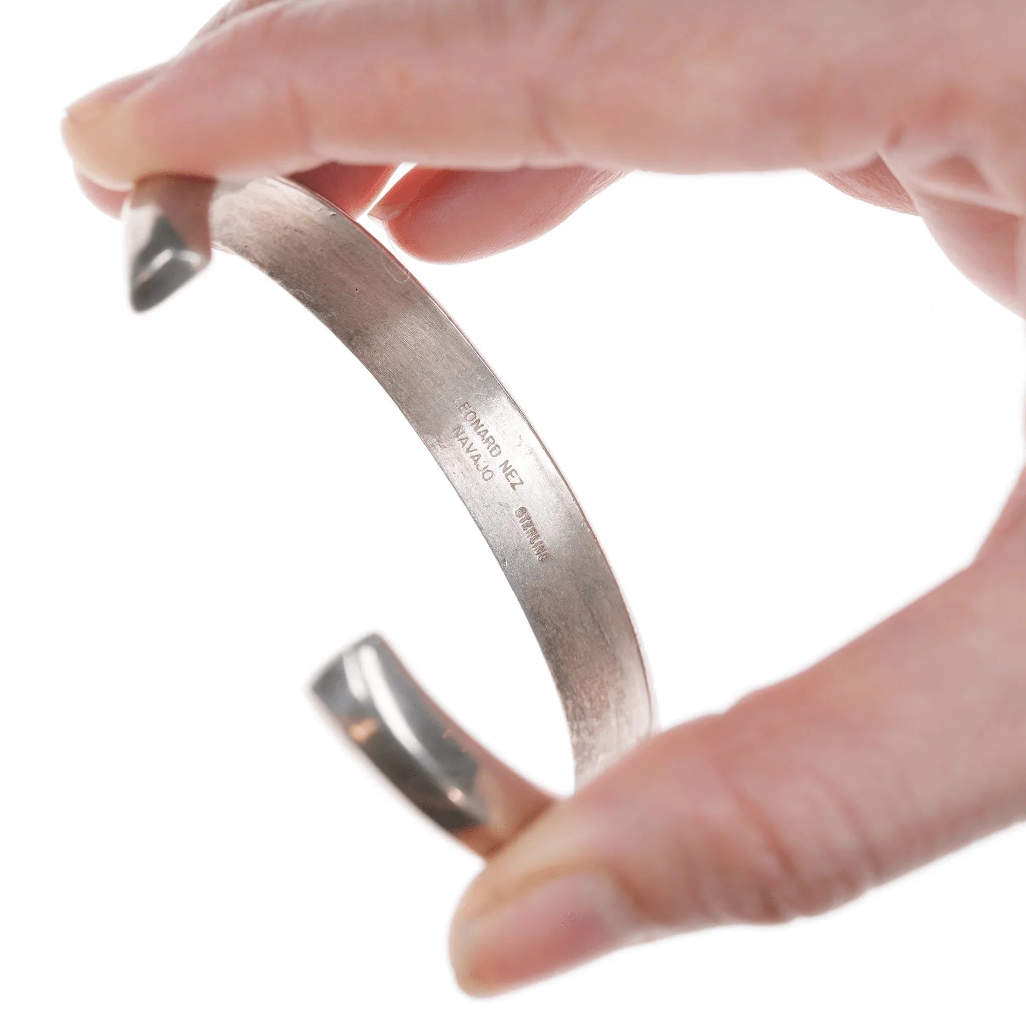 6 5/8" Leonard Nez Navajo Sterling Channel inlay cuff bracelet 3/8" wide in<br>center. Marked or unmarked as shown in pics, weight and other measurements in<br>pics. Sorry but my jewelry is stored in a secure location and connot be accessed<br>for more pictures, videos, or measurements until sold. If you look at<br>pictures/description your question should be answered. Thank you so much for<br>your time and consideration!<br><br>Fine chisel, stamp work and deeply grooved silver overlay are the hallmarks of<br>Leonard Nez’s silver jewelry whose work is featured in the Smithsonian<br>Institute. By combining the elements of the traditional with the contemporary in<br>detailed scrollwork and classic feather styling, Nez’s work is distinct and<br>recognizable.<br>Born in Keams Canon, Arizona, Nez met his wife Marian through his sister. It was<br>Marian, a silversmith in her own right, who first taught Nez jewelry-making. In<br>1977, he made his first pieces and by 1993 he began showing his work. He is<br>consistently the recipient of awards and his work can be found in private<br>collections, which include a silver bowl at the Smithsonian. An avid horseman<br>and highly skilled team roper, he divides his time between his silverwork and<br>the rodeo circuit,<br>He attributes his inspiration to God and says that sometimes design ideas come<br>to him while he is in church. “I want each piece to be better than the last.<br>I do my own designs, the ones that speak to me.”<br><br>All precious metals are tested and guaranteed, any Native American jewelry<br>referred to as Silver or Sterling is guaranteed to be a minimum of 90% (coin)<br>silver and possibly higher content. Anything marked is guaranteed to be what<br>it's marked, most bracelets are photographed on a 6" wrist (non hairy), rings<br>photographed on the appropriate sized finger when possible. With bracelets if<br>the measurement is not given in the description then inside circumference is<br>shown where the metal meets the number on the the cloth tape measure.