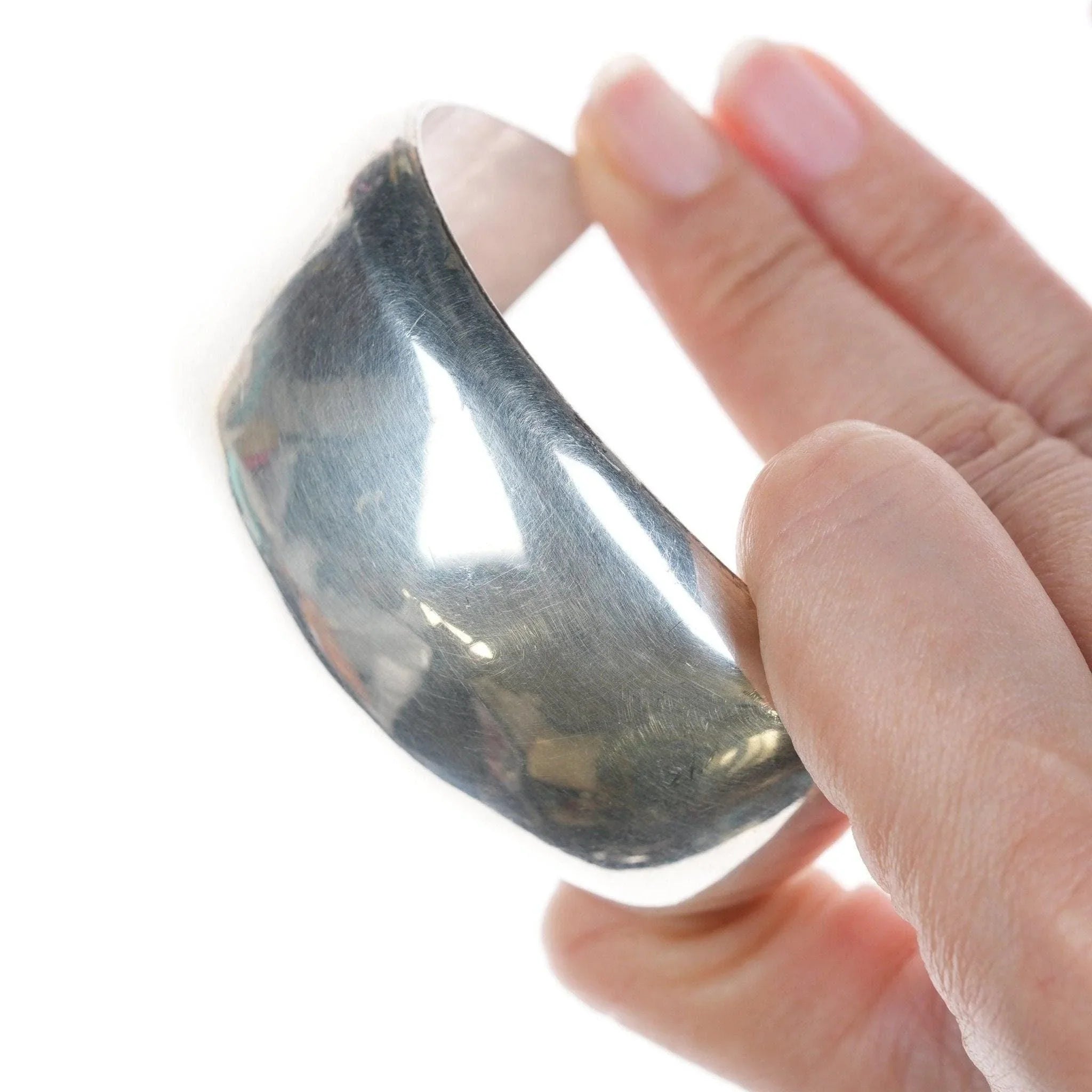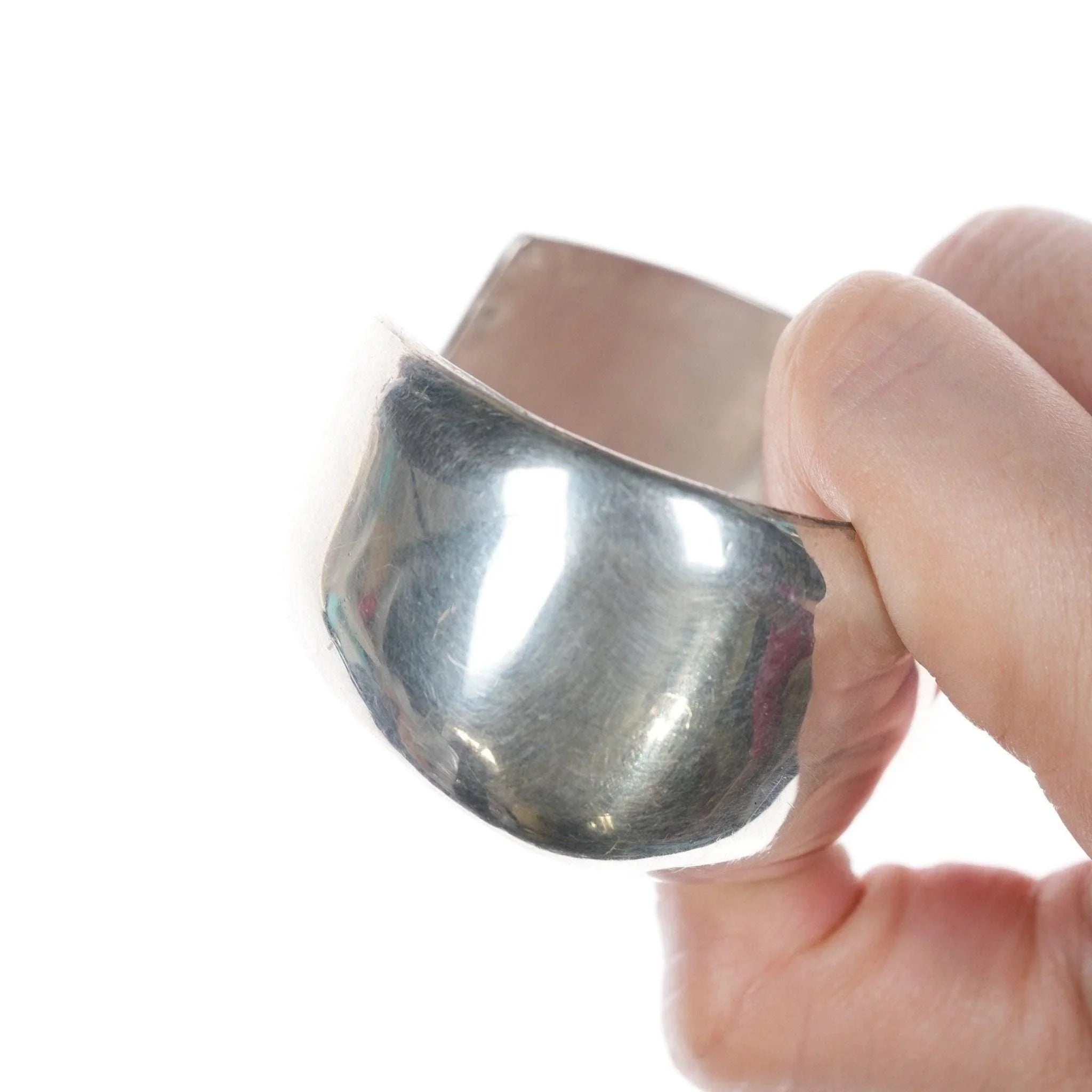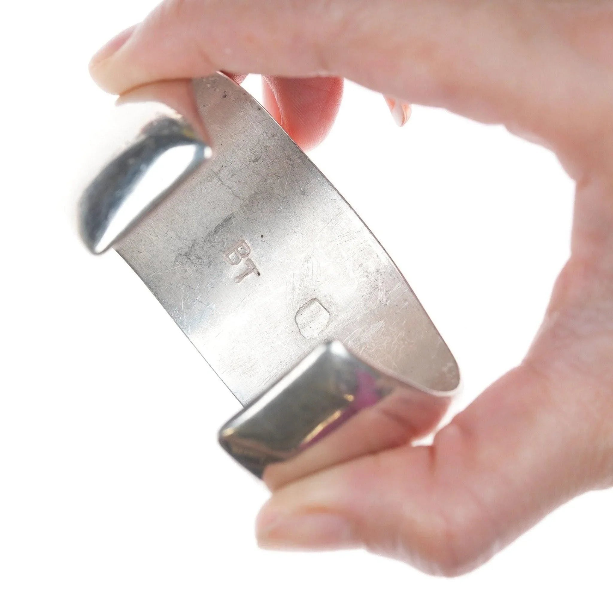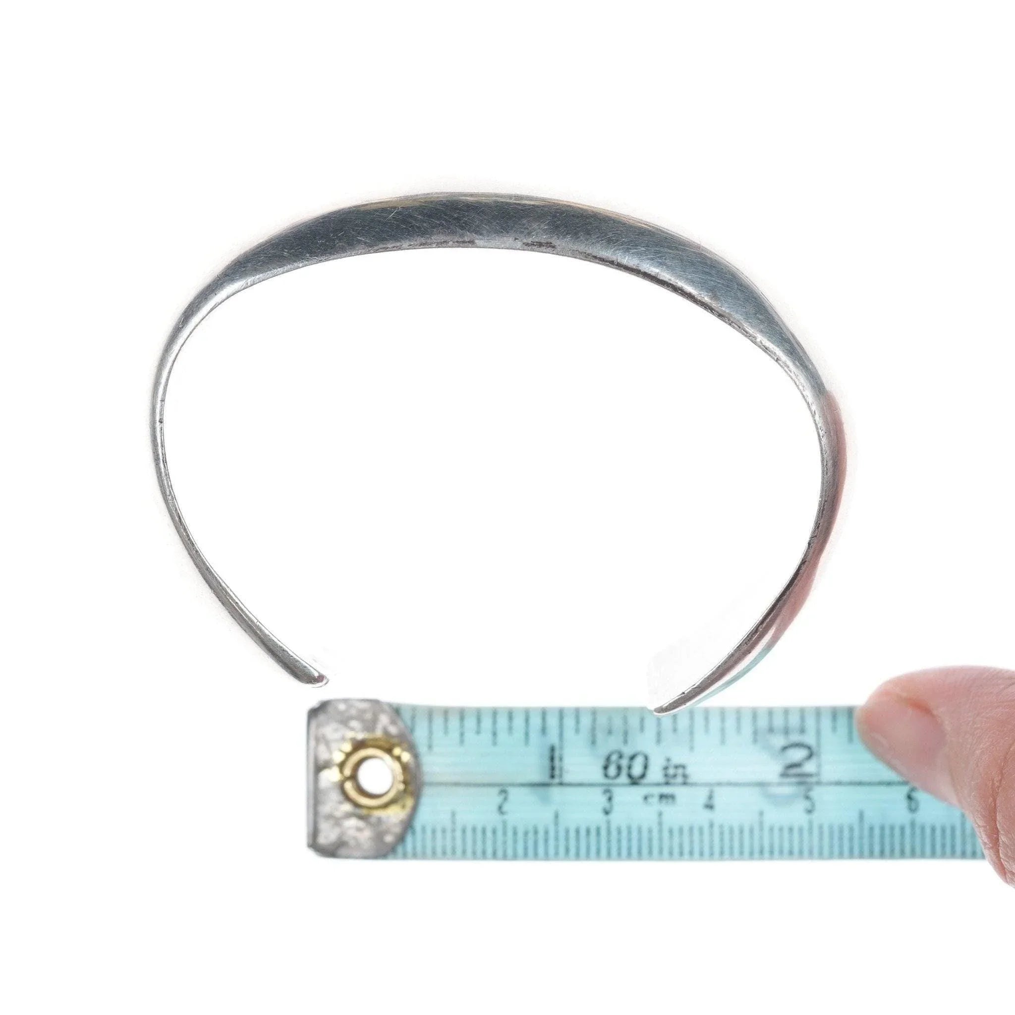 6/5" Vintage Southwestern silver bracelet 34mm wide in center, likely Native<br>American made.<br><br>All precious metals are tested and guaranteed, any Native American jewelry<br>referred to as Silver or Sterling is guaranteed to be a minimum of 90% (coin)<br>silver and possibly higher content. Anything marked is guaranteed to be what<br>it's marked, most bracelets are photographed on a 6" wrist (non hairy), rings<br>photographed on the appropriate sized finger when possible. With bracelets if<br>the measurement is not given in the description then inside circumference is<br>shown where the metal meets the number on the the cloth tape measure.