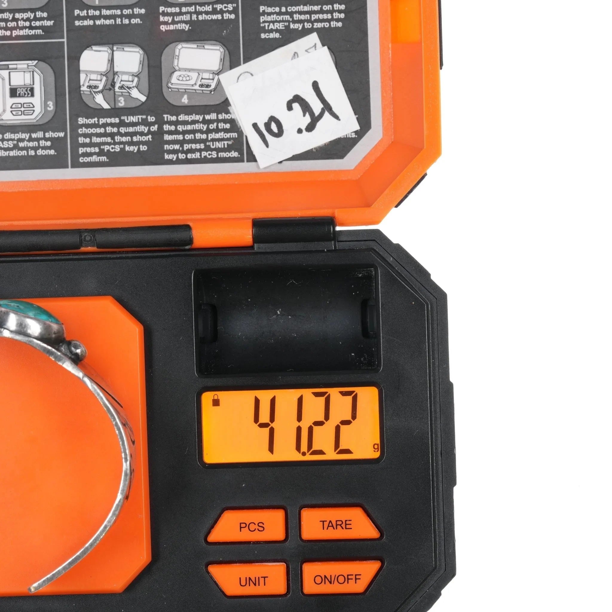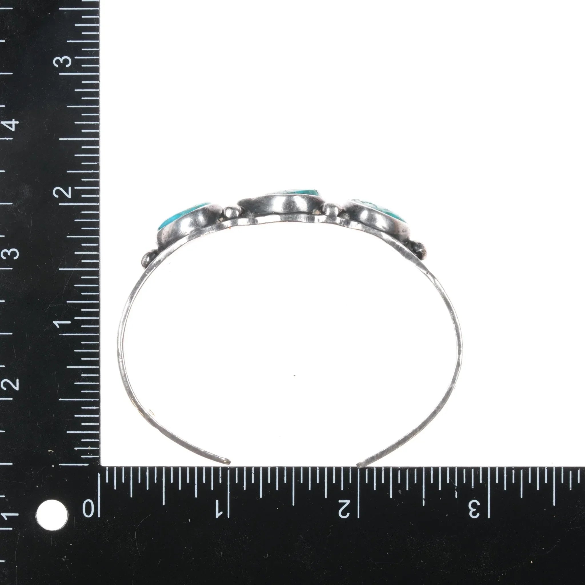 6.75" 40‘s-50‘s Navajo silver cuff bracelet with 3 turquoise. Weight and measurements in pics. Unmarked as typical of this era (mid 20th century).