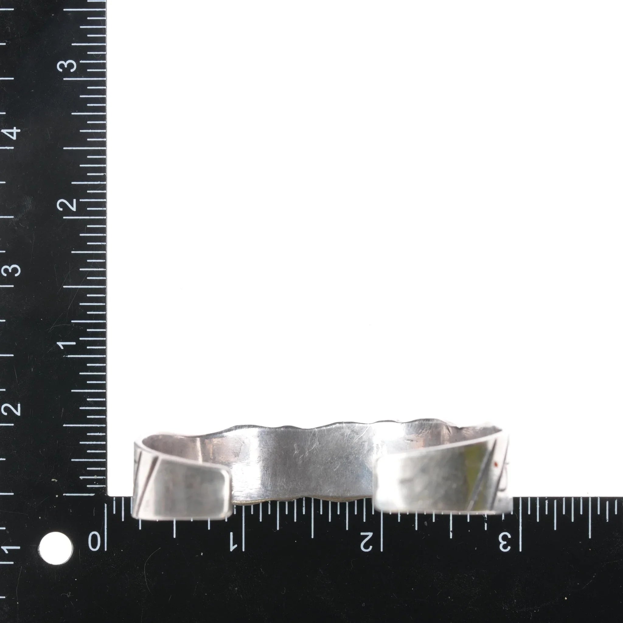 All precious metals are tested and guaranteed. A Native American jewelry piece referred to as "silver" or "ingot" is guaranteed to be at least 90% silver. I rarely use the word "sterling" when referring to older Native American silver or really any older silver jewelry as silver contents vary and "sterling" is 92.5% silver. No older jewelry is going to be exactly 92.5% silver, some a little over, some a little under. It wasn‘t an exact thing with handmade jewelry. I‘ve seen thousands of pieces xrf‘d to prove this. Bracelets are photographed on a 6" women‘s wrist.