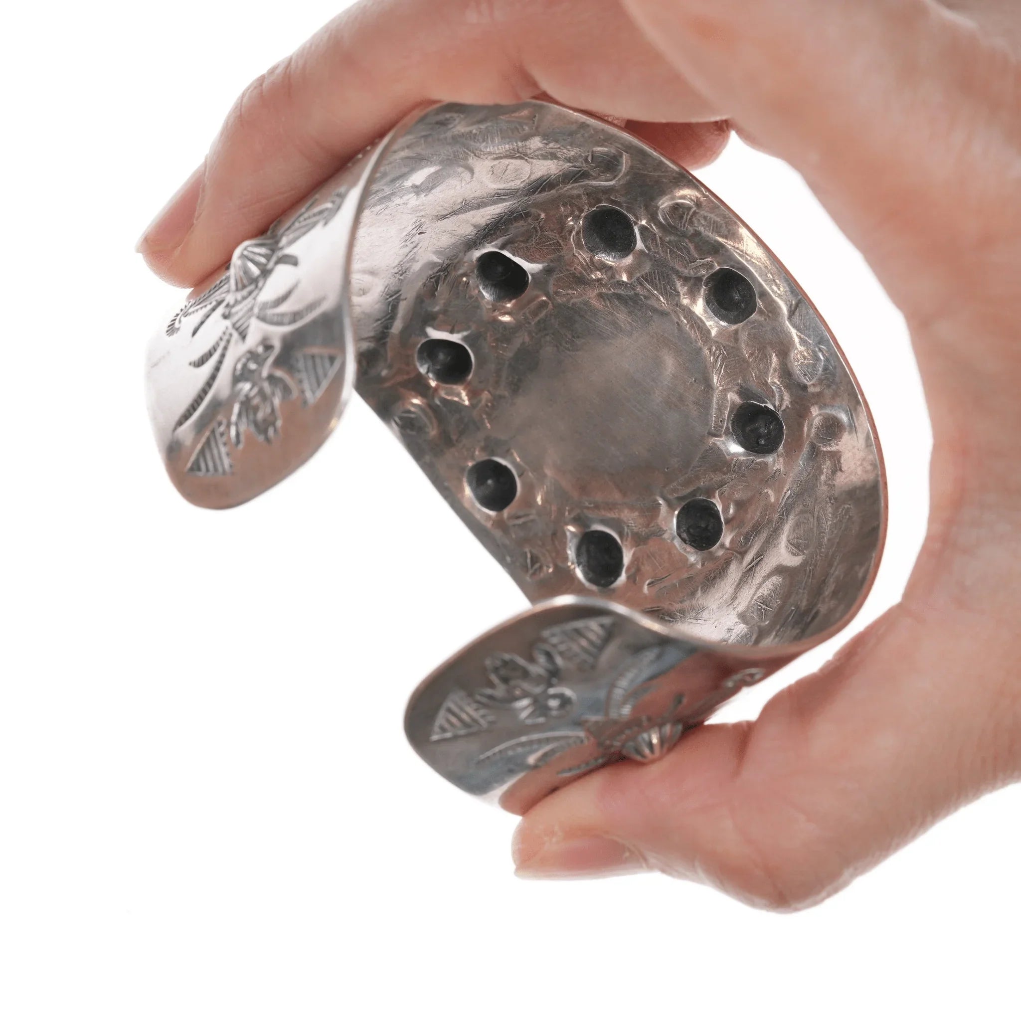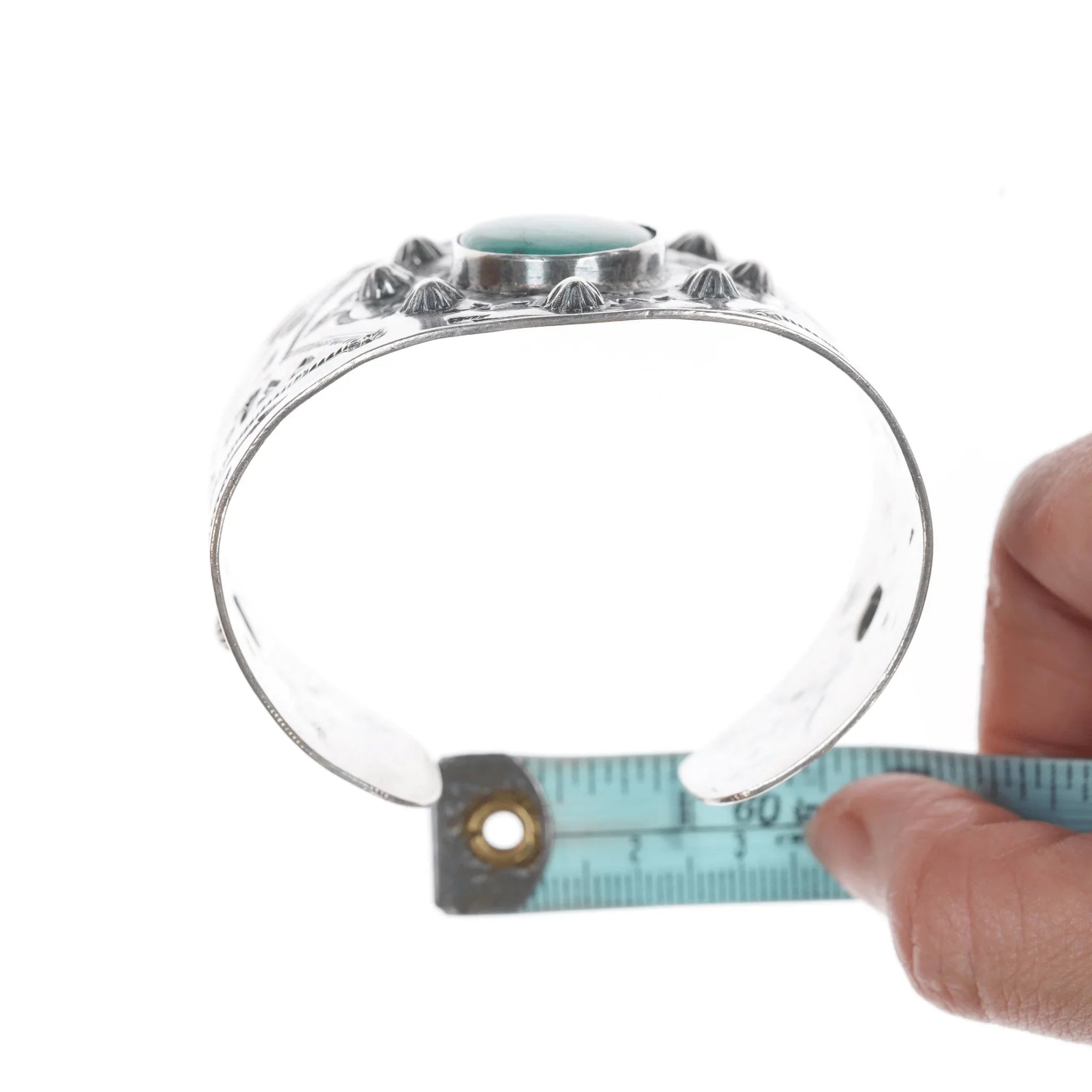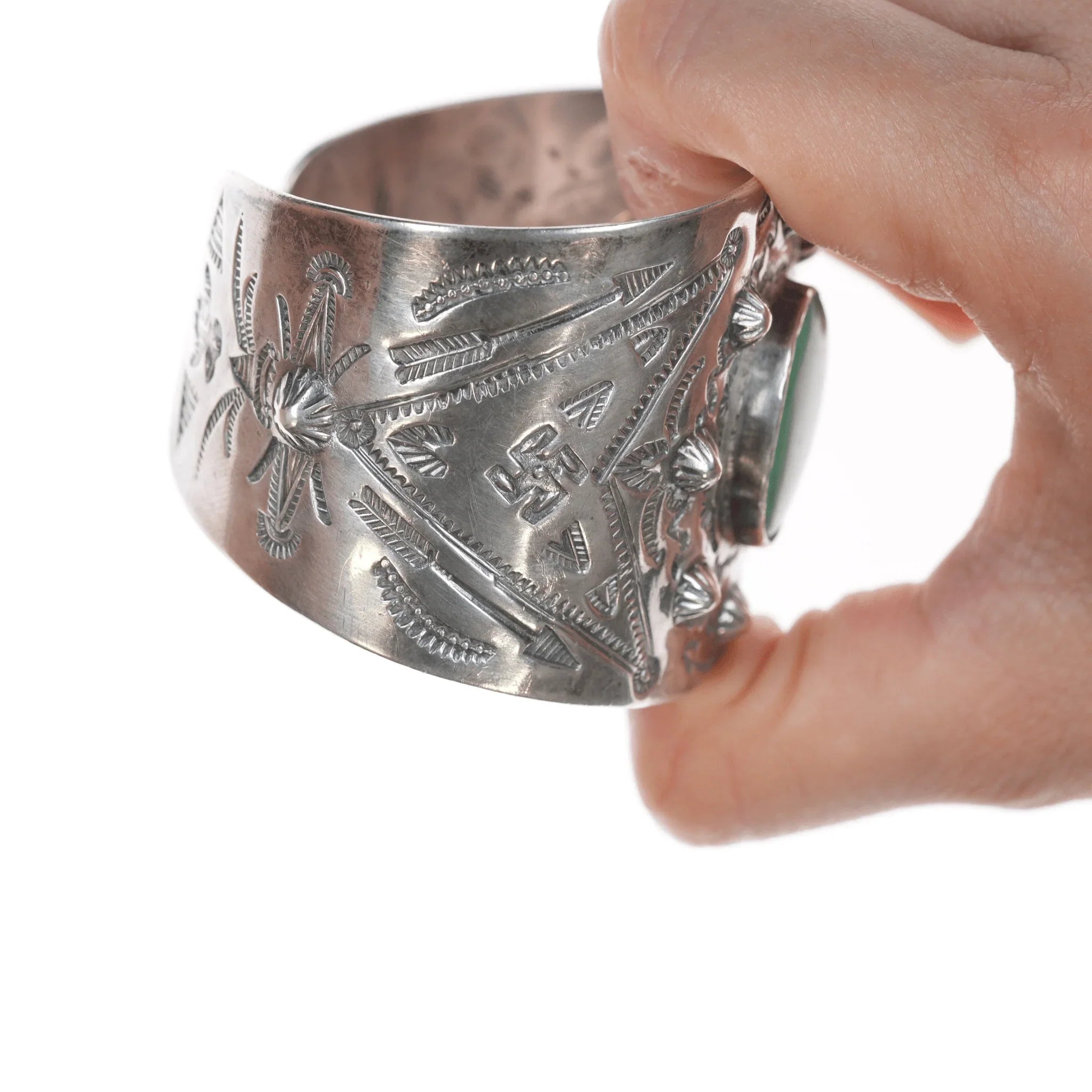 6.75" c1930's Navajo Curio whirling logs cuff bracelet with turquoise. Very substantial, old, hand tooled/stamped Navajo Fred Harvey type cuff bracelet.<br><br> Marked or unmarked as shown in pics, weight and other measurements in pics. Sorry but my jewelry is stored in a secure location and cannot be accessed for more pictures,<br>videos, or measurements until sold. If you look at pictures/description your<br>question should be answered. Thank you so much for your time and consideration!<br><br>All precious metals are tested and guaranteed. A Native American jewelry piece referred to as "silver" or "ingot" is guaranteed to be at least 90% silver. Bracelets are photographed on a 6" women's wrist.