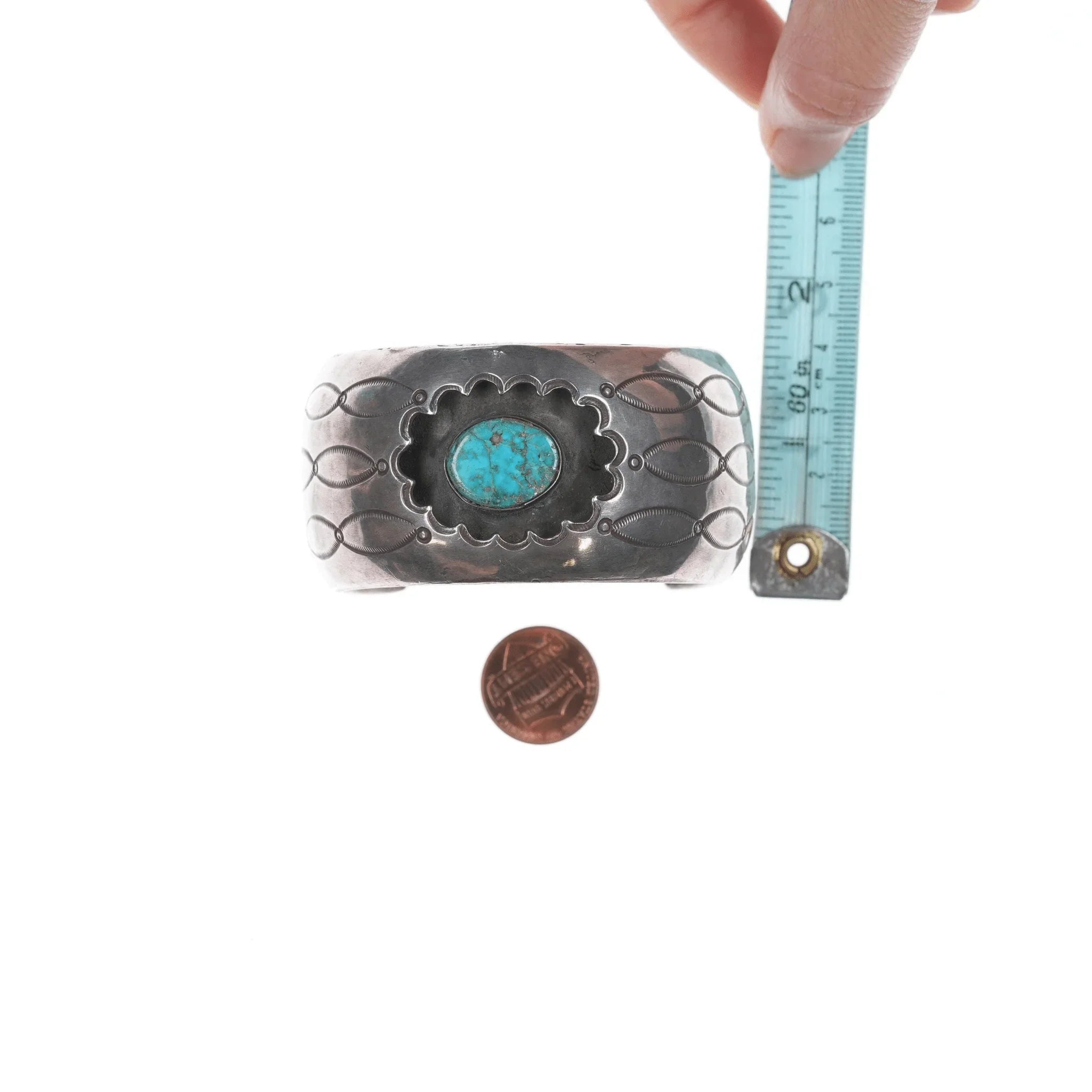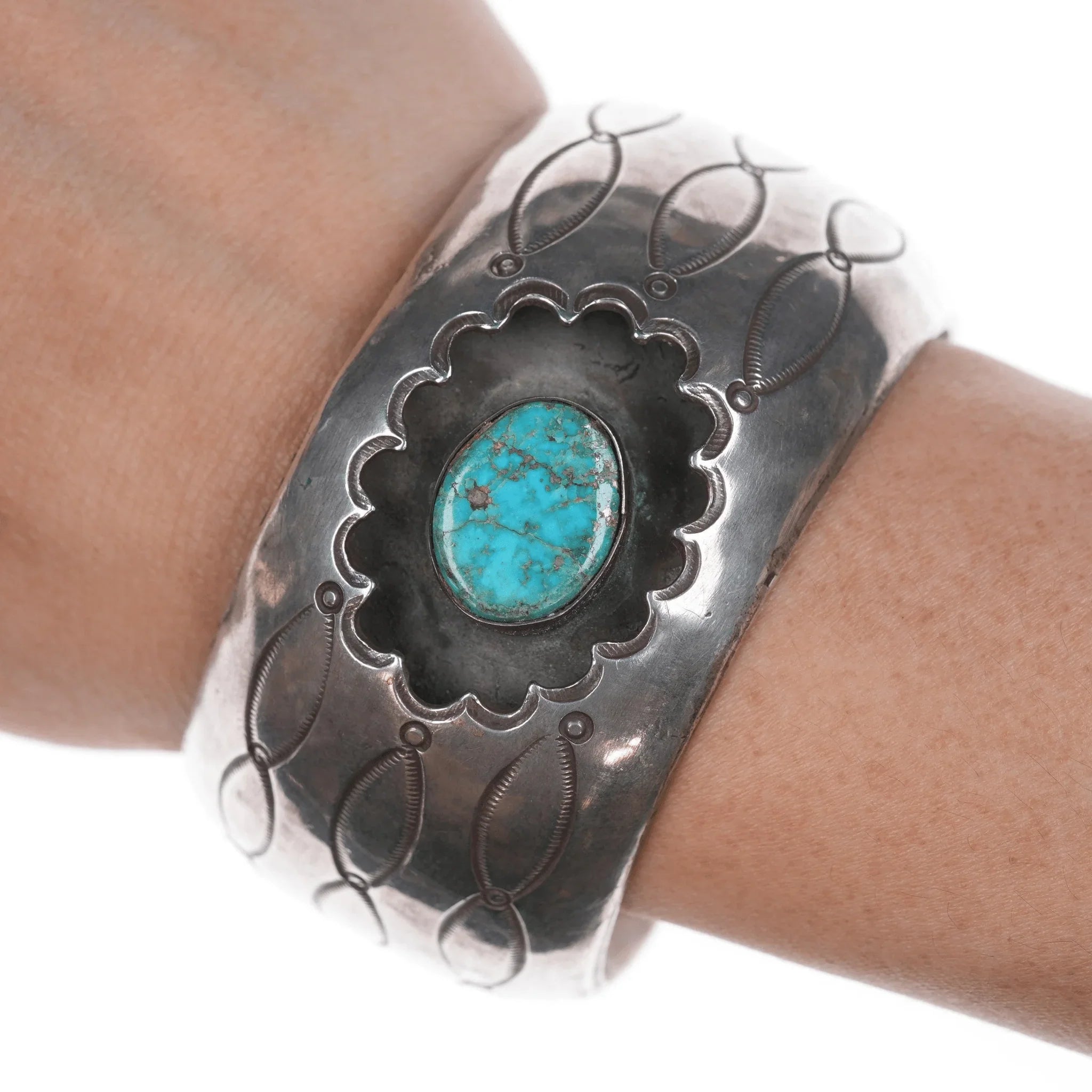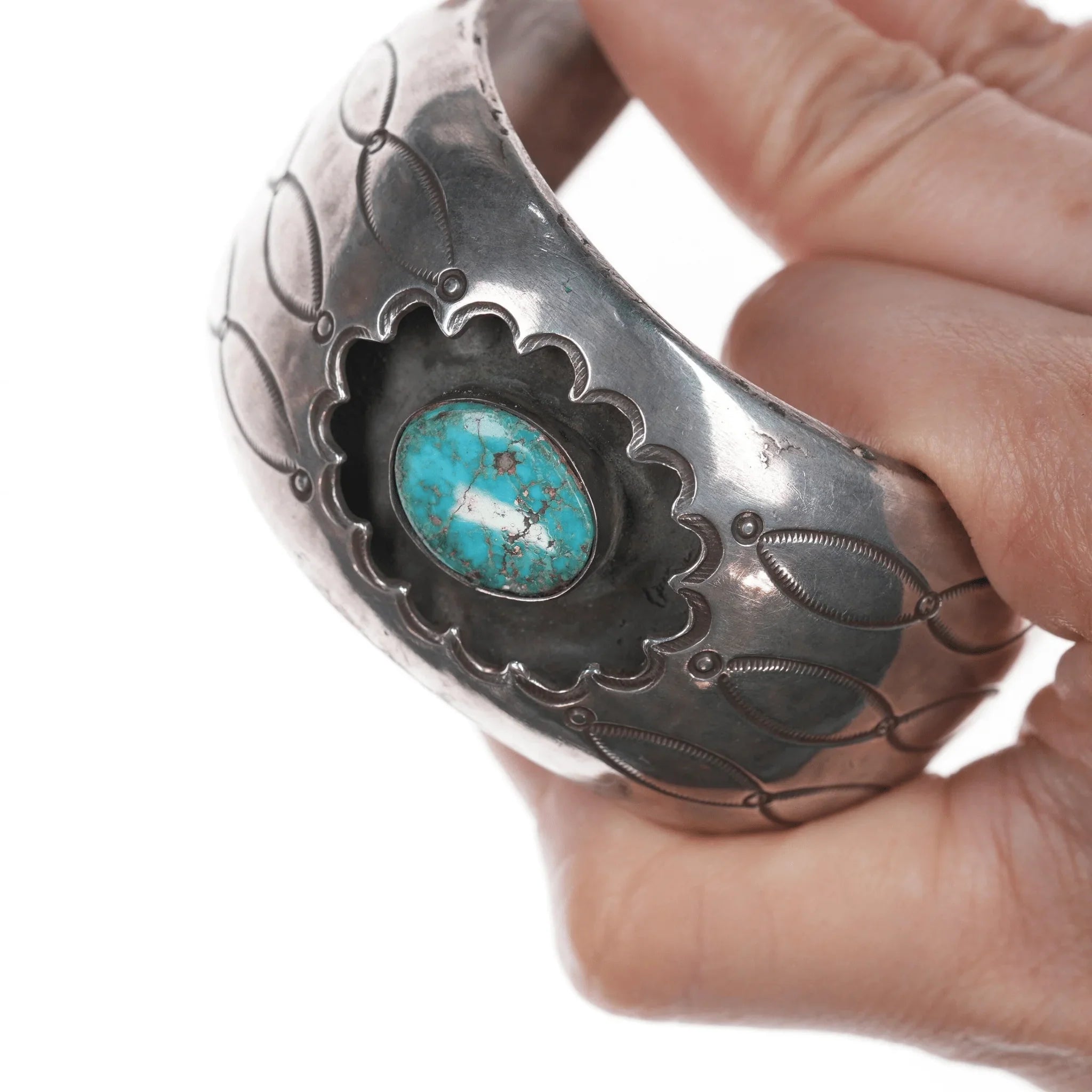 Gelang manset Vintage Native American Silver Shadowbox 6,75" dengan warna pirus, lebih tua, contoh yang dibuat dengan sangat baik dengan pirus yang bagus. Saya tidak yakin apakah stiker lama di dalamnya akurat.