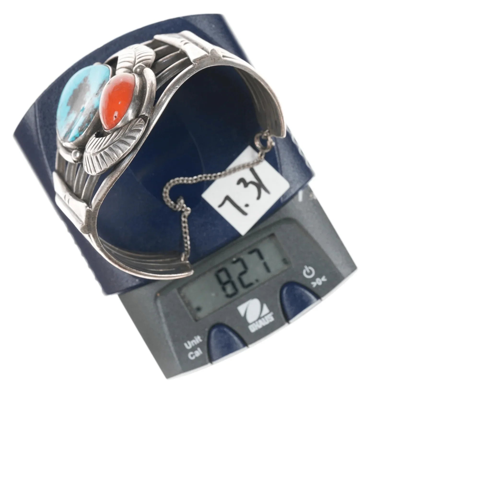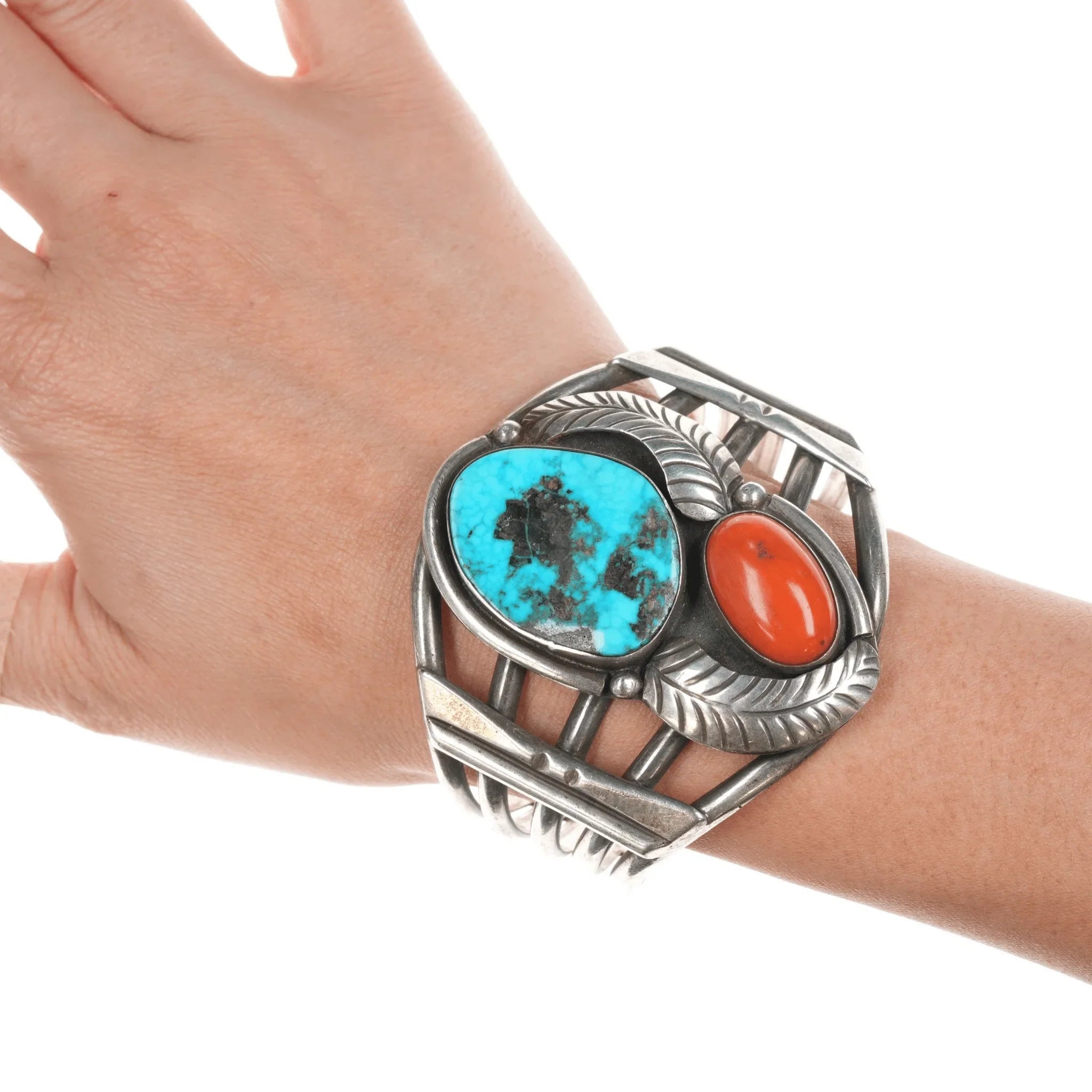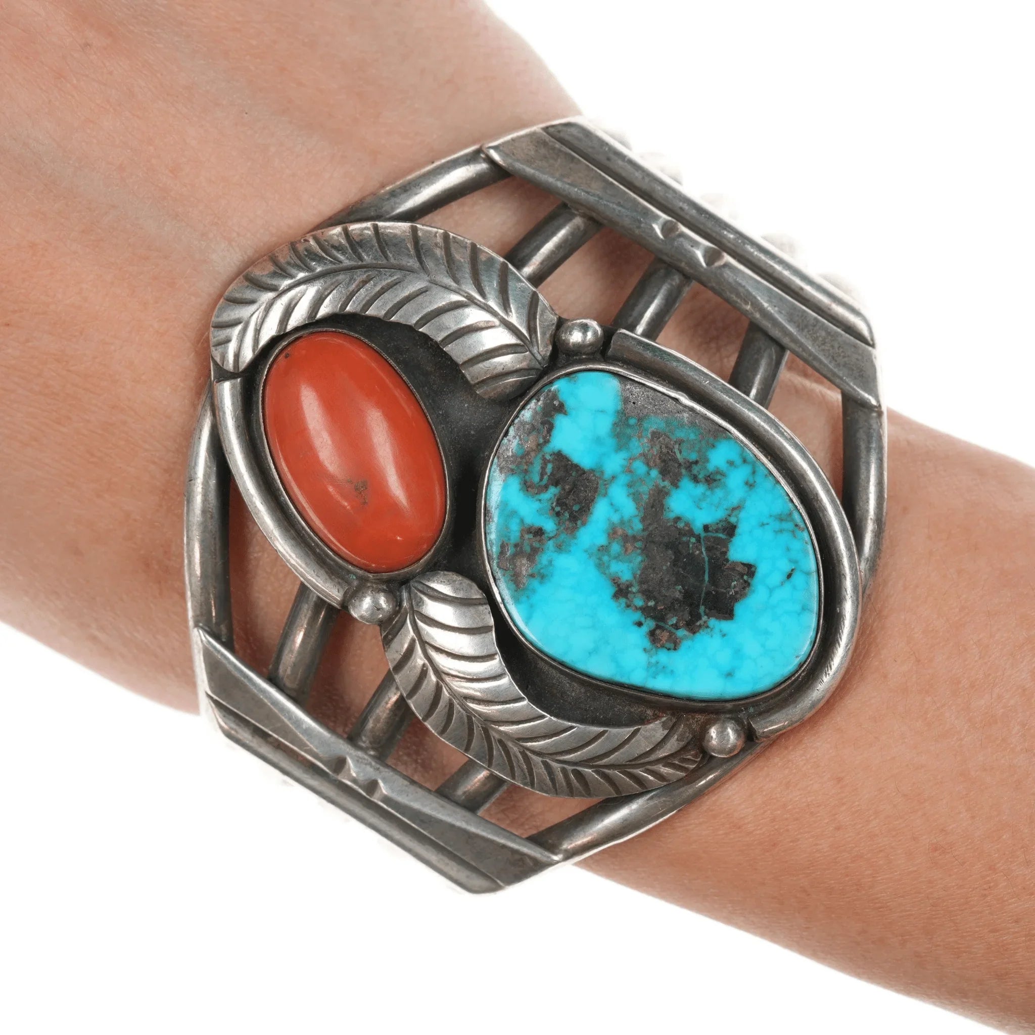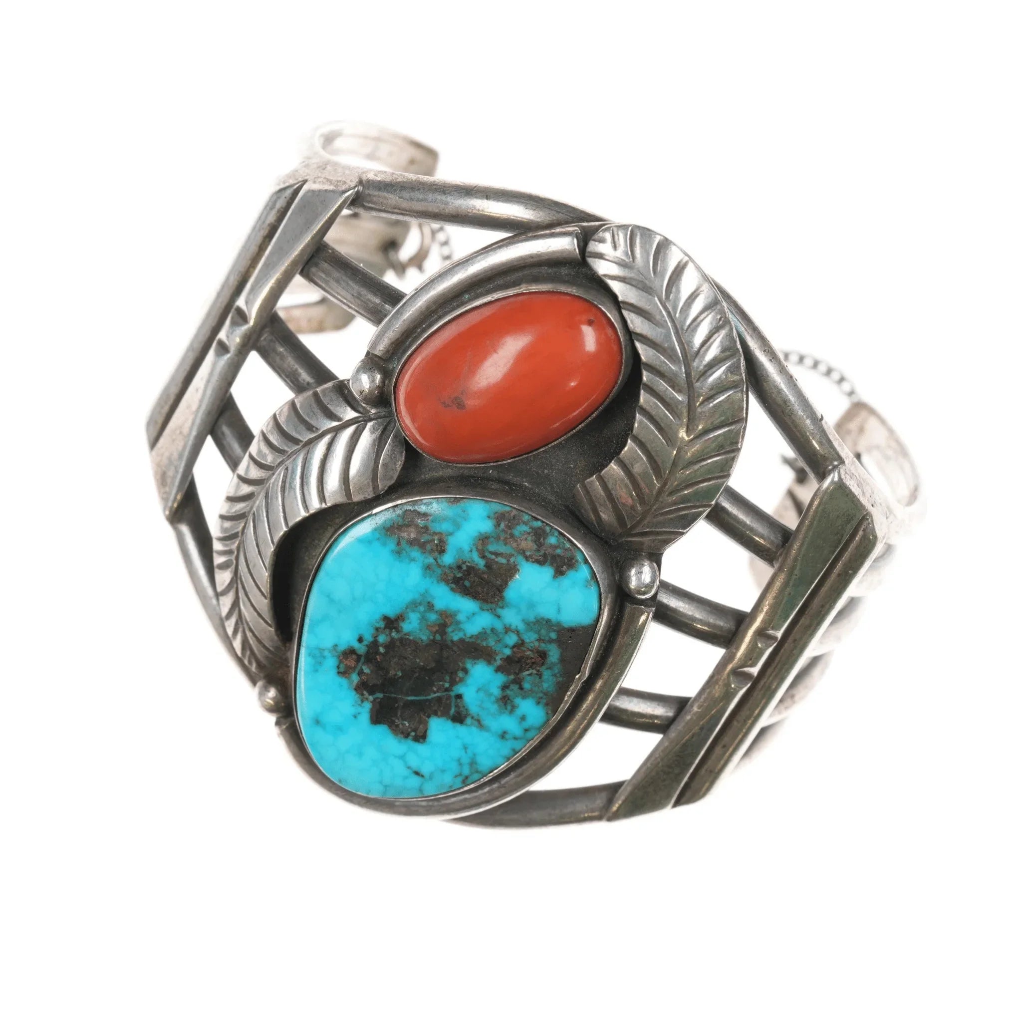 6.75" Large 60's-70's Navajo Silver, turquoise, and coral cuff bracelet.