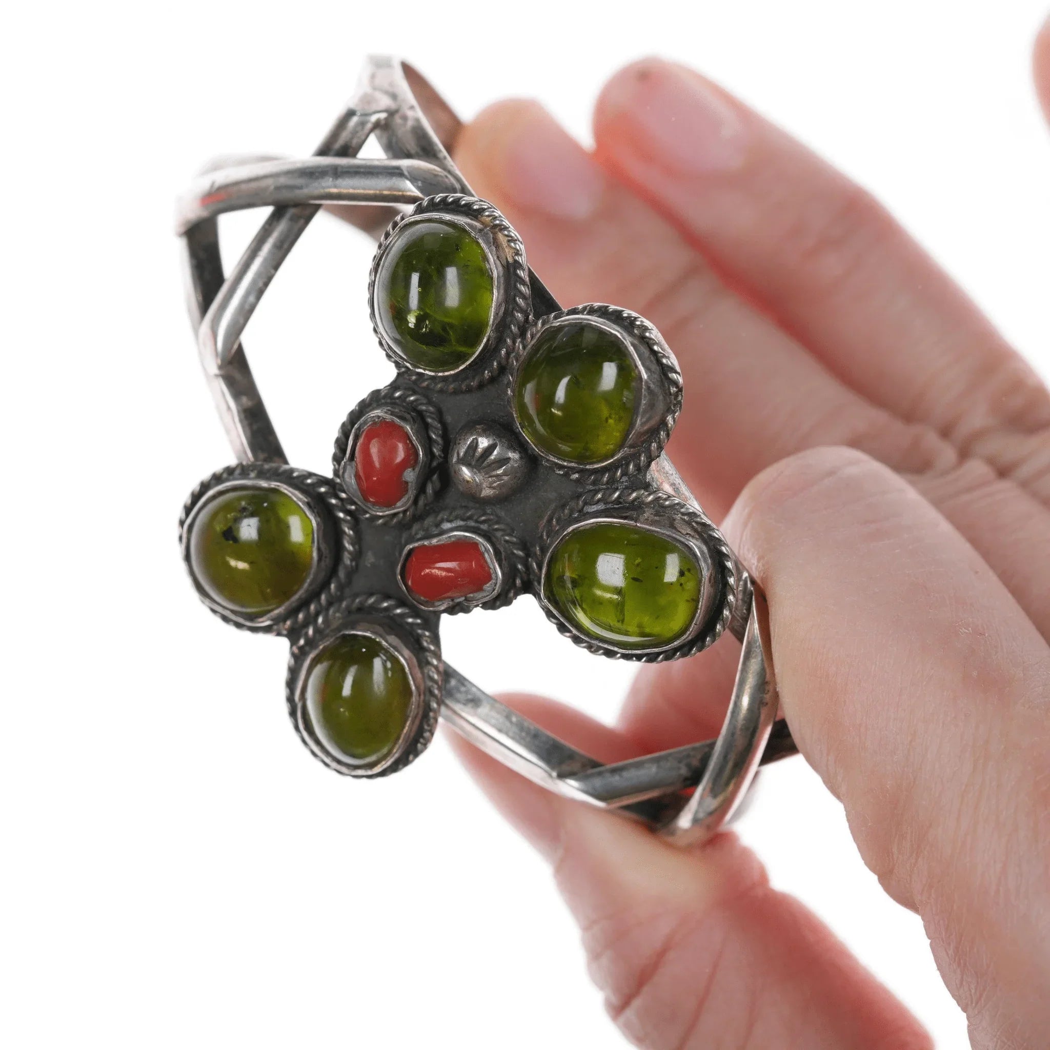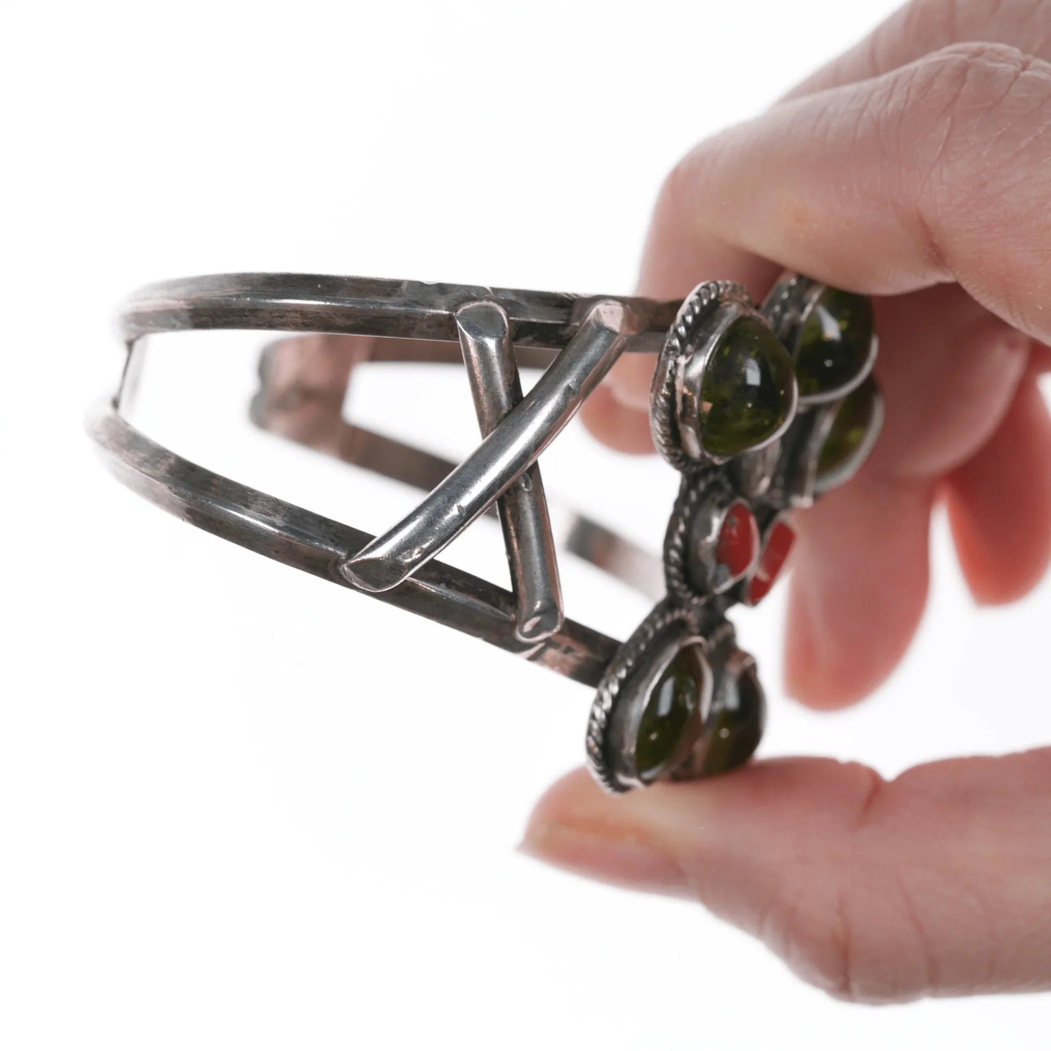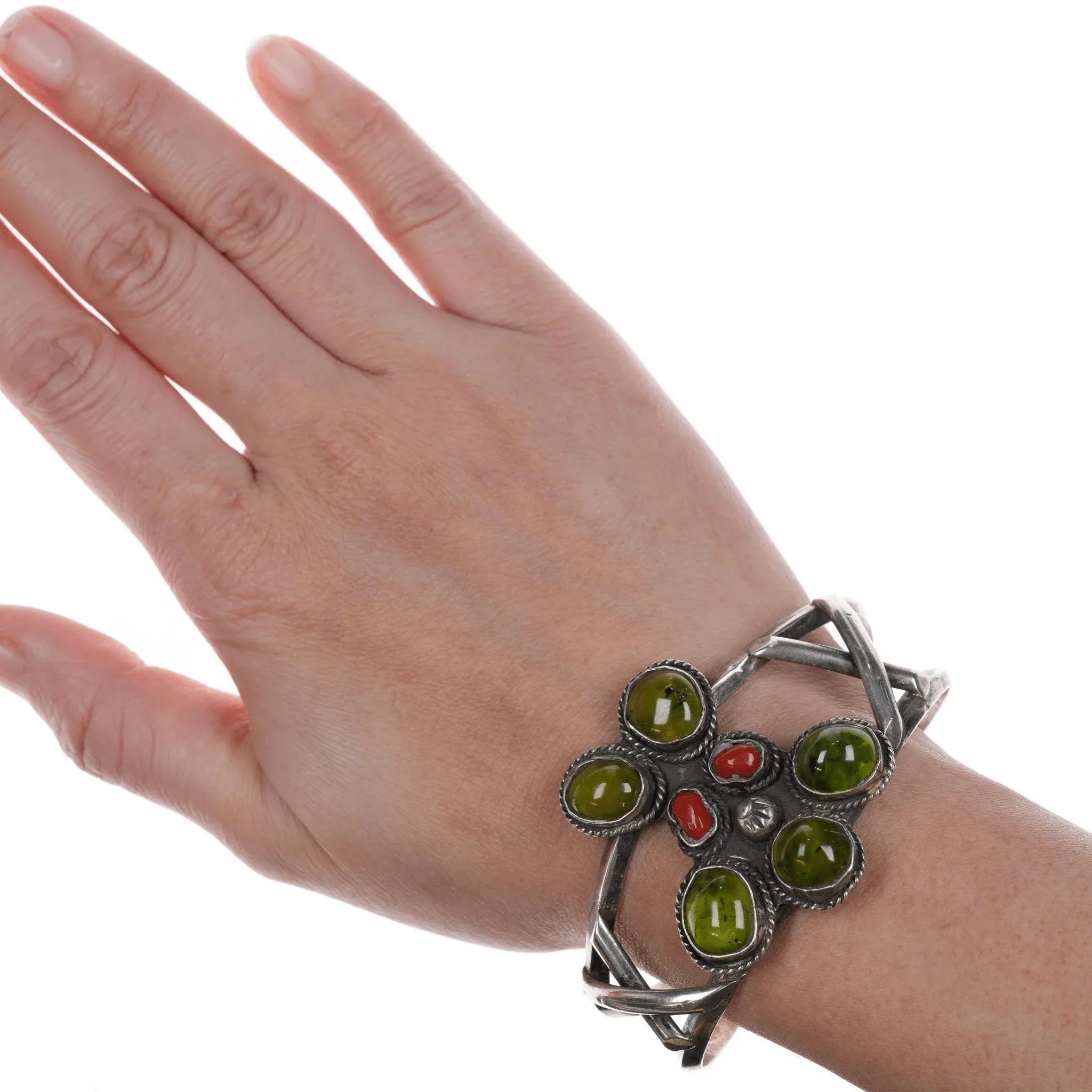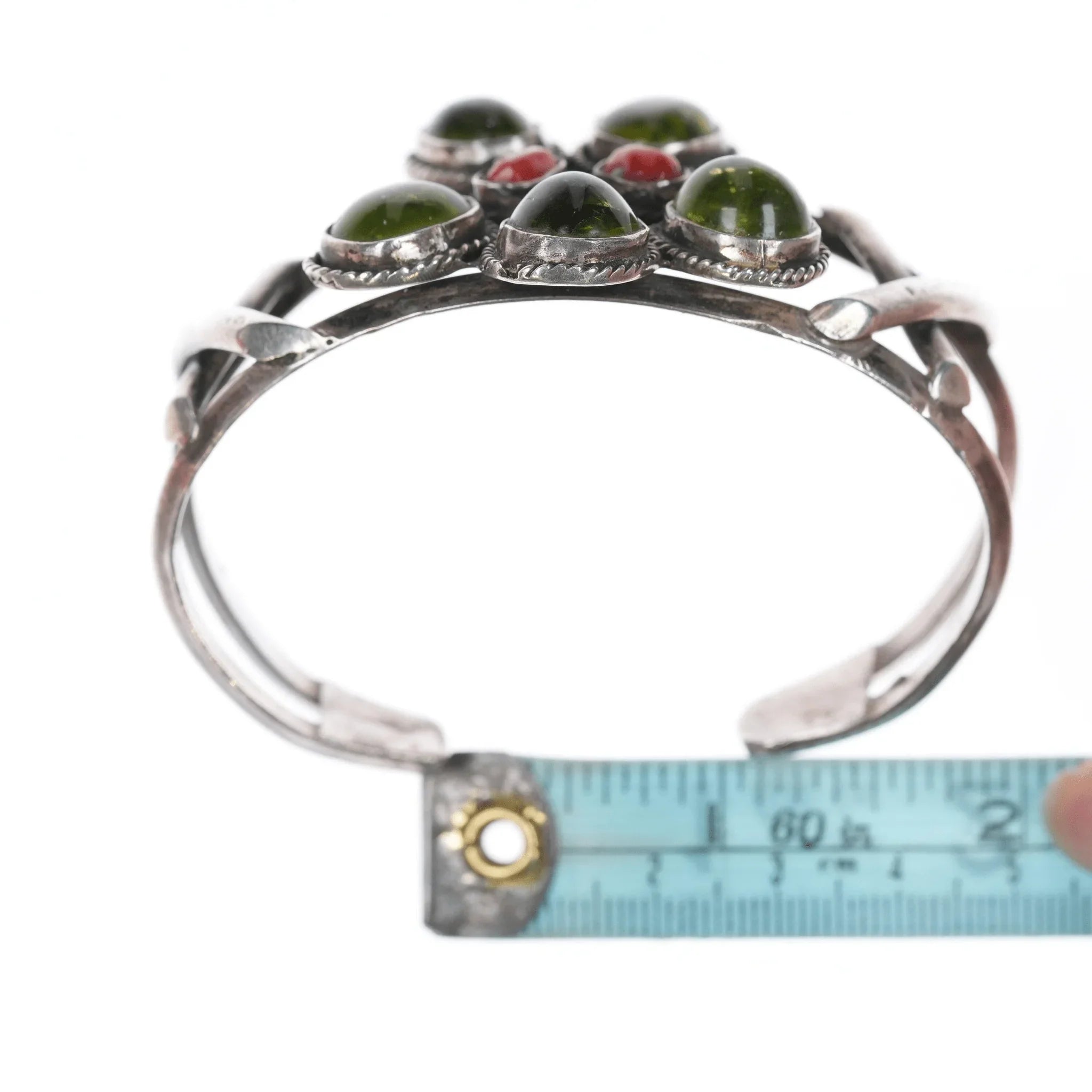6.75" m Southwestern Sterling Green stone and coral cuff bracelet 48mm wide in<br>center, weight and other measurements in pics, one green stone with stable<br>fracture, coral pieces look a little small for bezels, possibly replacements,<br>unmarked or marked as shown. If a mark isn't shown then it isn't marked which is<br>common with pre 1970's Native American jewelry that isn't from one of the larger<br>trading posts.<br><br>All precious metals are tested and guaranteed, any Native American jewelry<br>referred to as Silver or Sterling is guaranteed to be a minimum of 90% (coin)<br>silver and possibly higher content. Anything marked is guaranteed to be what<br>it's marked, most bracelets are photographed on a 6" wrist (non hairy), rings<br>photographed on the appropriate sized finger when possible. With bracelets if<br>the measurement is not given in the description then inside circumference is<br>shown where the metal meets the number on the the cloth tape measure.
