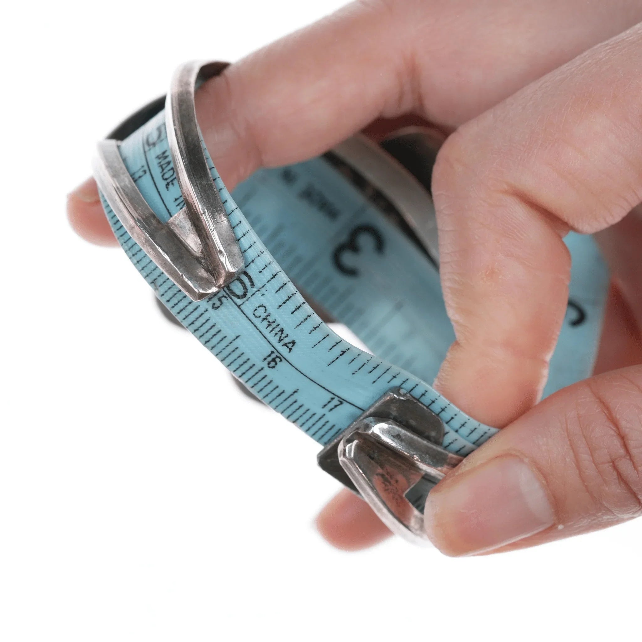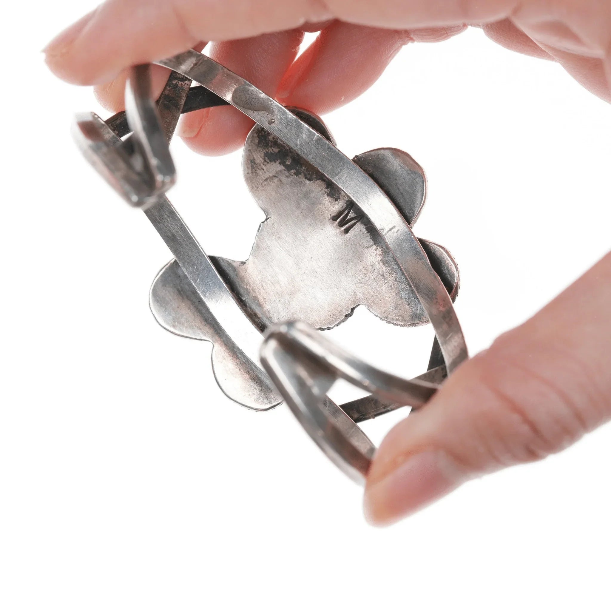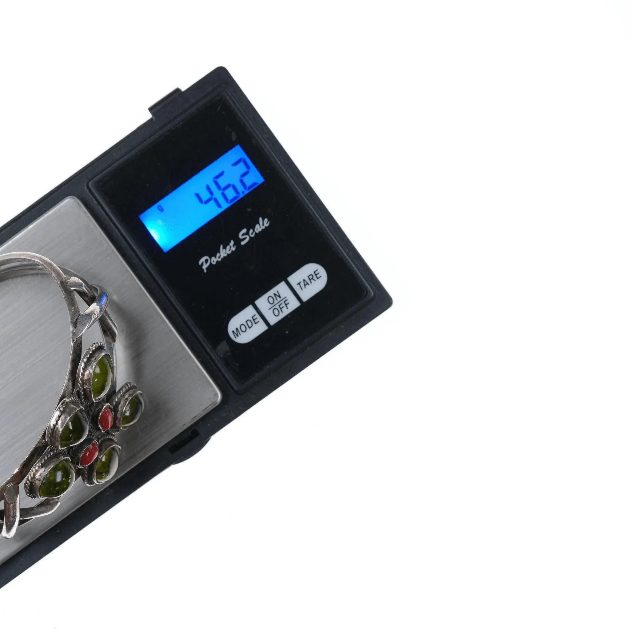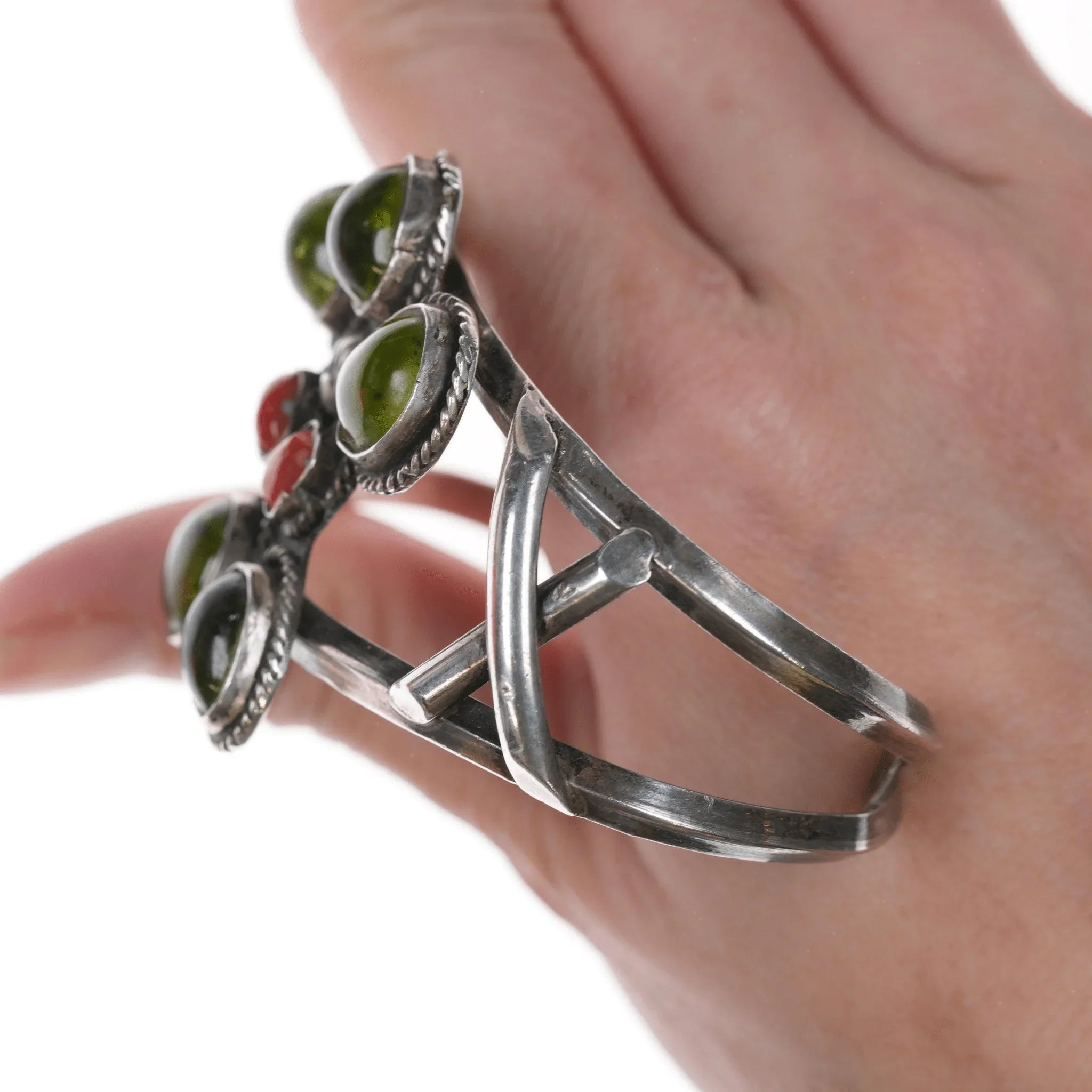 6.75" m Southwestern Sterling Green stone and coral cuff bracelet 48mm wide in<br>center, weight and other measurements in pics, one green stone with stable<br>fracture, coral pieces look a little small for bezels, possibly replacements,<br>unmarked or marked as shown. If a mark isn't shown then it isn't marked which is<br>common with pre 1970's Native American jewelry that isn't from one of the larger<br>trading posts.<br><br>All precious metals are tested and guaranteed, any Native American jewelry<br>referred to as Silver or Sterling is guaranteed to be a minimum of 90% (coin)<br>silver and possibly higher content. Anything marked is guaranteed to be what<br>it's marked, most bracelets are photographed on a 6" wrist (non hairy), rings<br>photographed on the appropriate sized finger when possible. With bracelets if<br>the measurement is not given in the description then inside circumference is<br>shown where the metal meets the number on the the cloth tape measure.