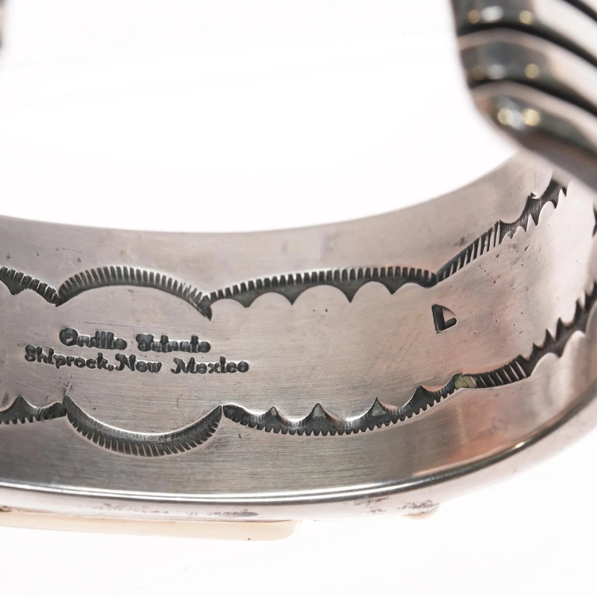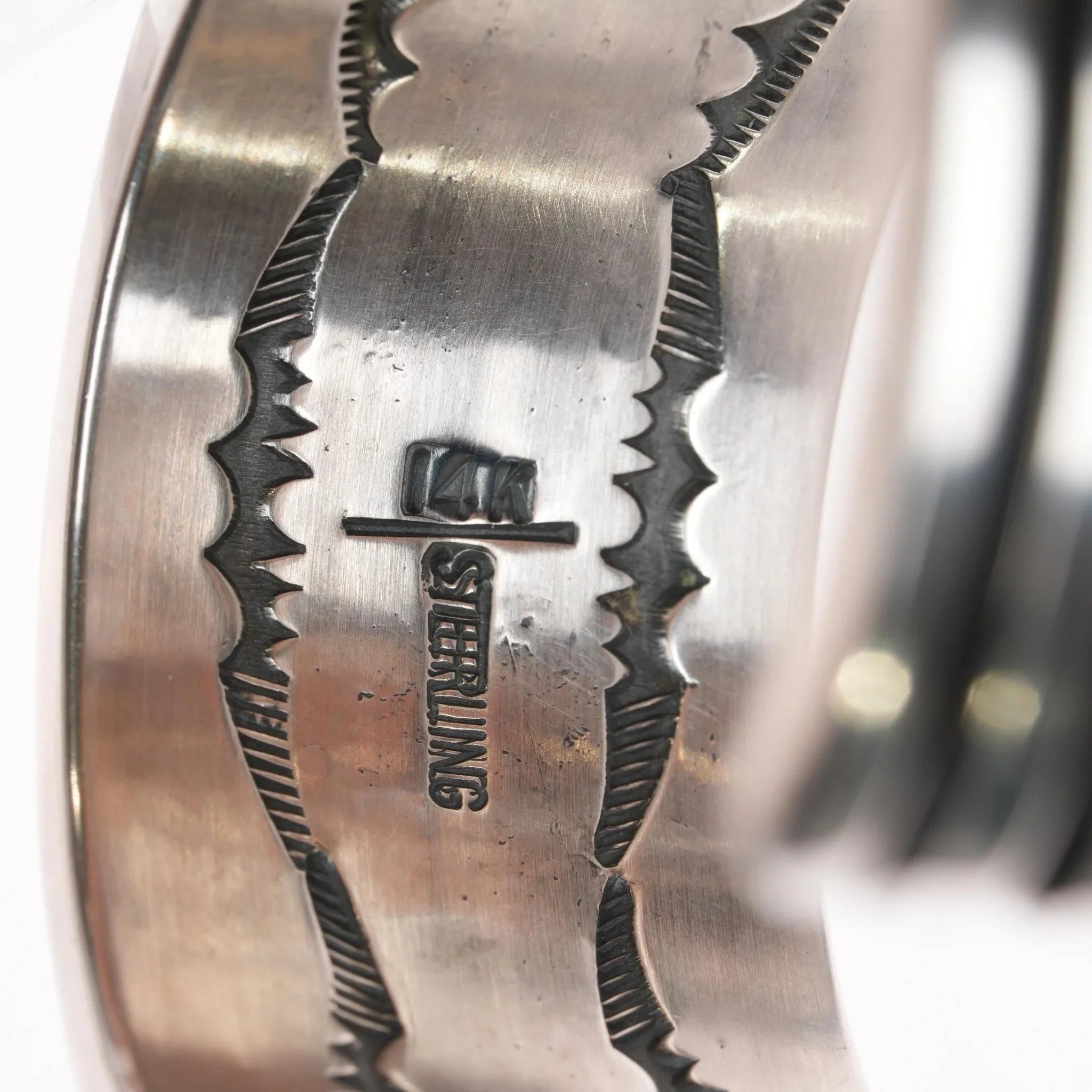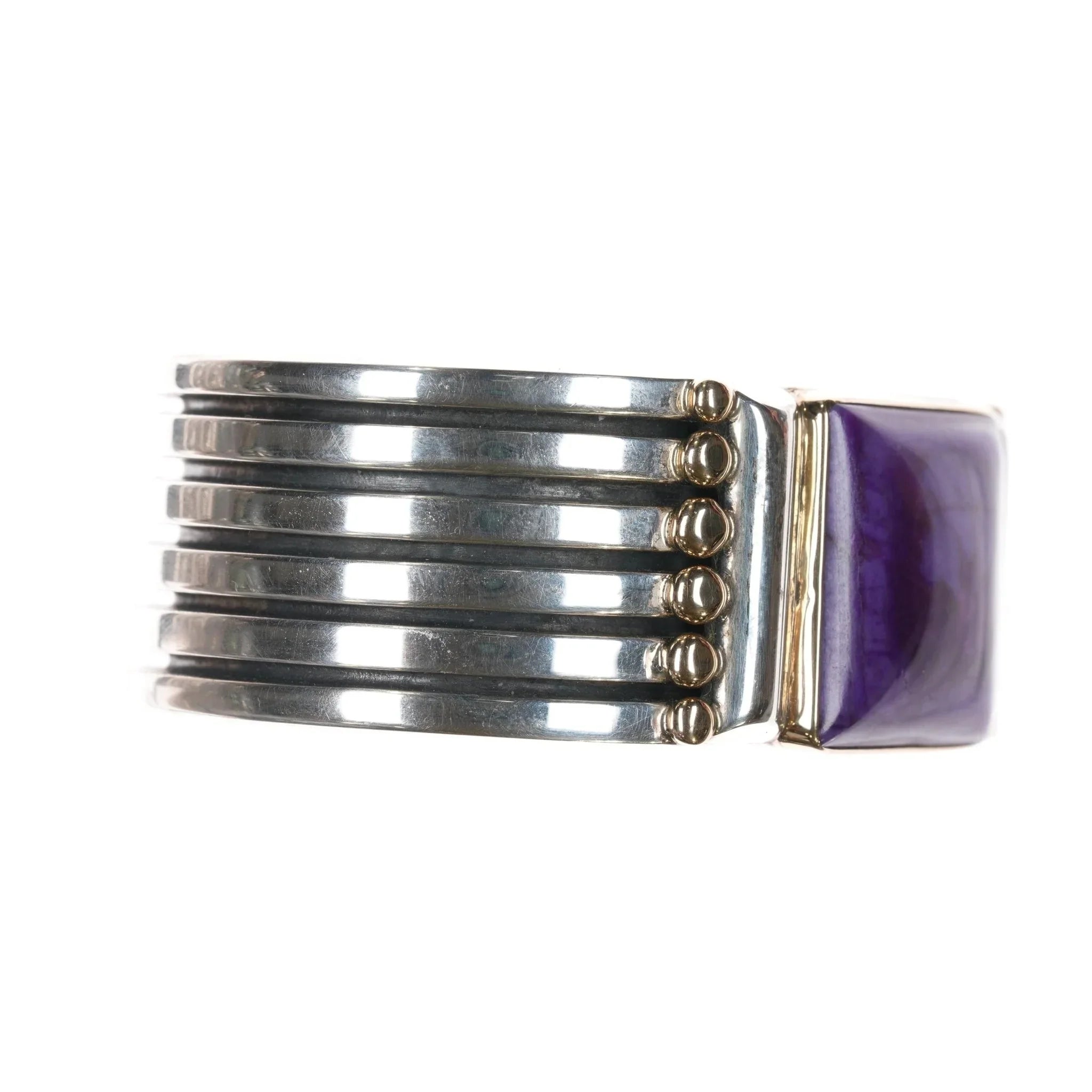 6.75" Orville Tsinnie Navajo 14k/Sterling sugilite cuff bracelet. No issues, weight and measurements in pics. Solid 14k gold bezel and 12 decorative beads, the rest solid sterling. Fancy stamped interior.