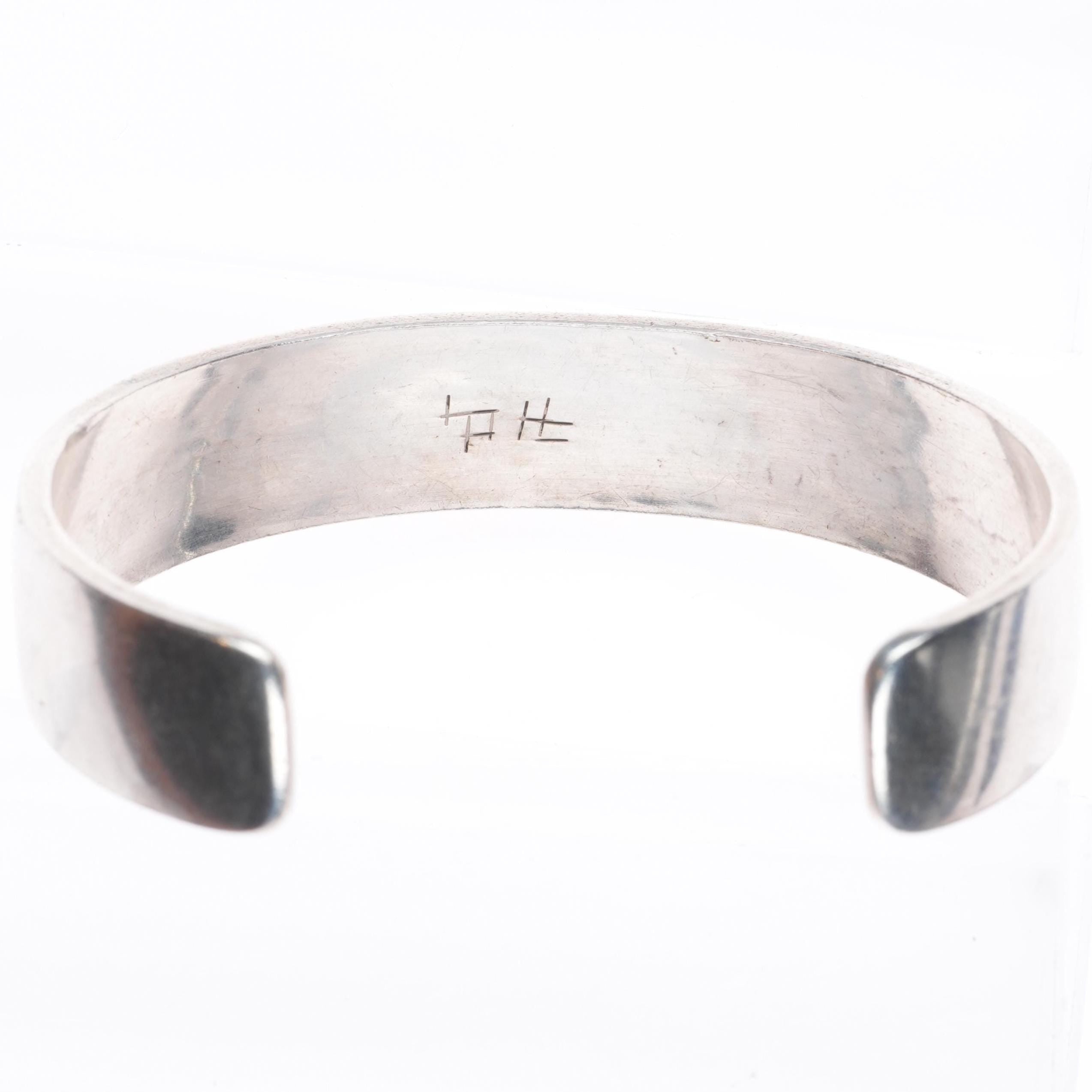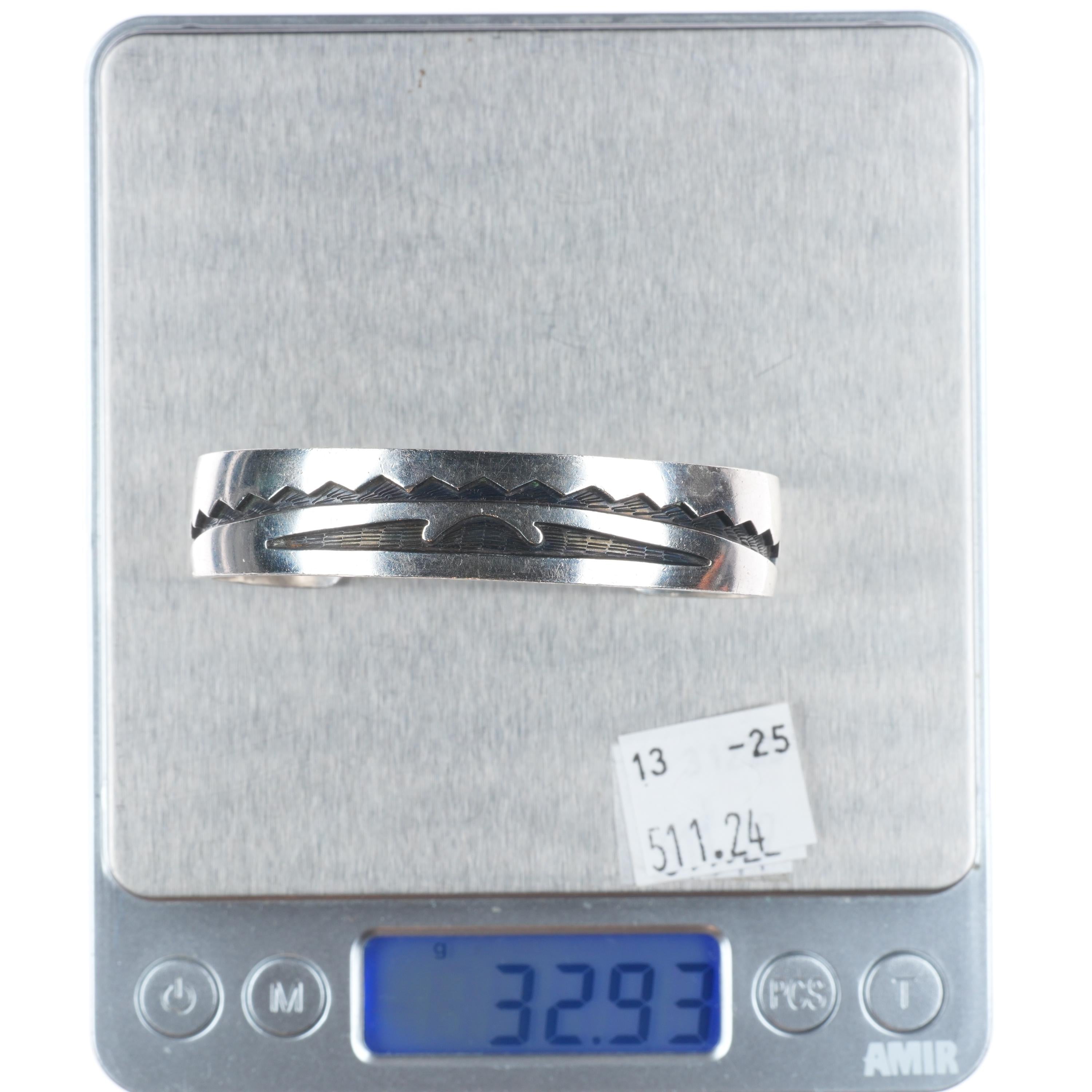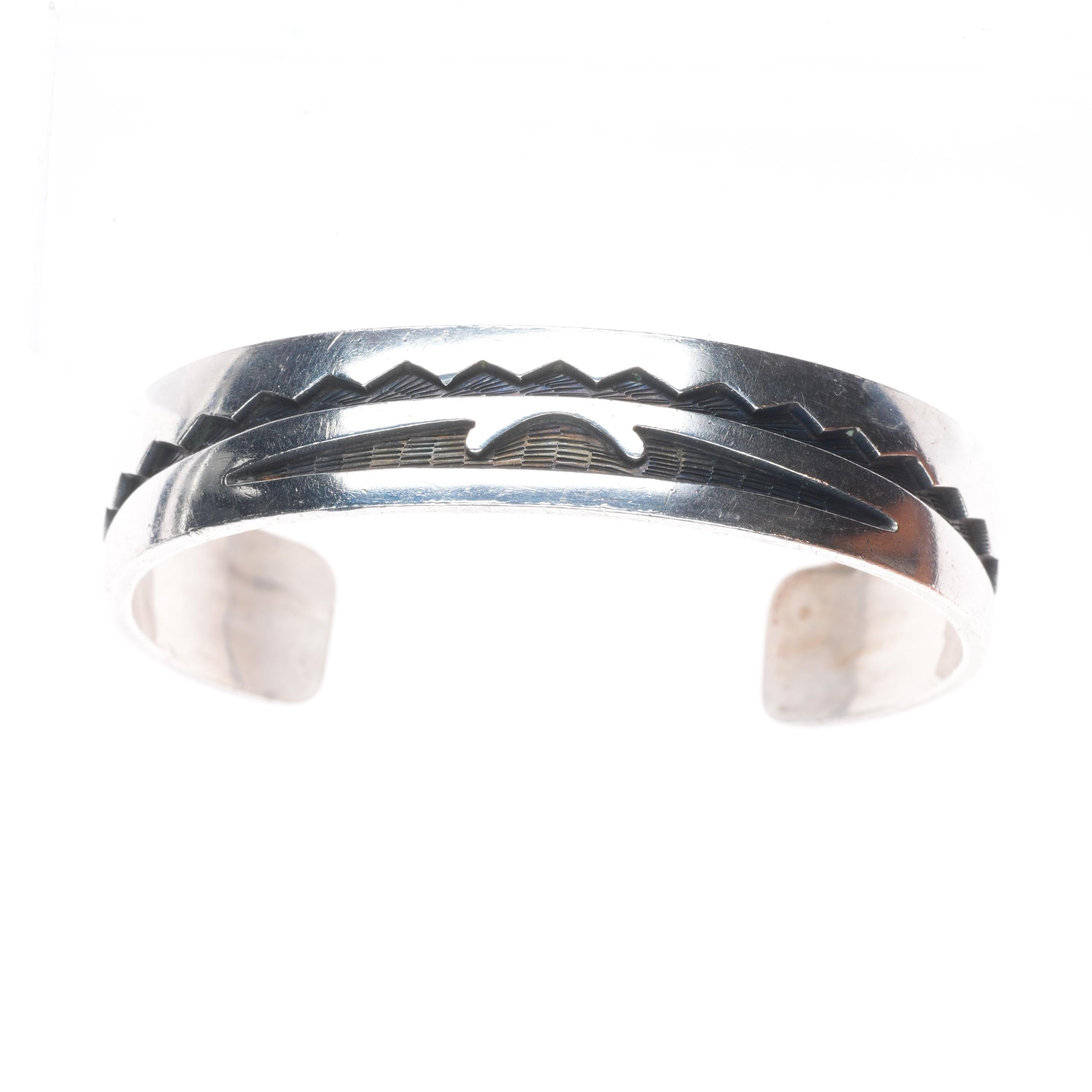 6.75" Vintage Larry Pooyouma Hopi overlay cuff bracelet sterling silver. Tested and guaranteed solid sterling silver with weight and measurements in pictures. Circa last quarter of the 20th century with some expected age appropriate wear.