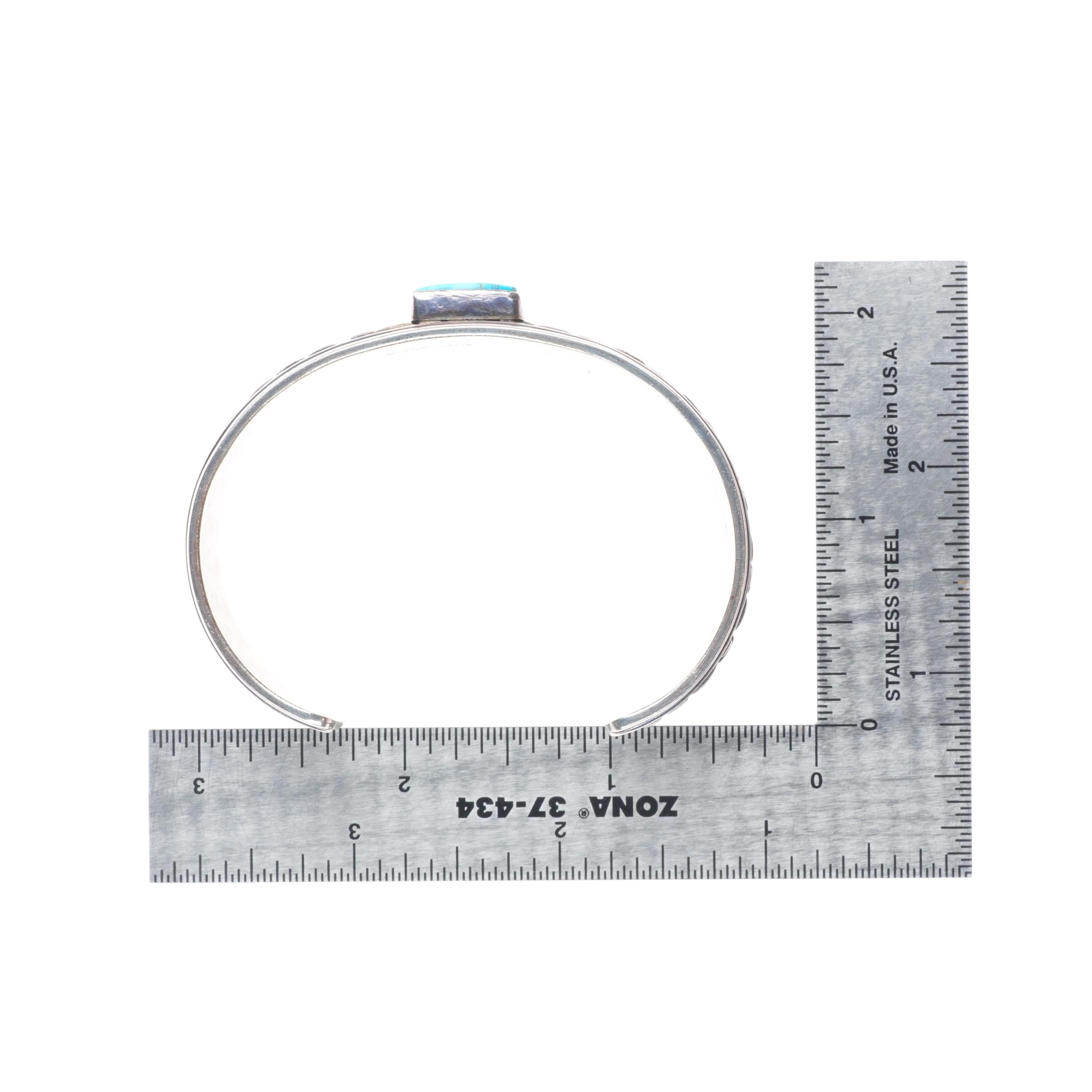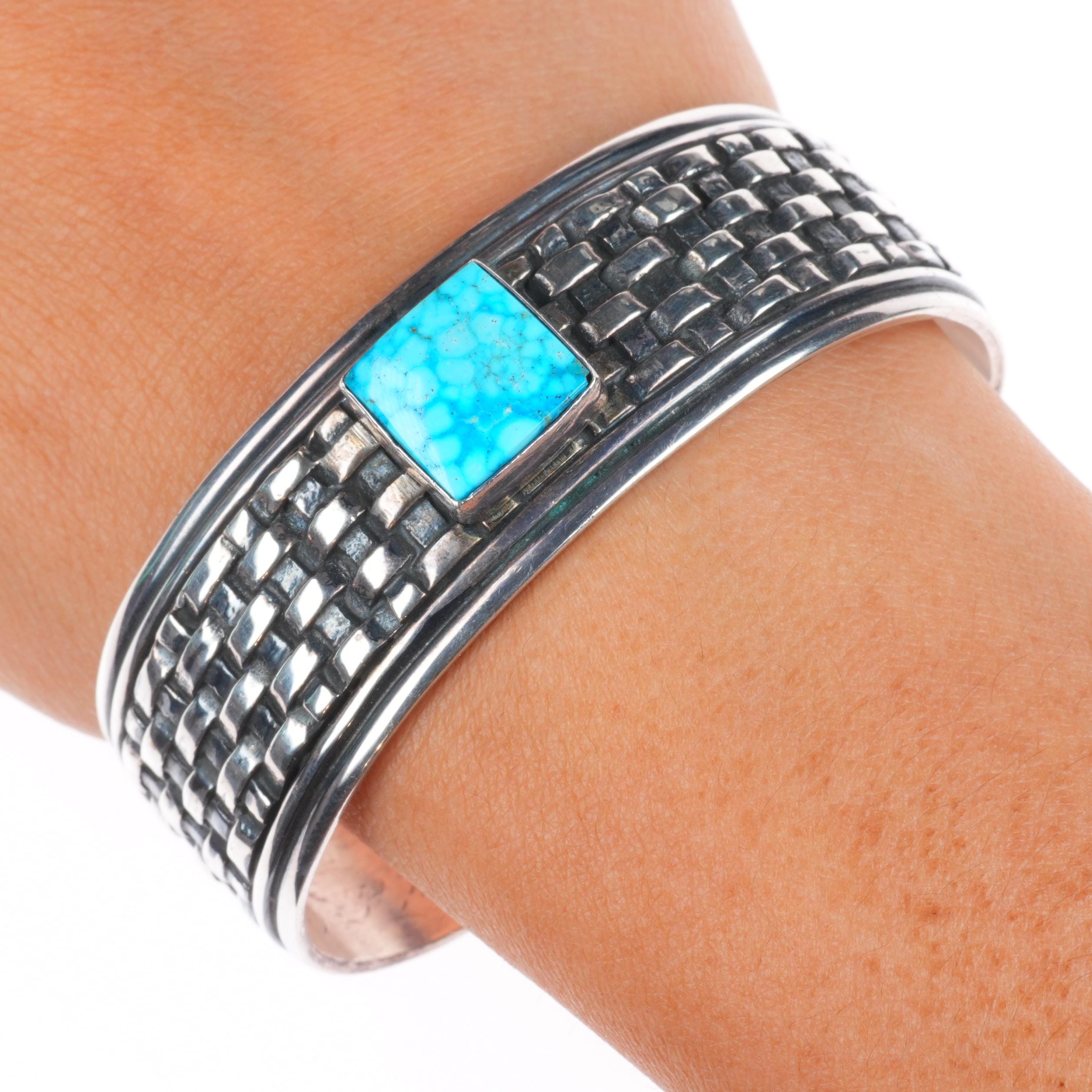 6.75" Vintage Navajo L James sterling silver turquoise basketweave cuff bracelet. Tested and guaranteed solid sterling silver with weight and measurements in pictures. Circa fourth quarter of the 20th century with some expected age appropriate wear.