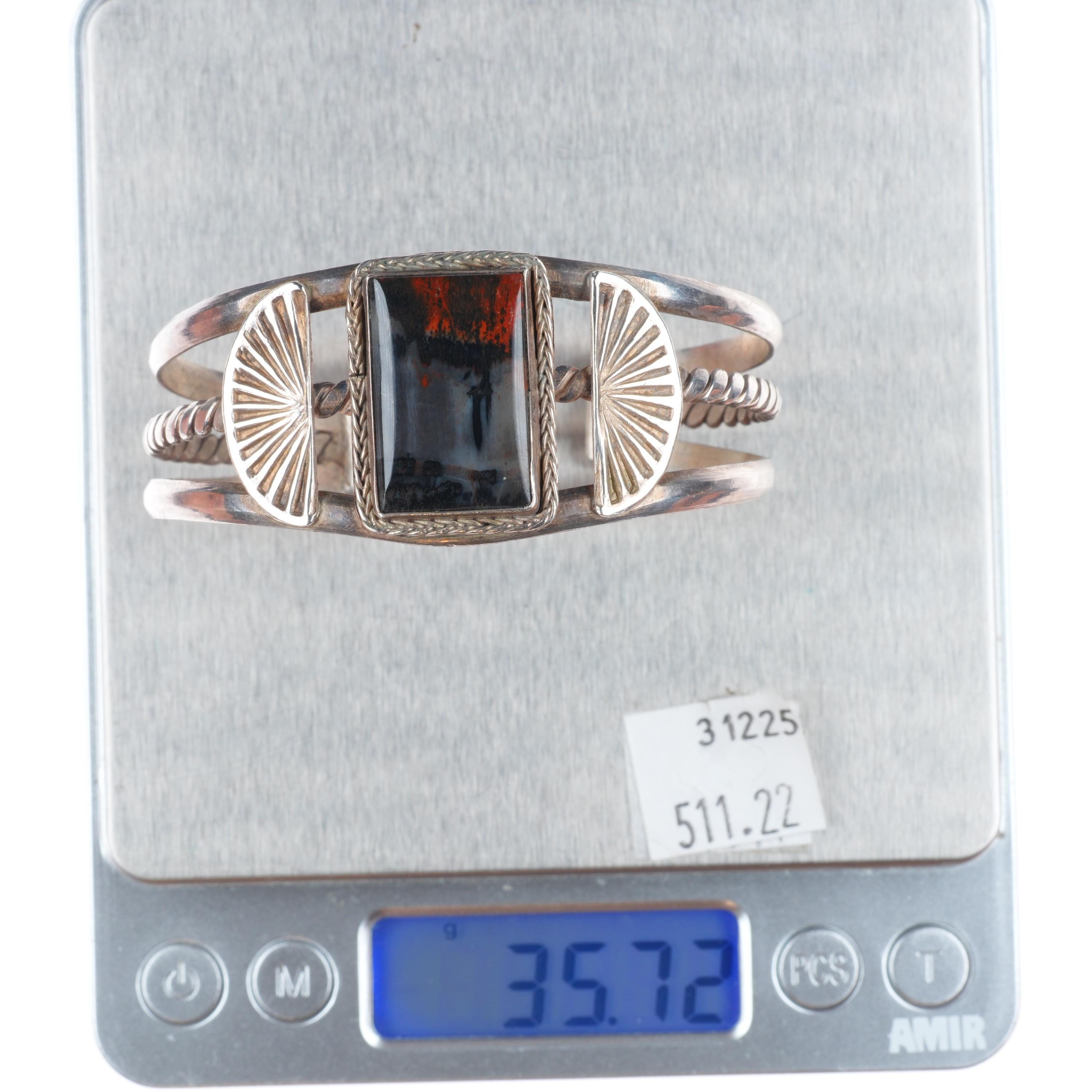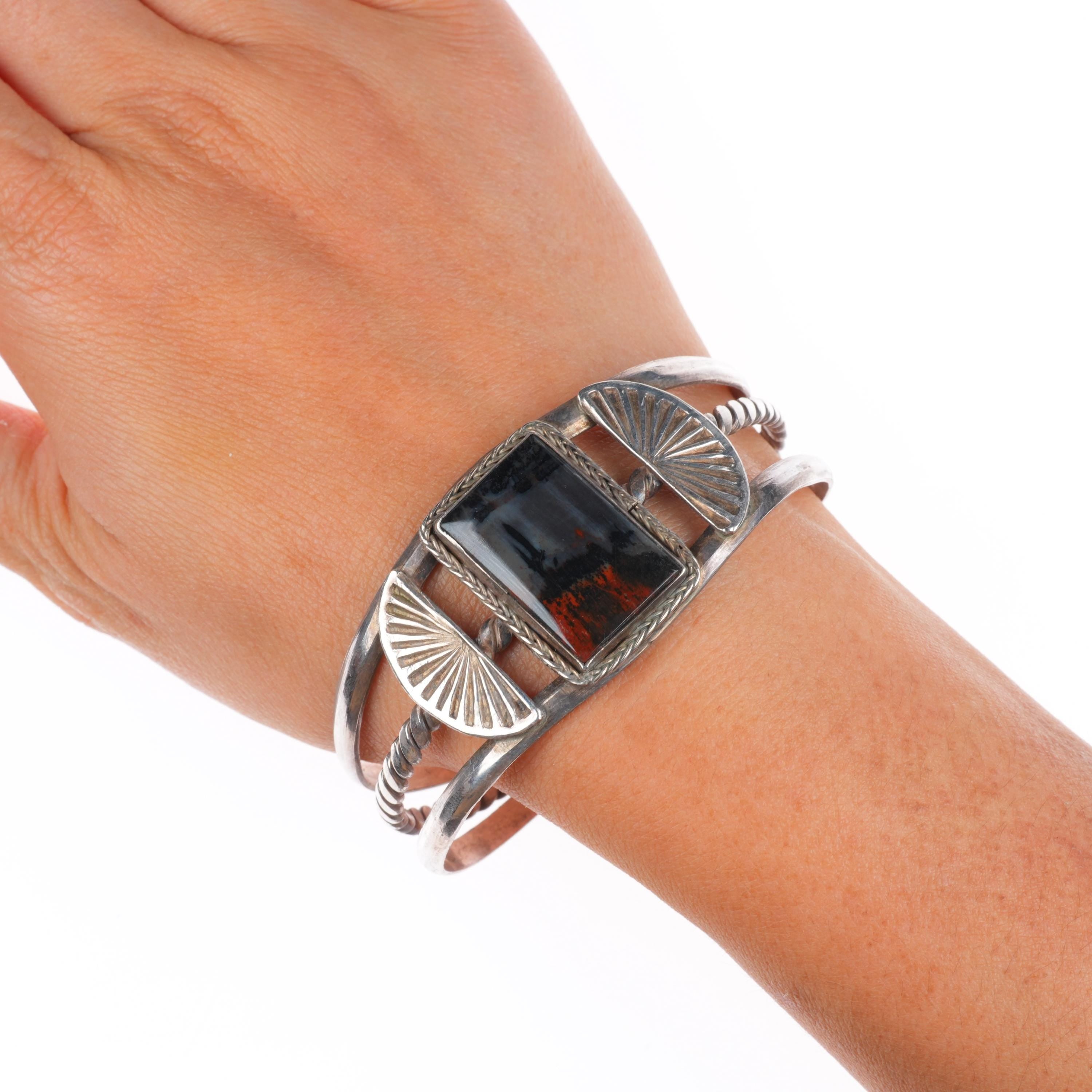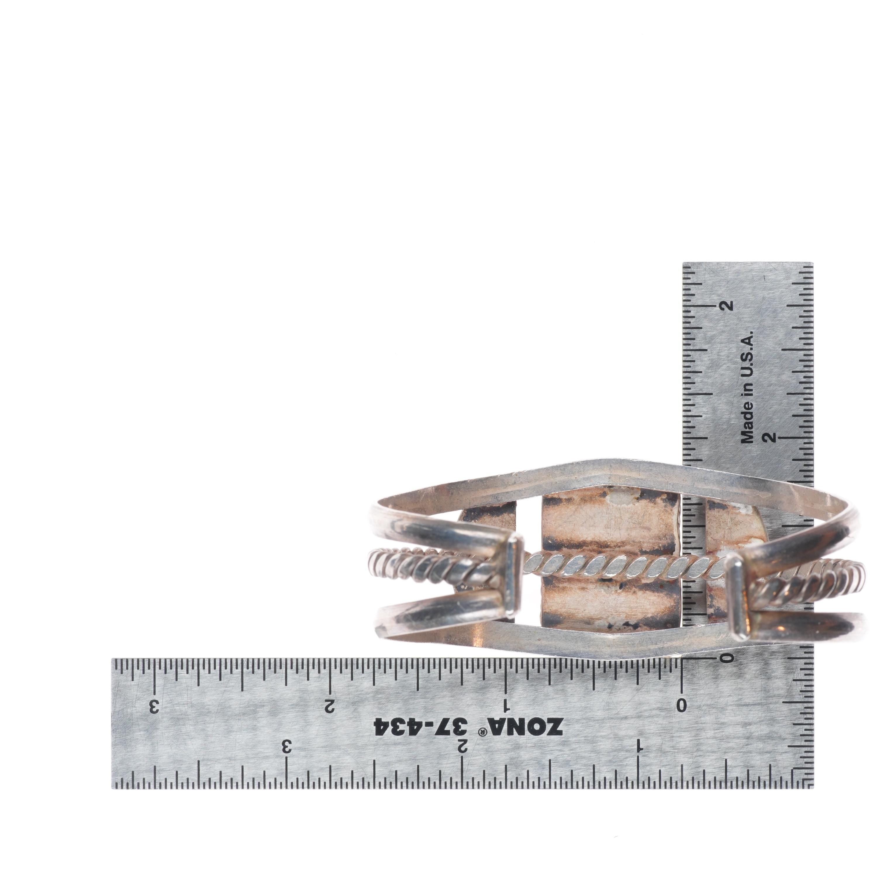 6.8" 1940‘s Vintage Navajo sterling silver petrified wood agate cuff bracelet. Tested and guaranteed solid sterling silver with weight and measurements in pictures. Circa second quarter of the 20th century with some expected age appropriate wear.
