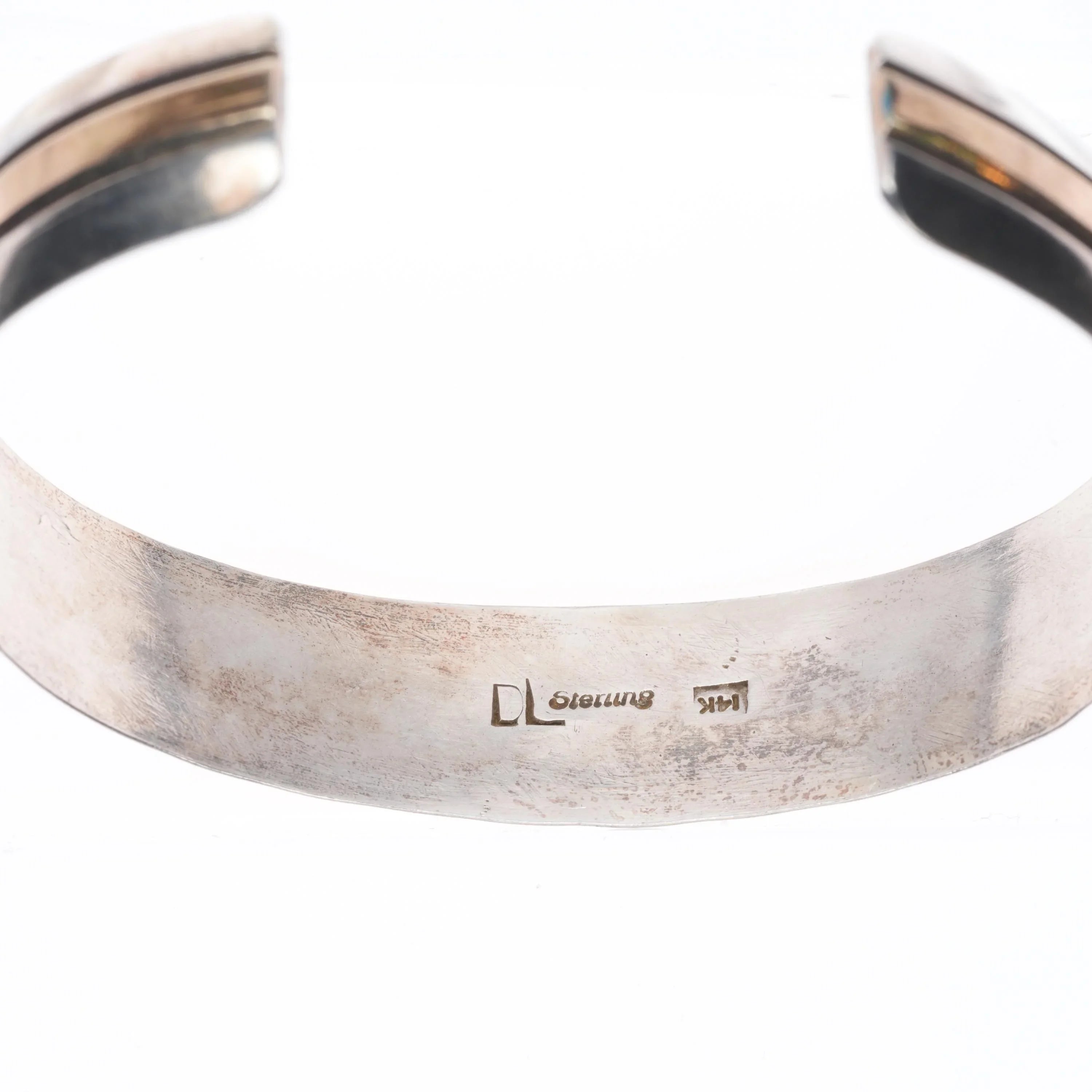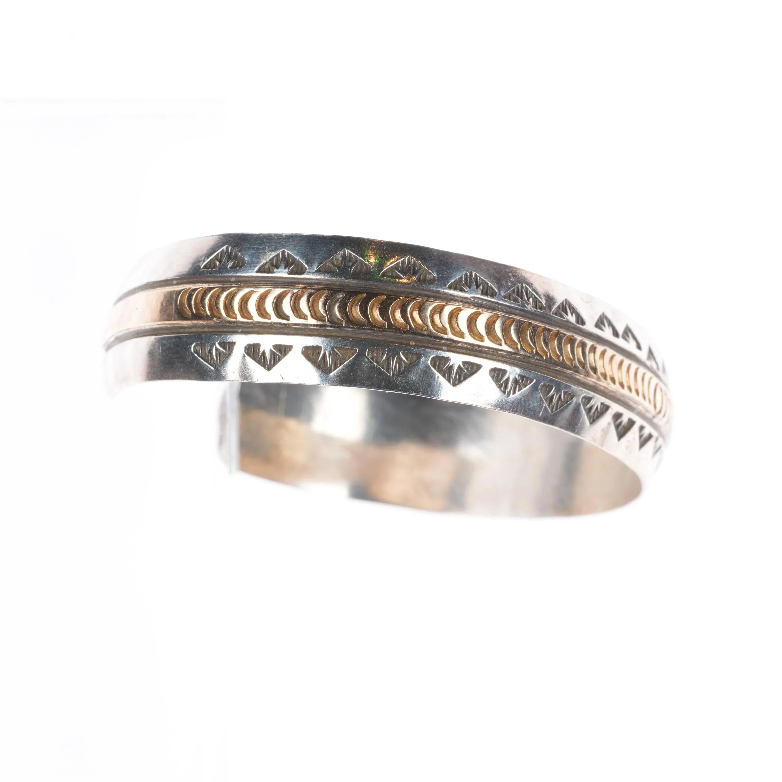 6.9" Dawn Lucas Navajo sterling silver 14k gold heavily stamped cuff bracelet. Tested and guaranteed solid sterling silver and solid 14k gold center band with weight and measurements in pictures. No damage or significant wear, circa last quarter of the 20th century.