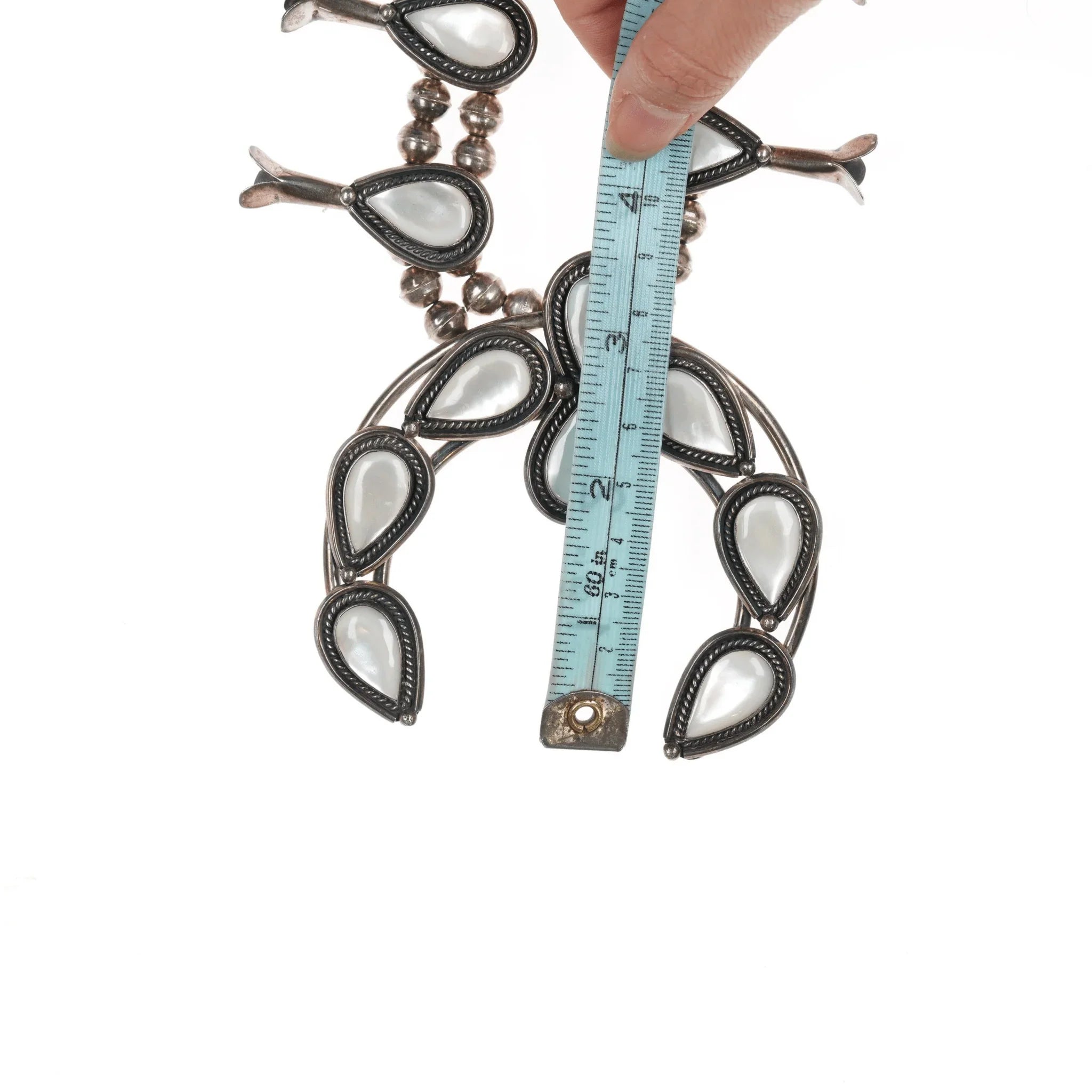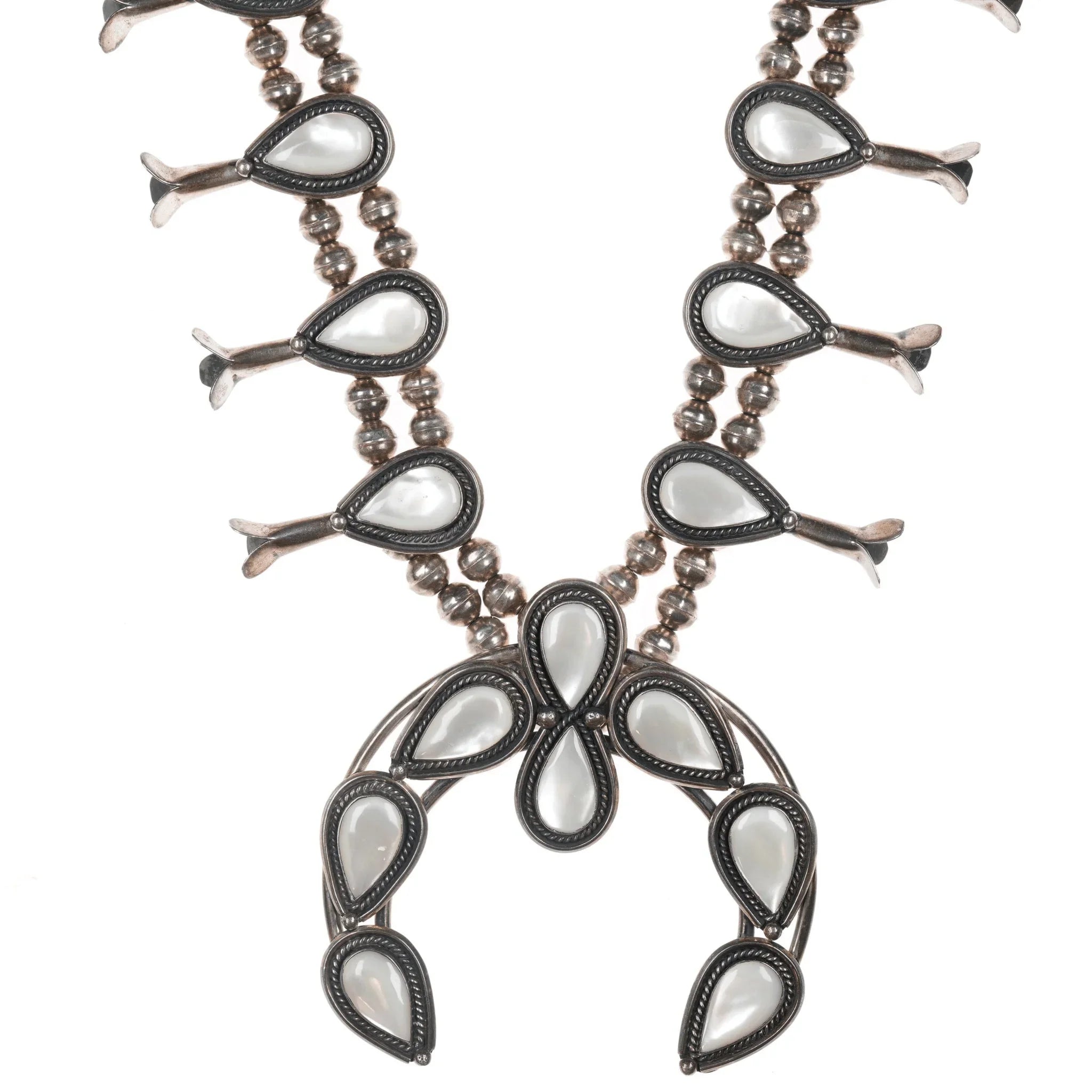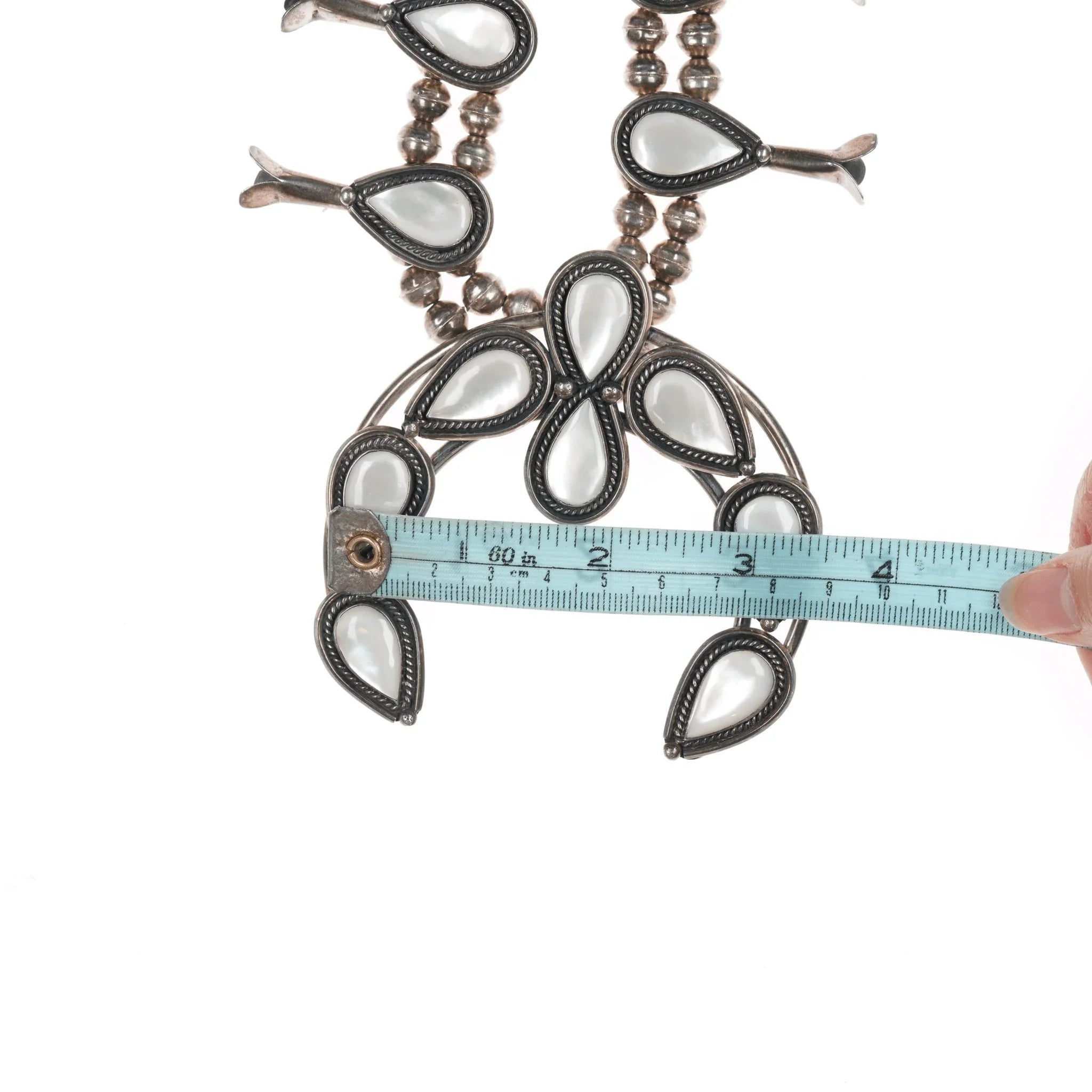 60's-70's Navajo Sterling Mother of Pearl squash blossom necklace. Approx 27" long with no issues, measurements in pics.
