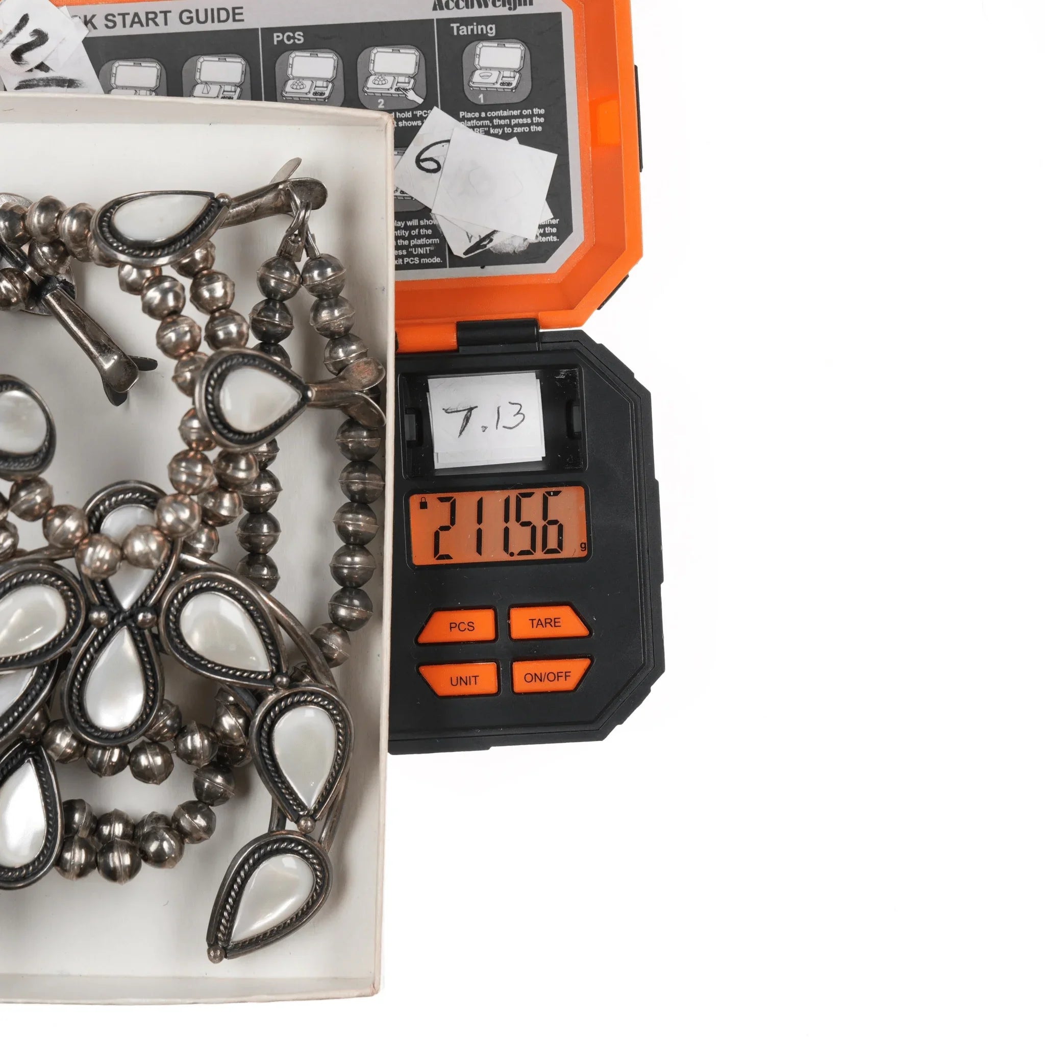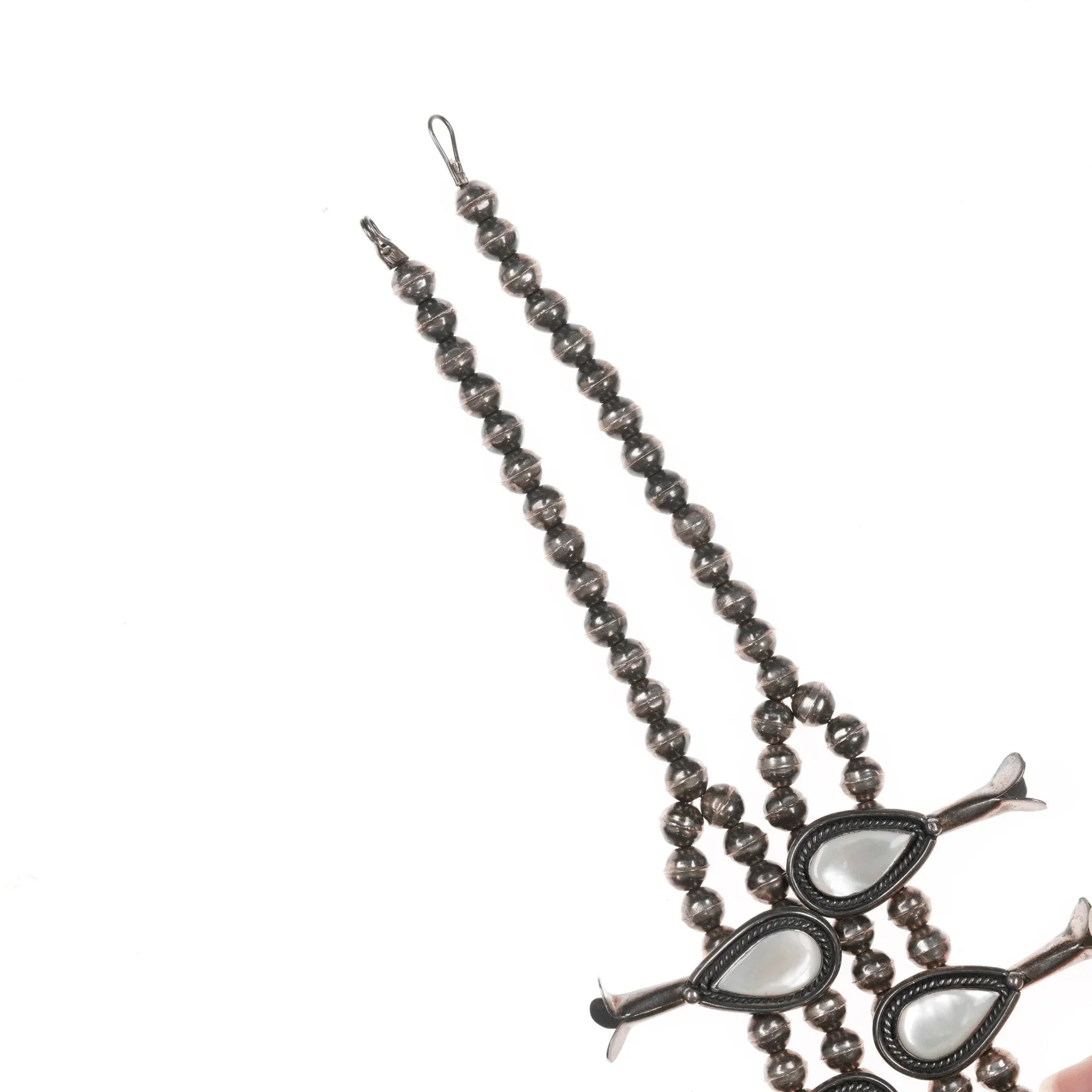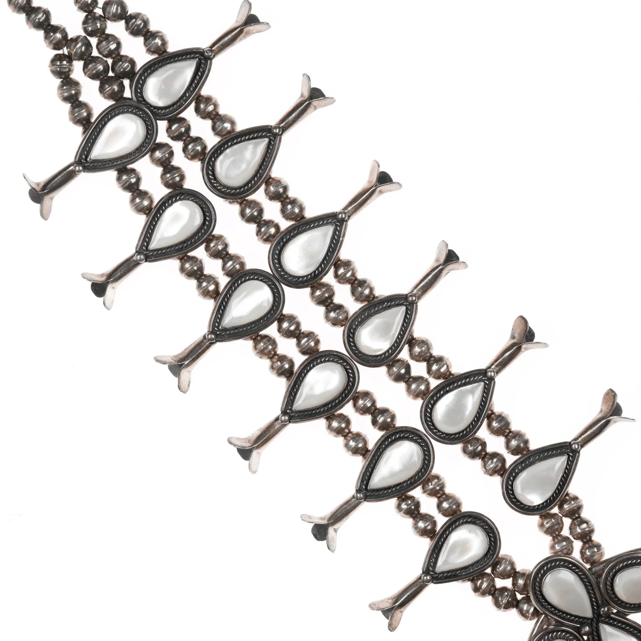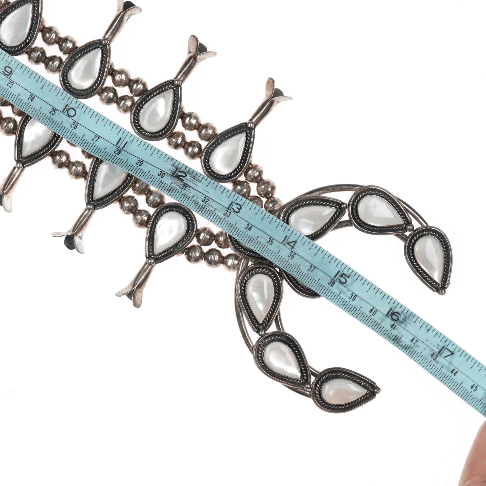 60's-70's Navajo Sterling Mother of Pearl squash blossom necklace. Approx 27" long with no issues, measurements in pics.
