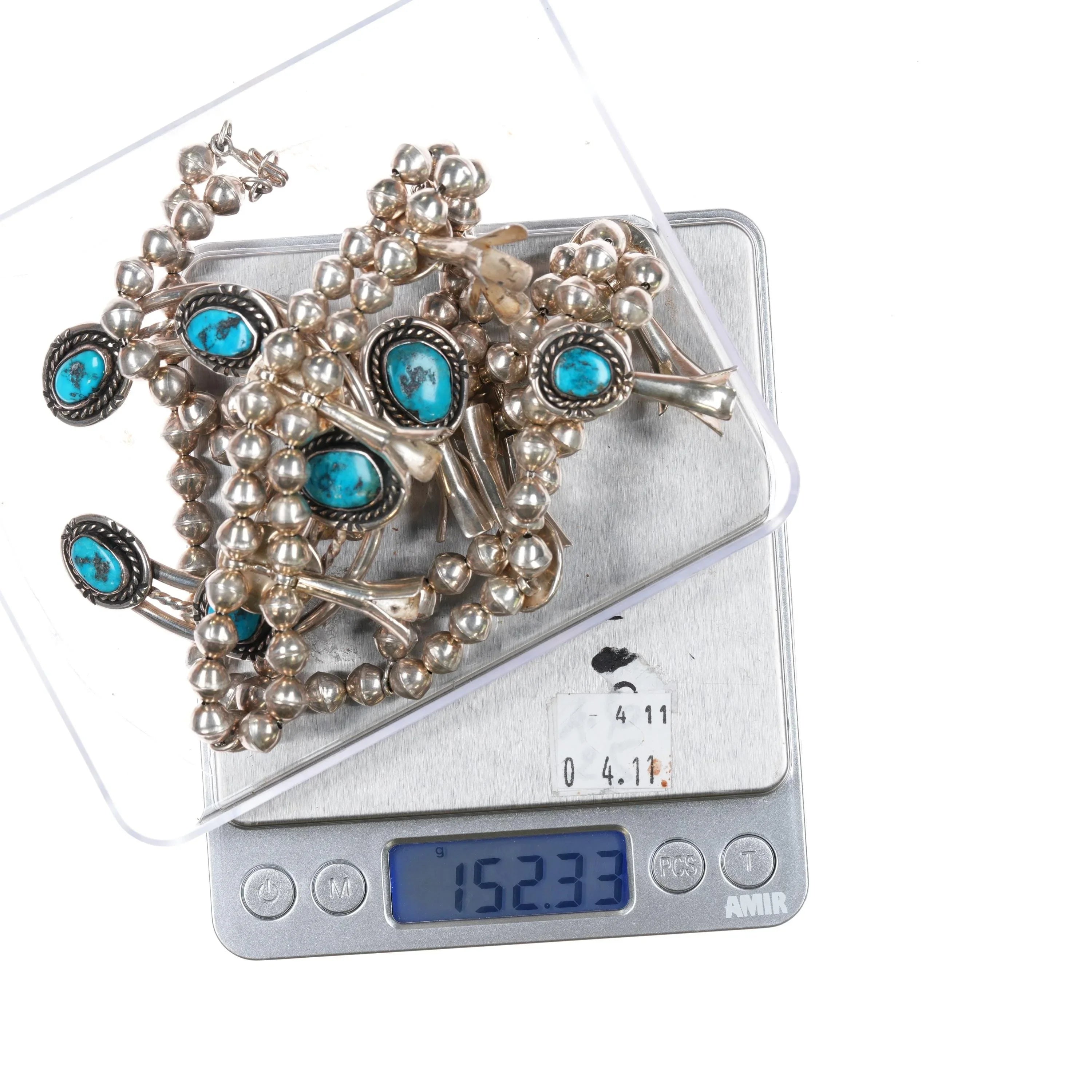 60‘s-70‘s Navajo sterling silver turquoise squash blossom necklace 26" long, no damage, weight and measurements in pictures. Solid sterling silver from the third quarter of the 20th century. Unmarked.