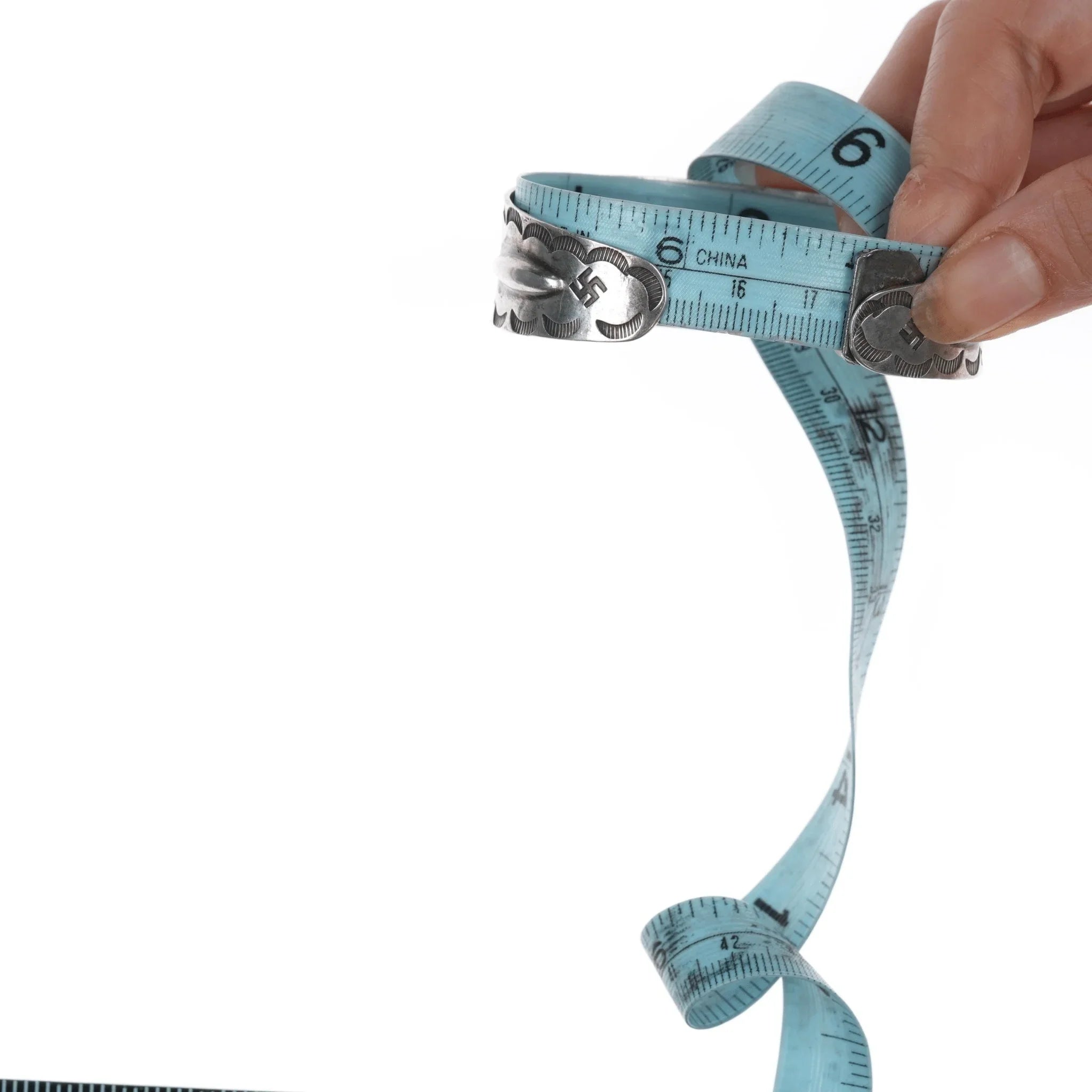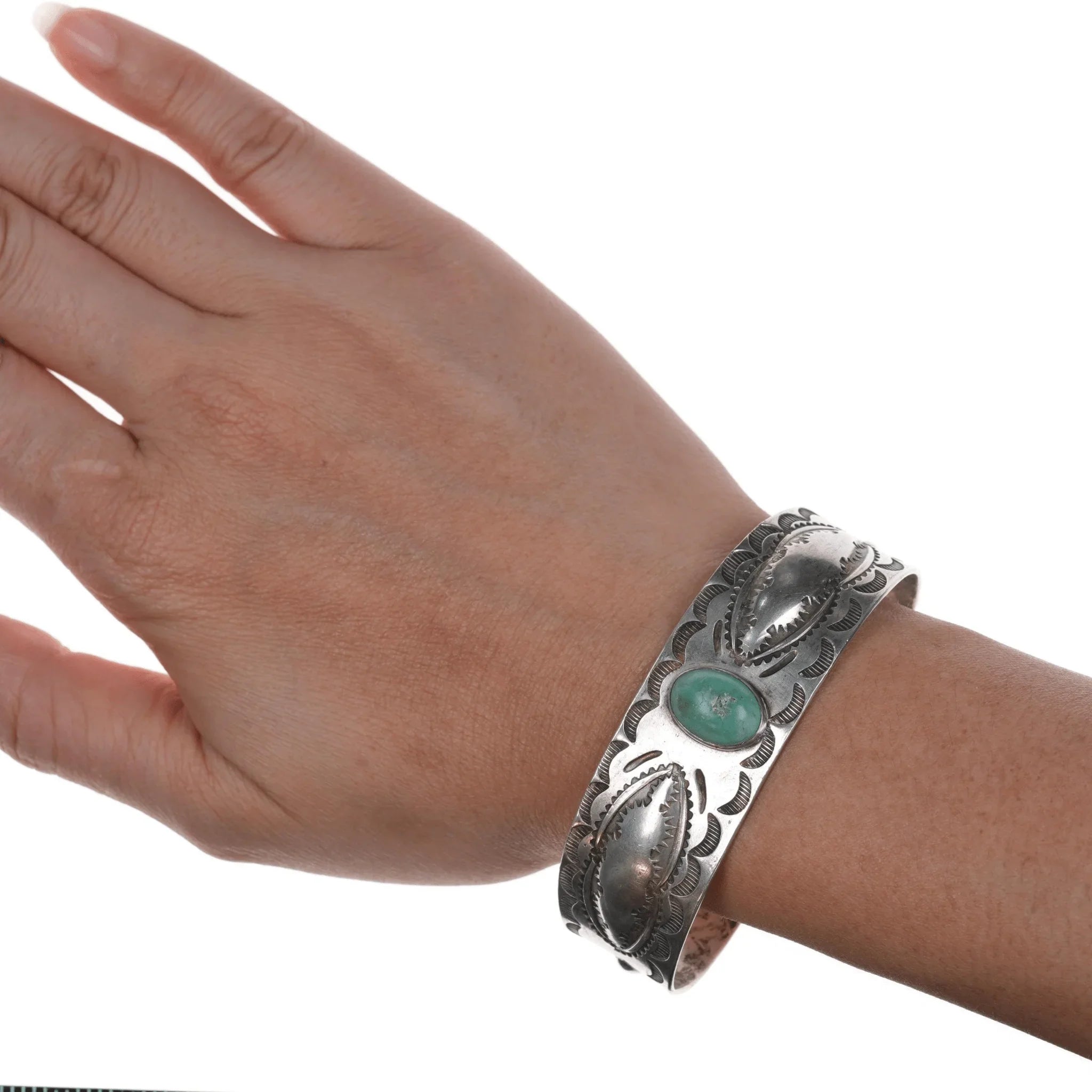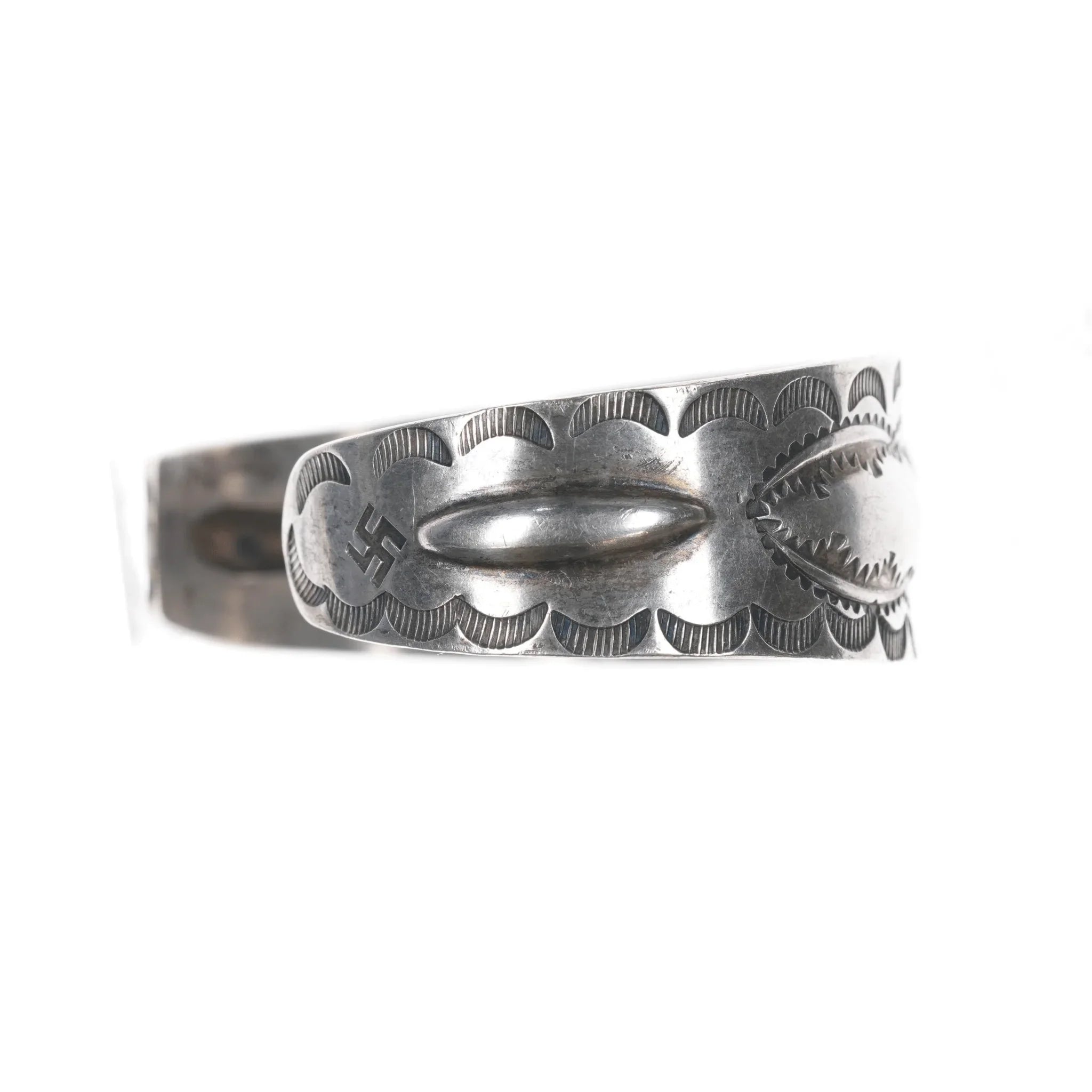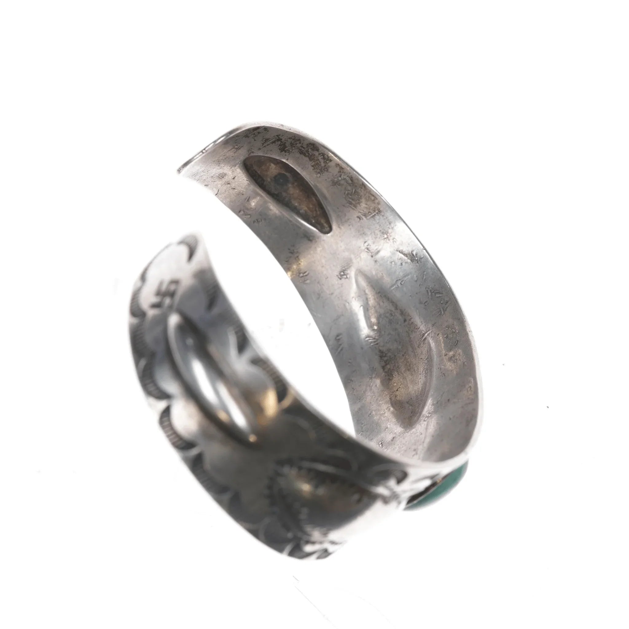 7" 1930's Navajo hand stamped silver whirling logs cuff bracelet with turquoise