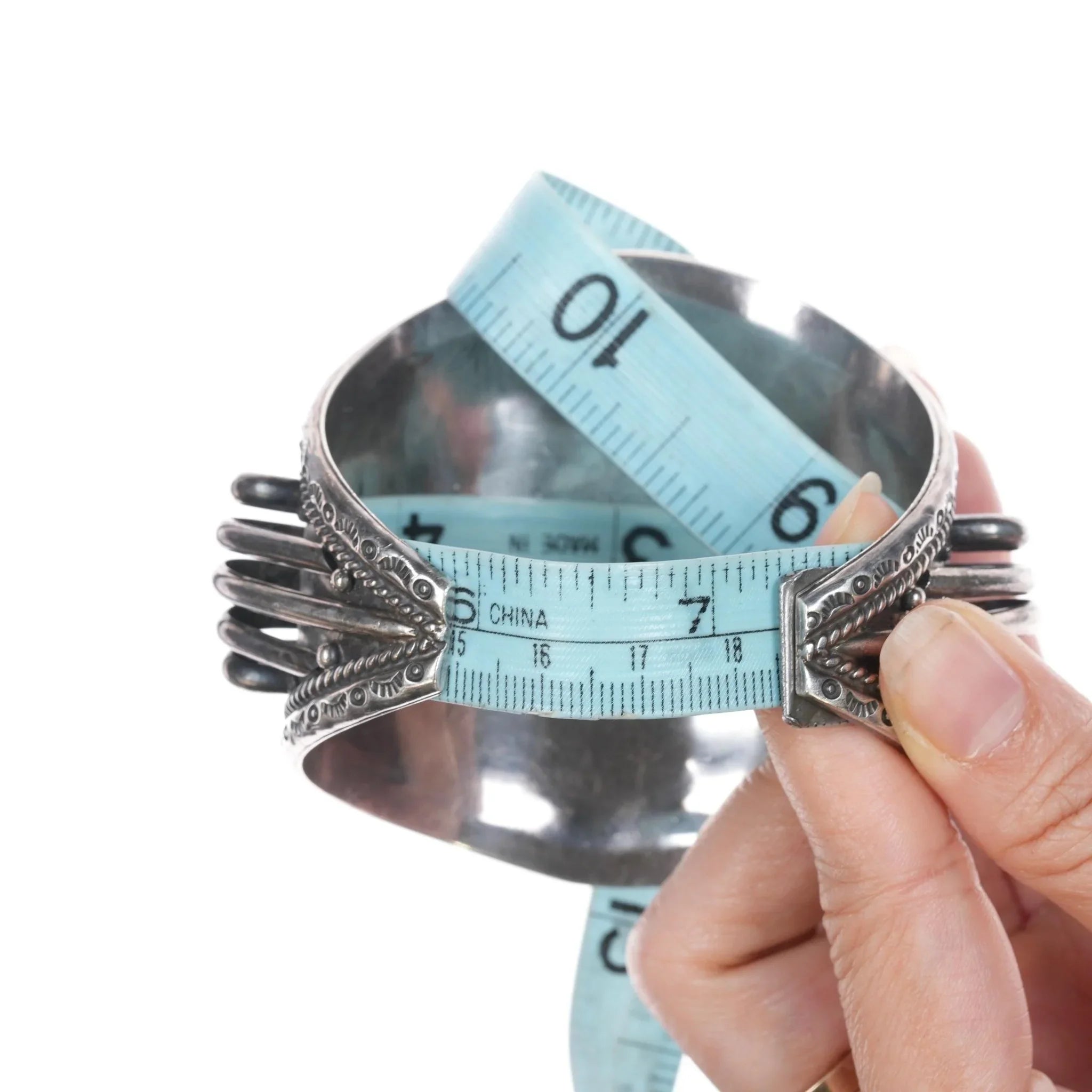 All precious metals are tested and guaranteed. A Native American jewelry piece referred to as "silver" or "ingot" is guaranteed to be at least 90% silver. I rarely use the word "sterling" when referring to older Native American silver or really any older silver jewelry as silver contents vary and "sterling" is 92.5% silver. No older jewelry is going to be exactly 92.5% silver, some a little over, some a little under. It wasn‘t an exact thing with handmade jewelry. I‘ve seen thousands of pieces xrf‘d to prove this. Bracelets are photographed on a 6" women‘s wrist.