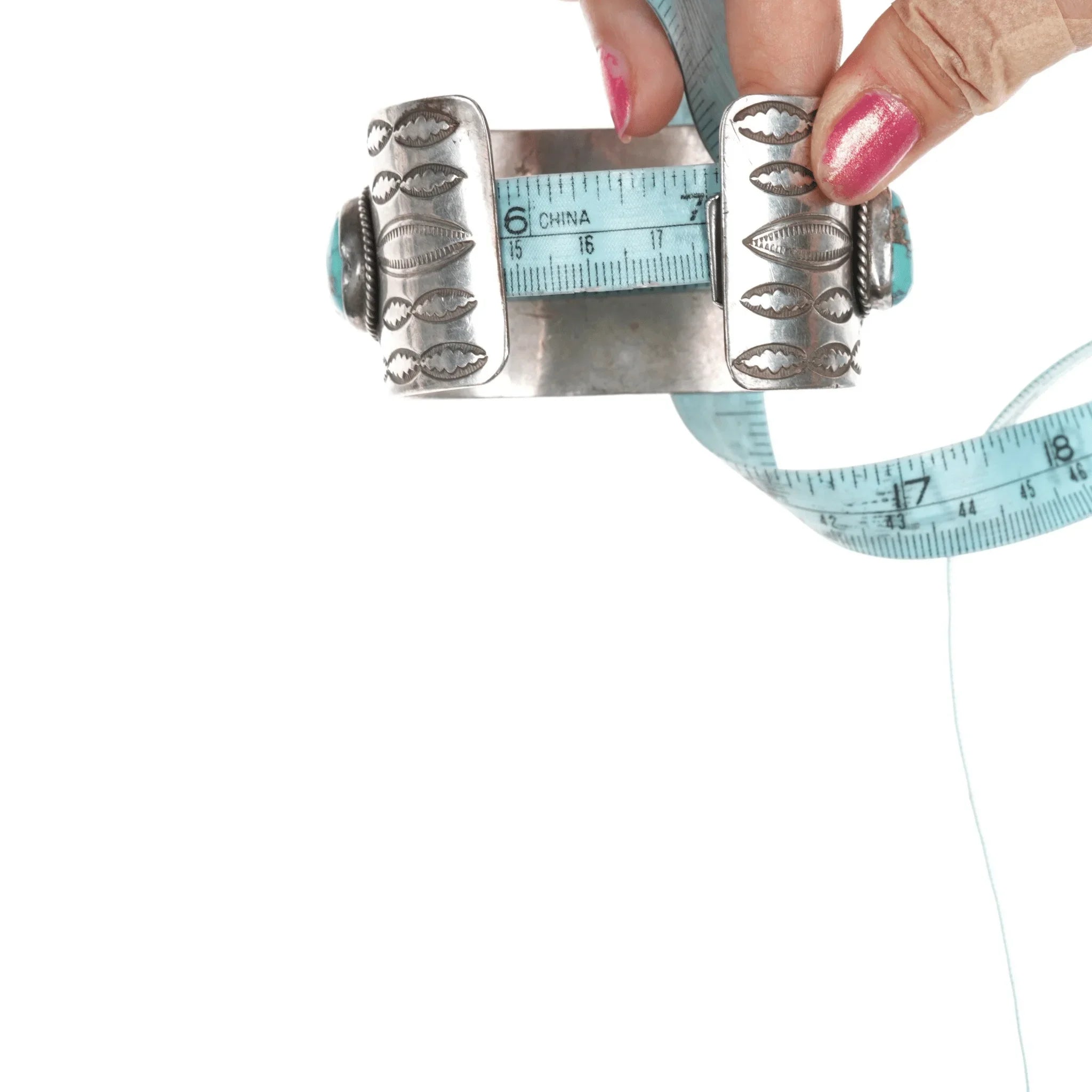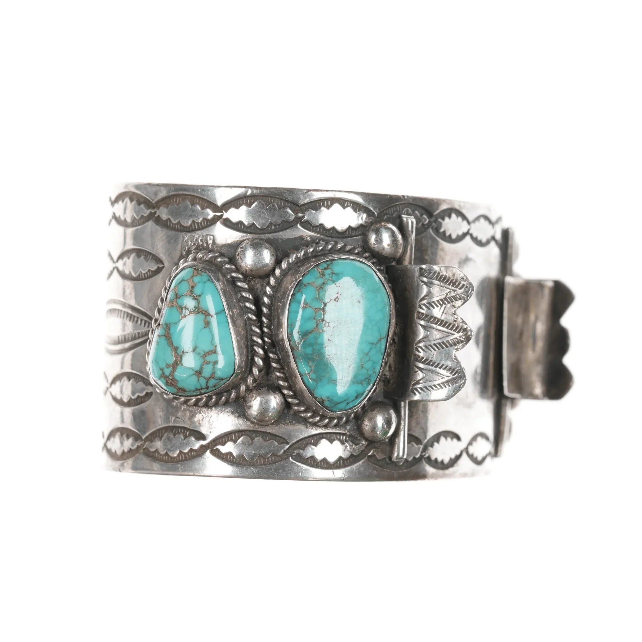 40's-50's Intricately Stamped High Grade turquoise Navajo silver cuff bracelet Fits up to a 7" wrist and a very large watch.