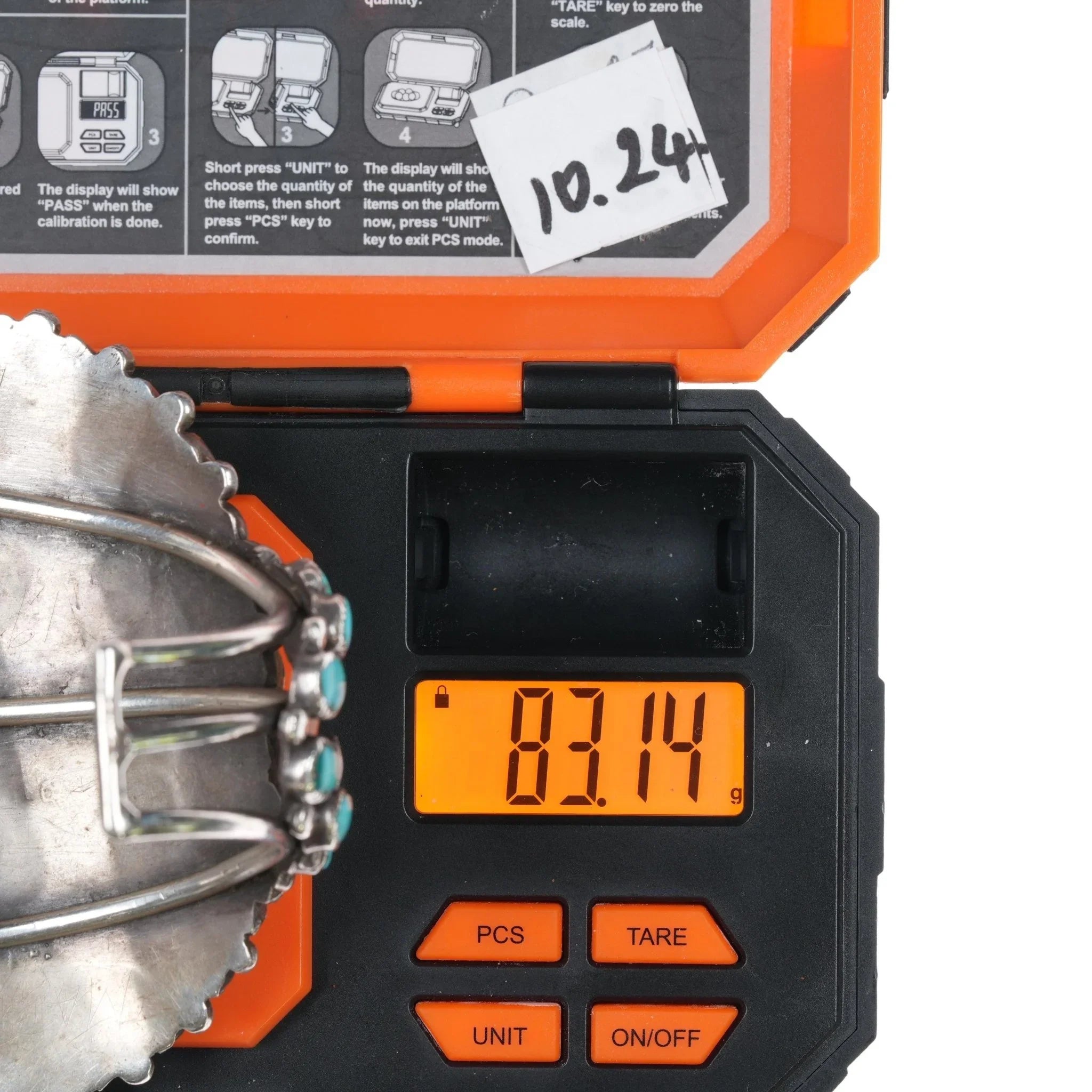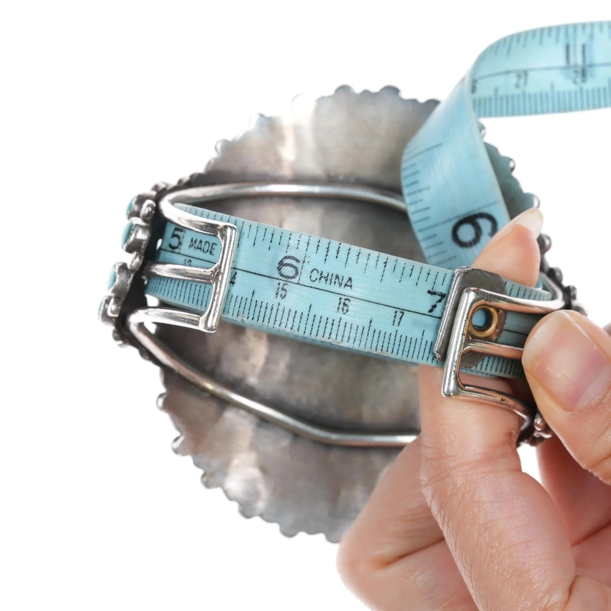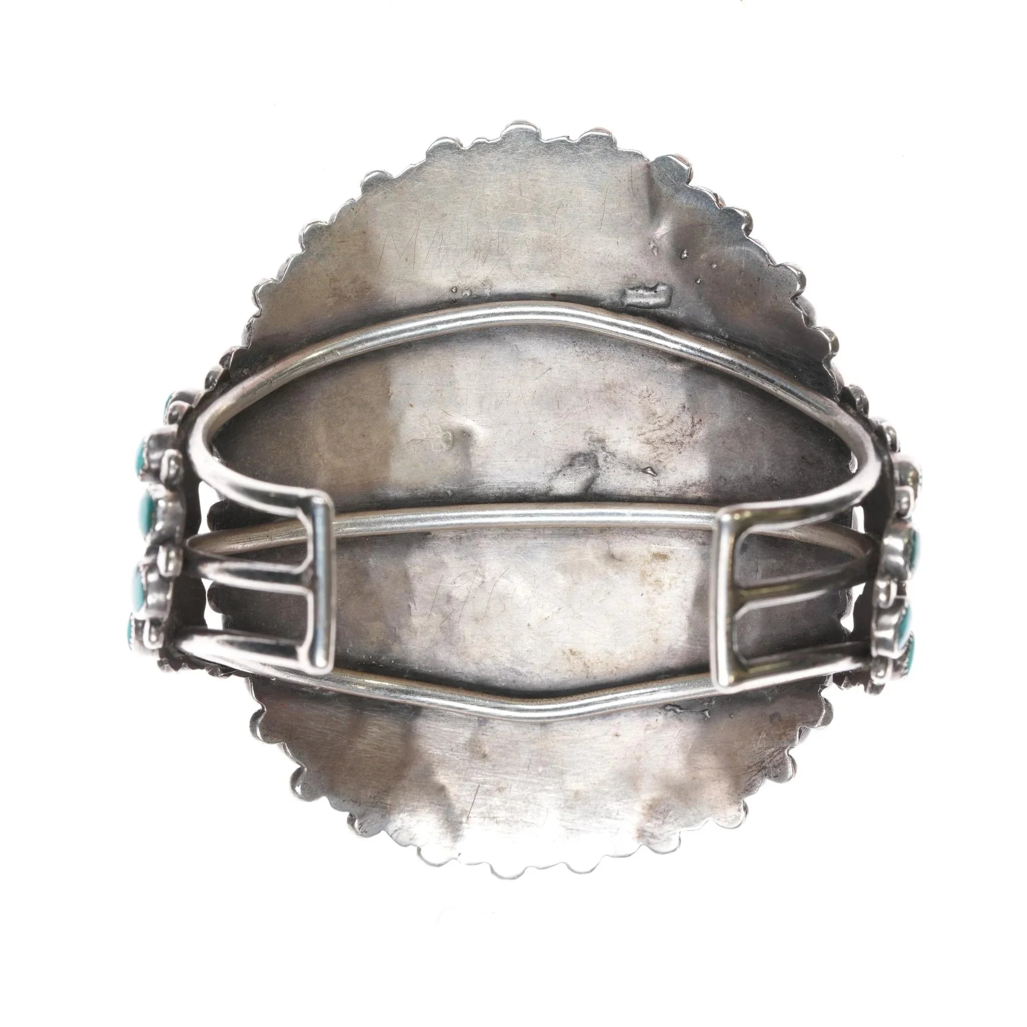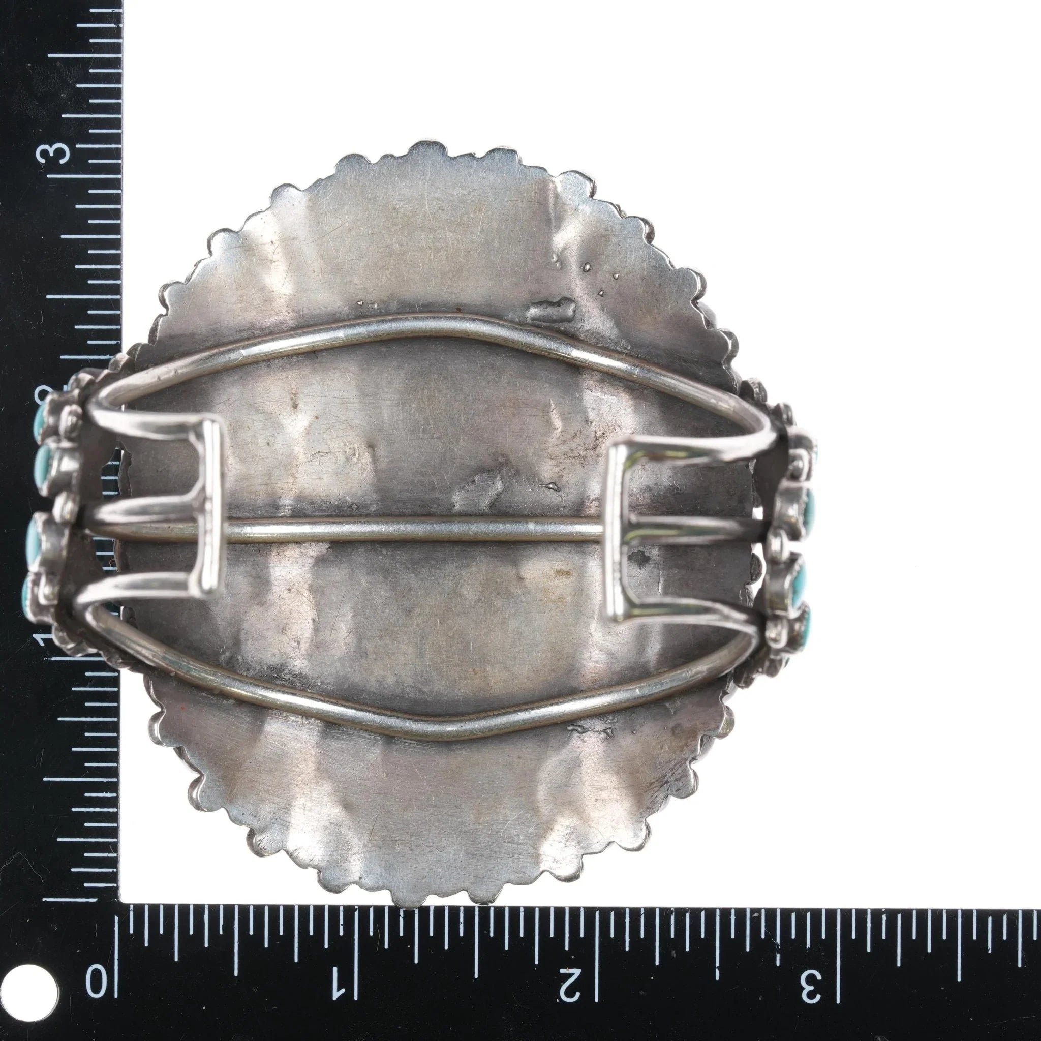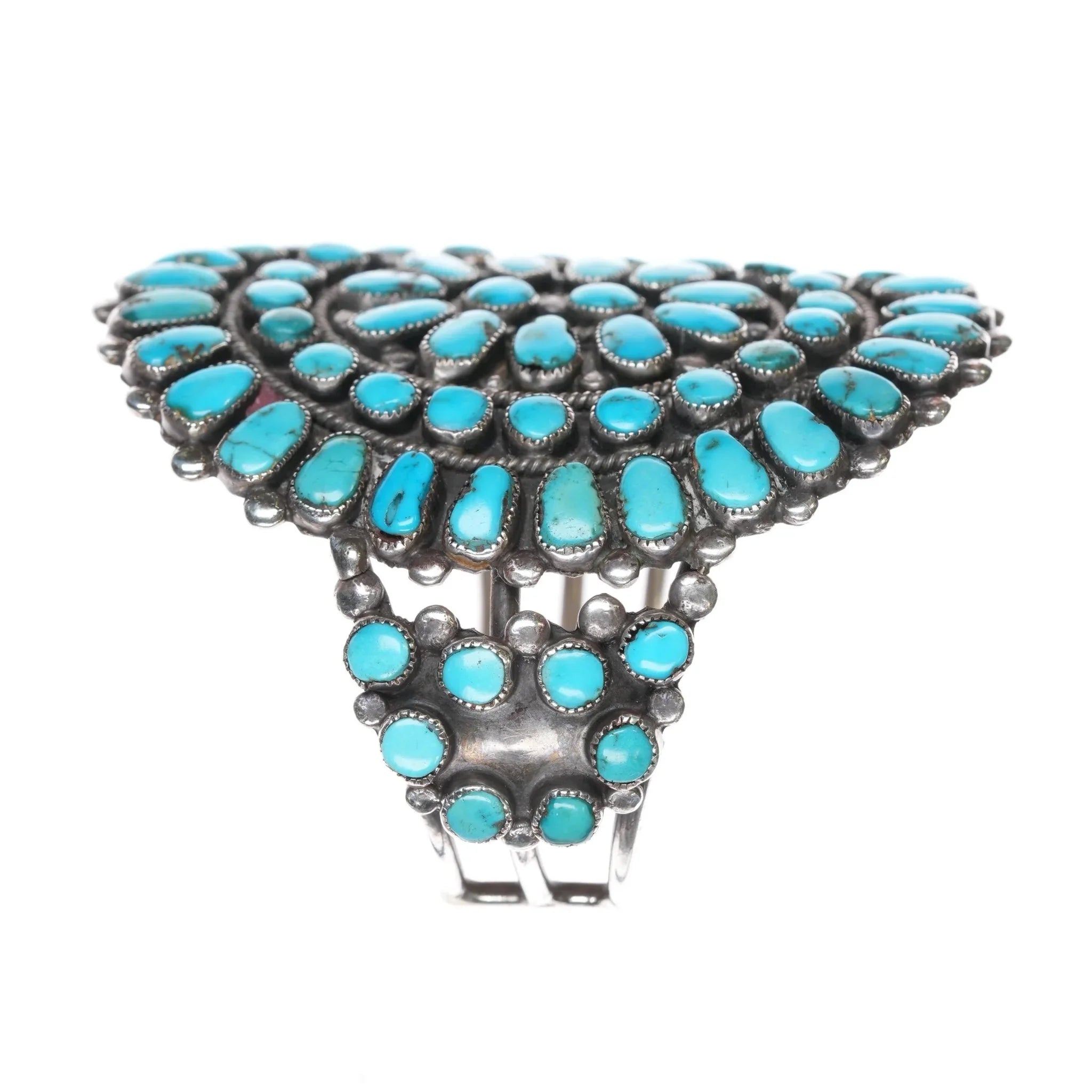 7" c1950‘s Native American silver Natural turquoise cluster cuff bracelet. Most likely Zuni, Solid sterling, unmarked as typical of this era (mid 20th century). Weight and measurements in pics.