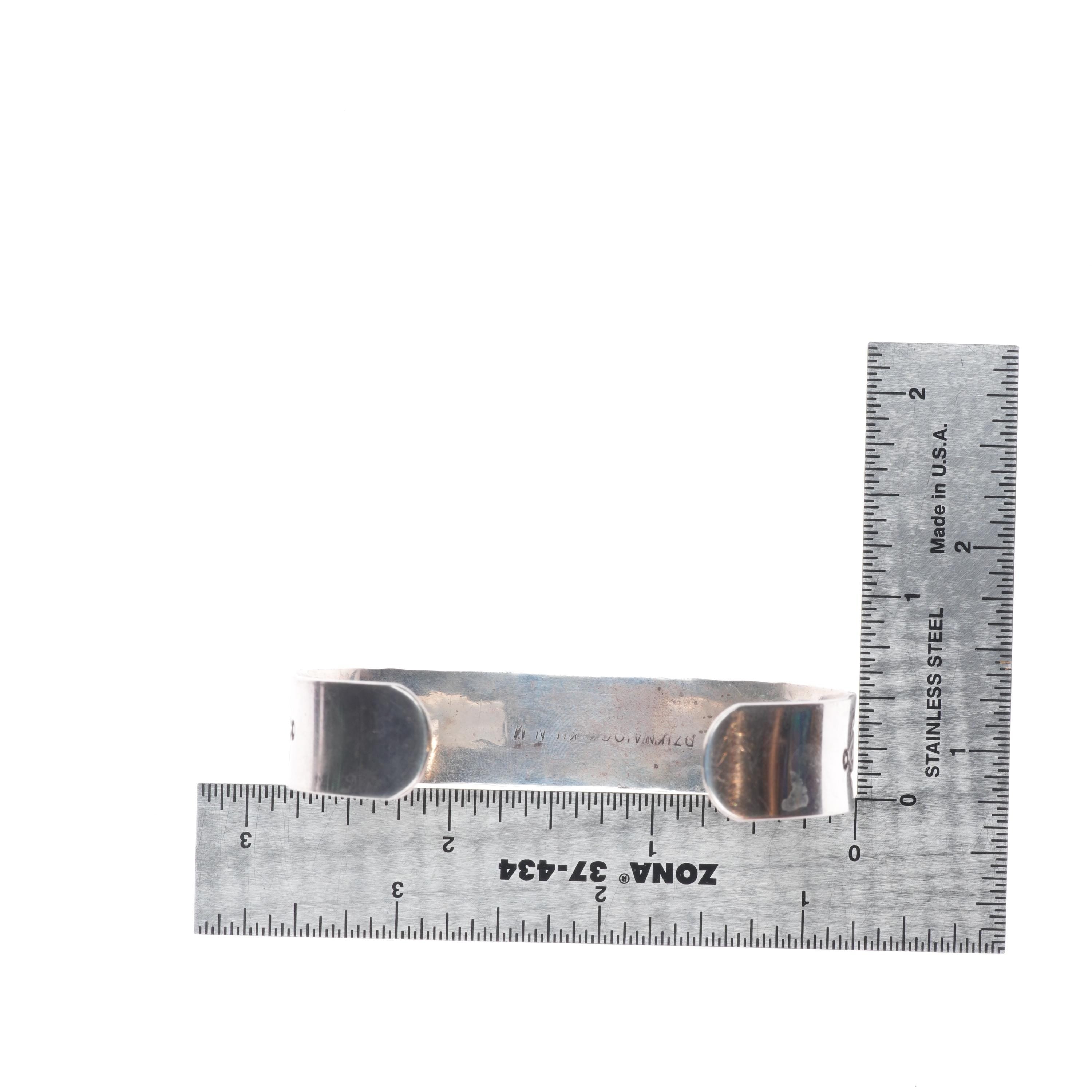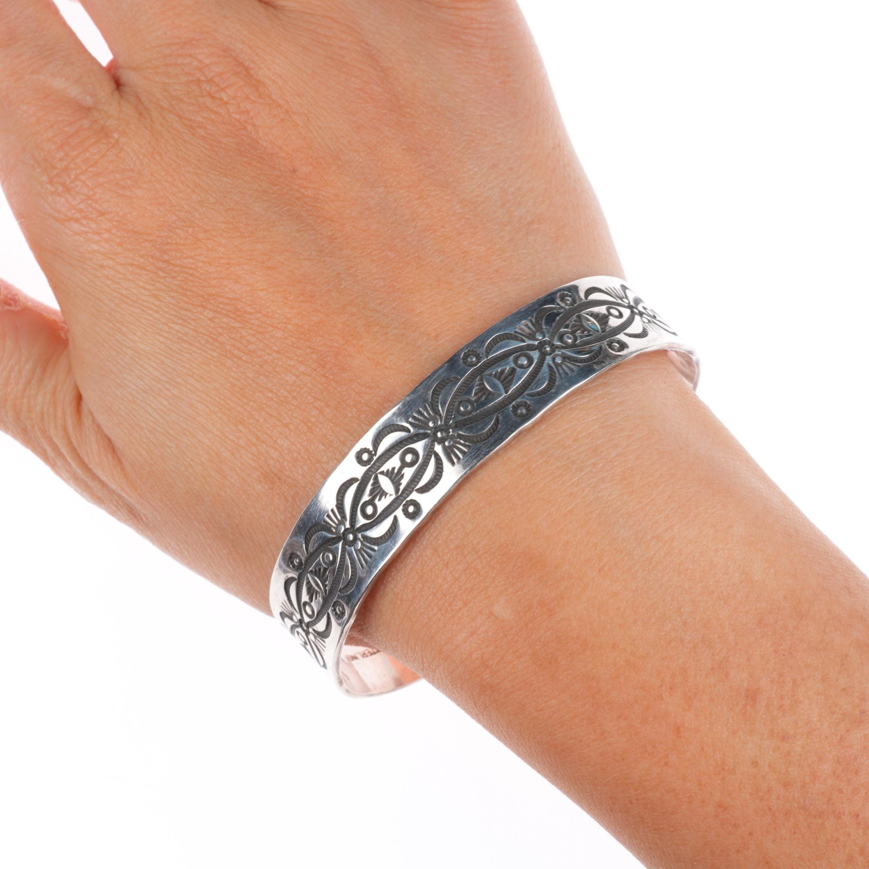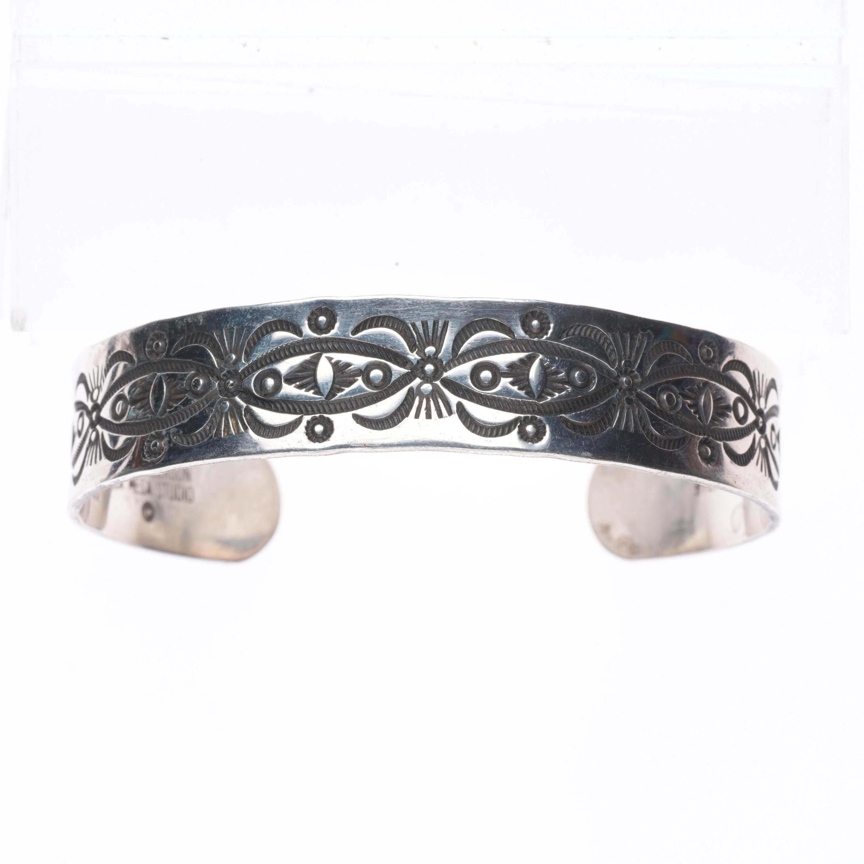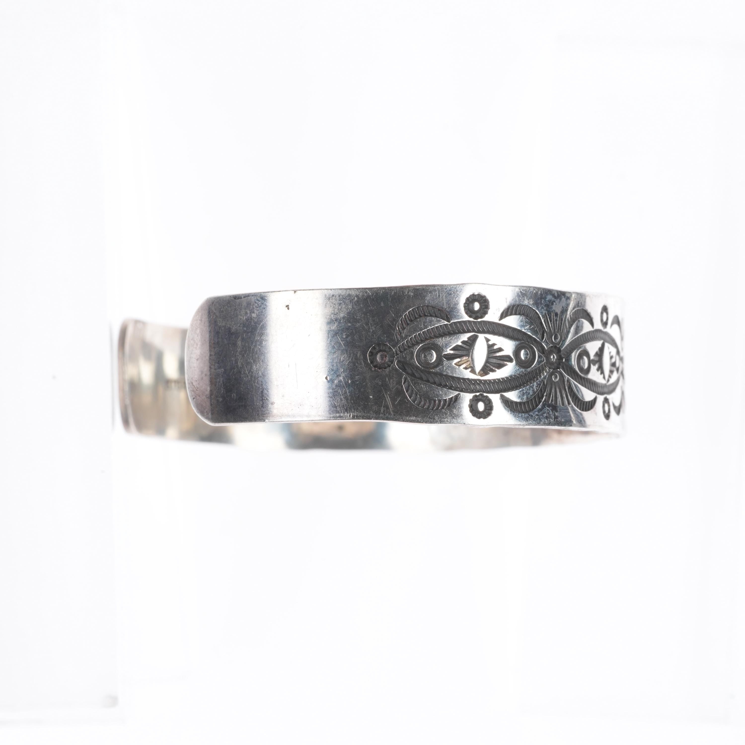 7" Dzilth Na O Dith Hle NM Navajo sterling silver hand stamped cuff bracelet. Tested and guaranteed solid sterling silver with weight and measurements in pictures. Circa third quarter of the 20th century with age appropriate wear..