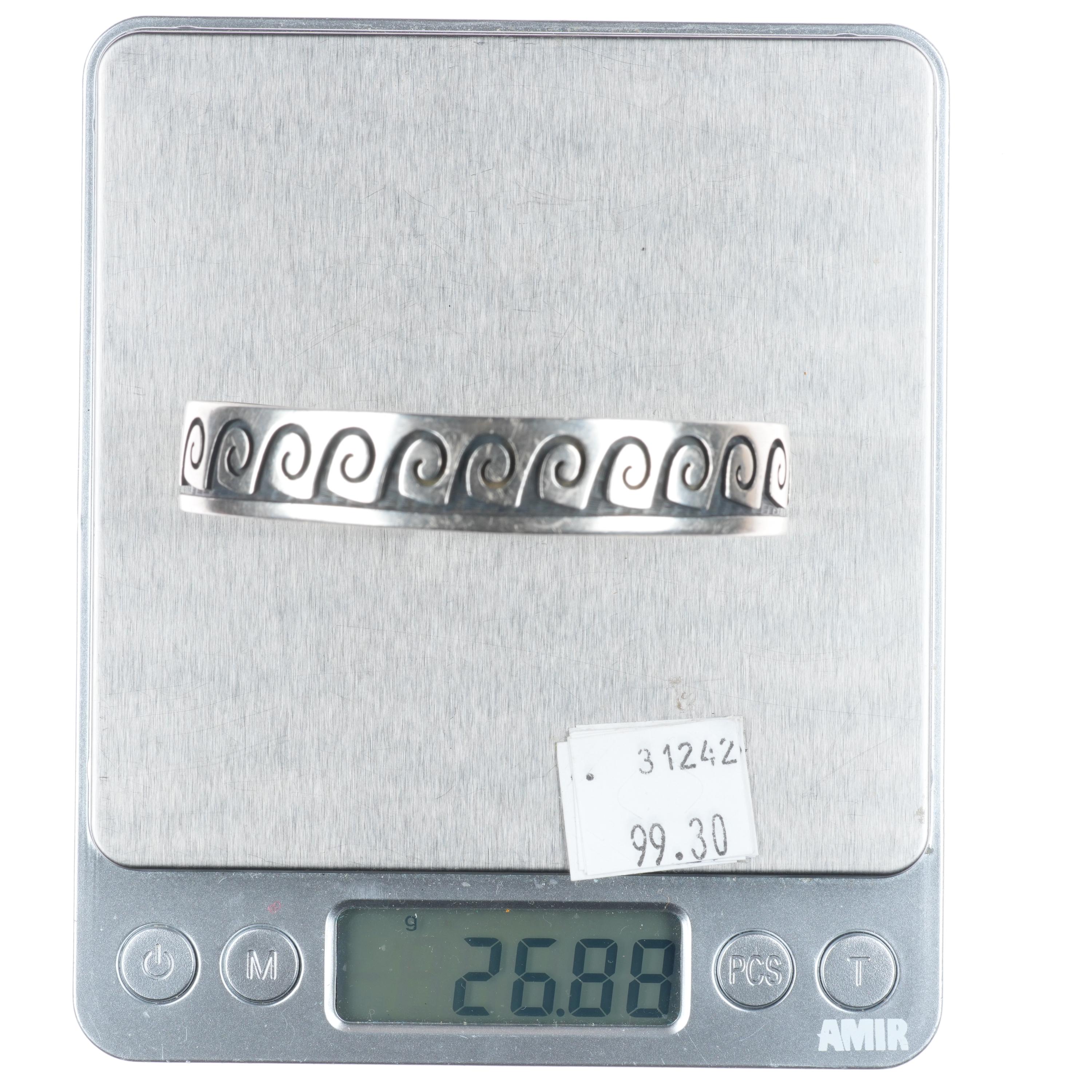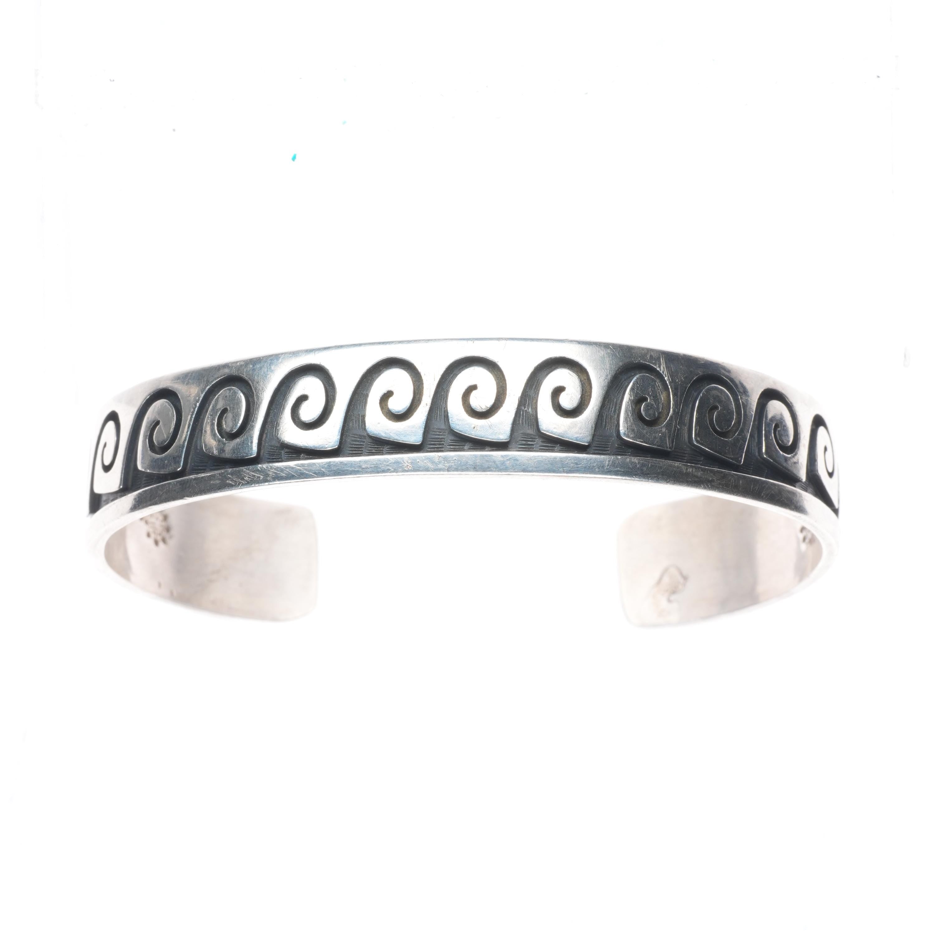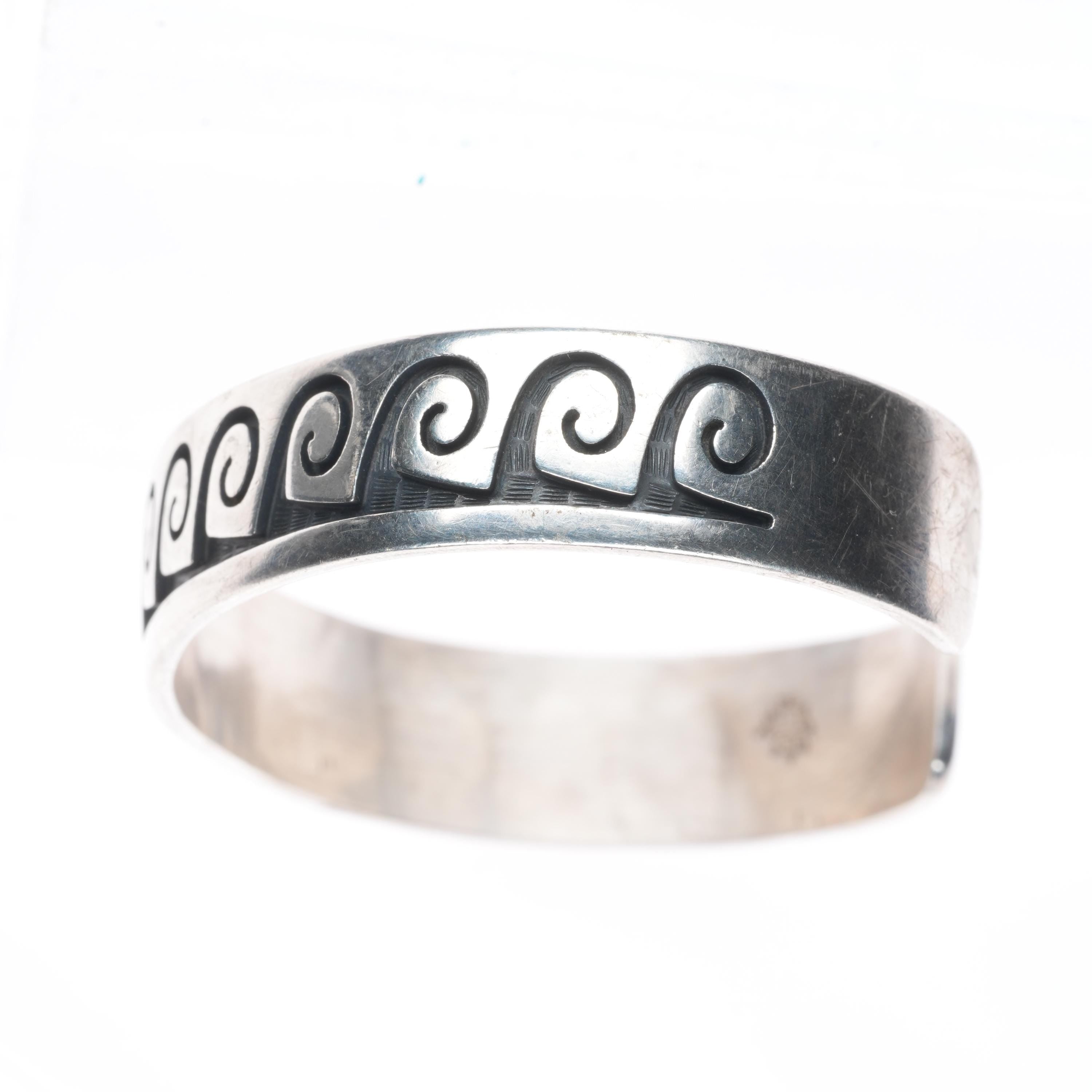 7" Gene Pooyouma Hopi Overlay water/wave sterling silver cuff bracelet. Tested and guaranteed solid sterling silver with weight and measurements in pictures. Circa fourth quarter of the 20th century. Fits up to a 7" wrist without adjustment, though .25" or more of careful adjustment is typically very simple. Any adjustment will change the gap size of course which is shown in the pictures.
