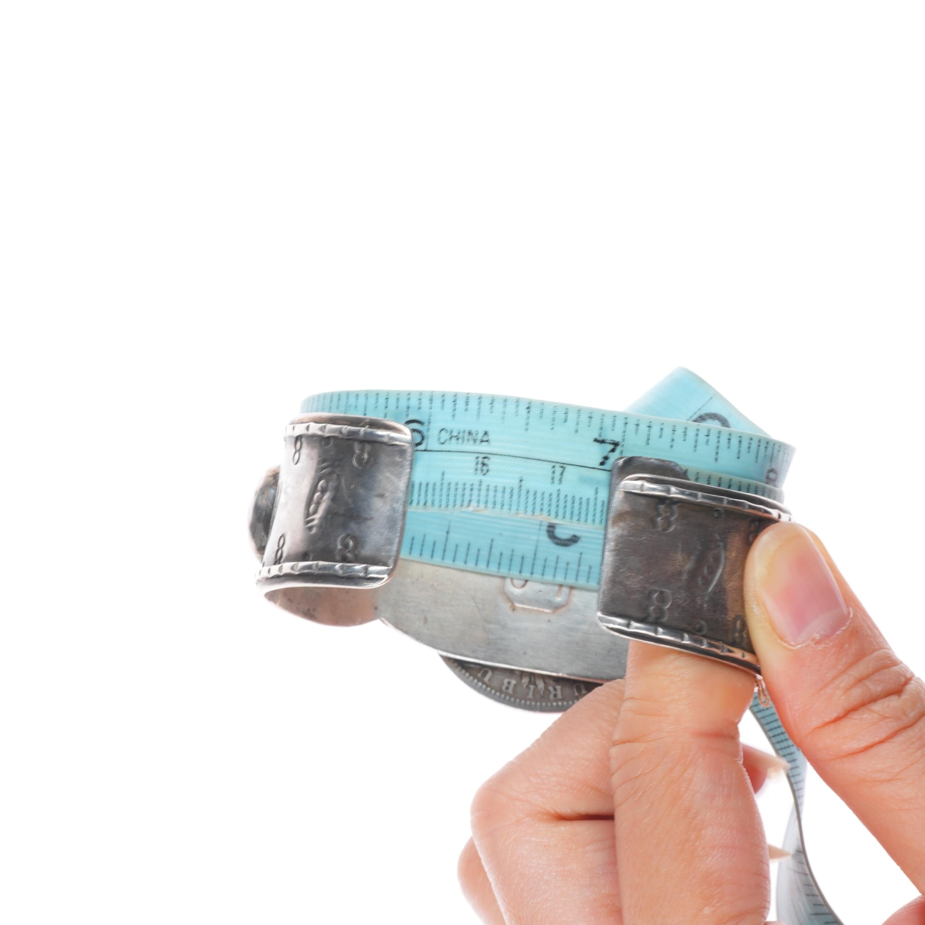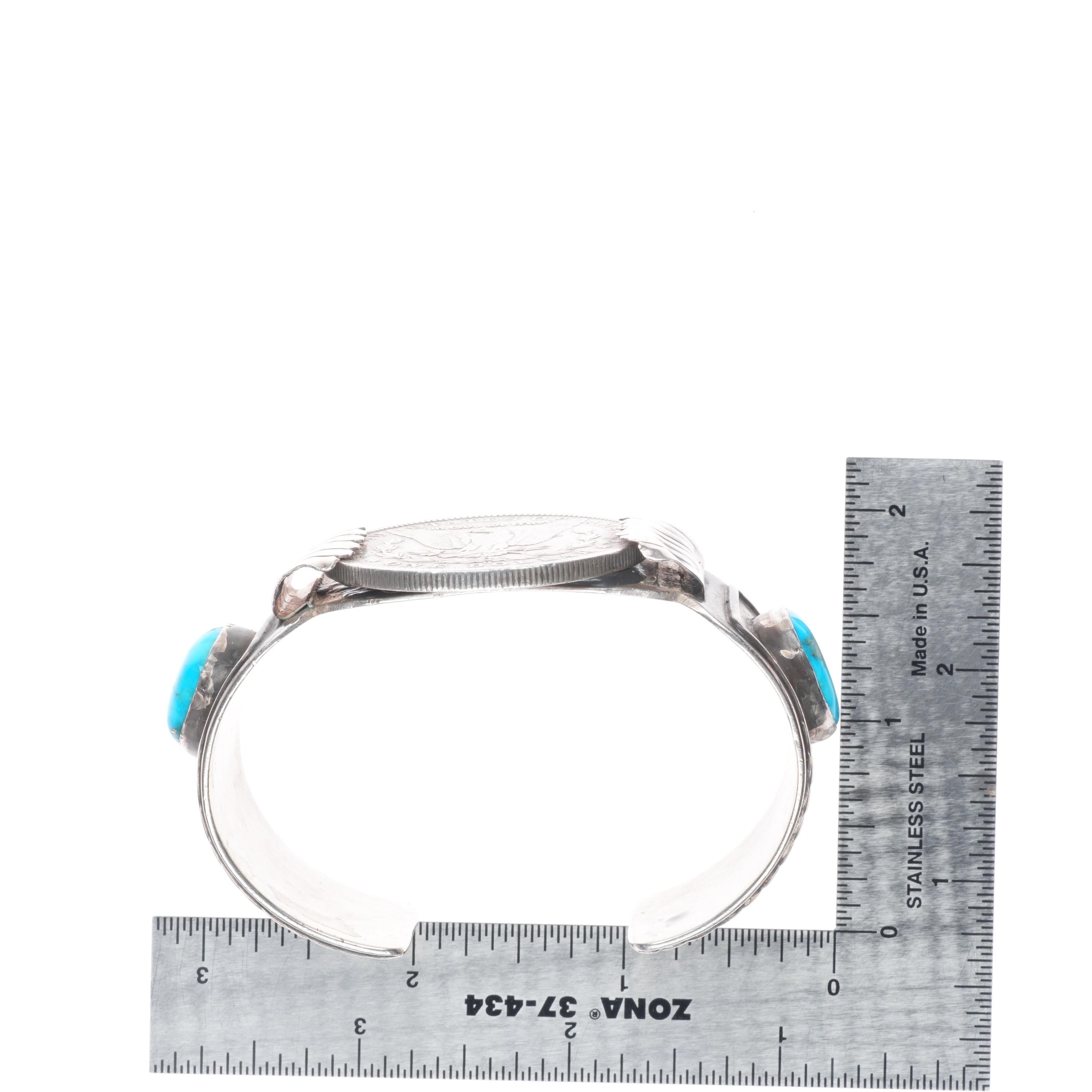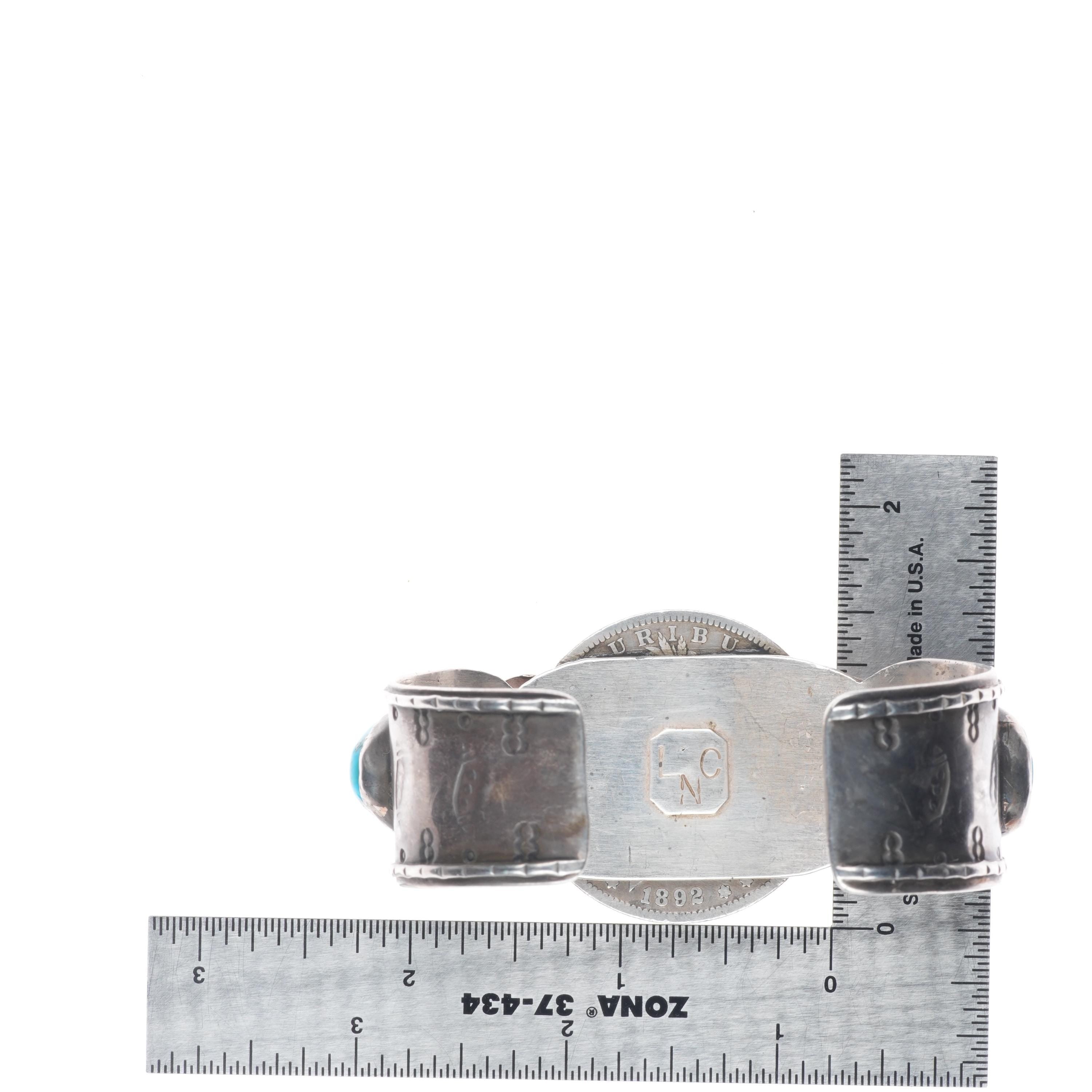 7" Vintage Navajo sterling silver cuff bracelet with turquoise dollar coin. Tested and guaranteed solid sterling silver with weight and measurements in pictures. Circa third quarter of the 20th century. Fits up to a 7" wrist without adjustment, though .25" or more of careful adjustment is typically very simple. Any adjustment will change the gap size of course which is shown in the pictures. This was once a watch cuff with the coin later put where the watch would go.