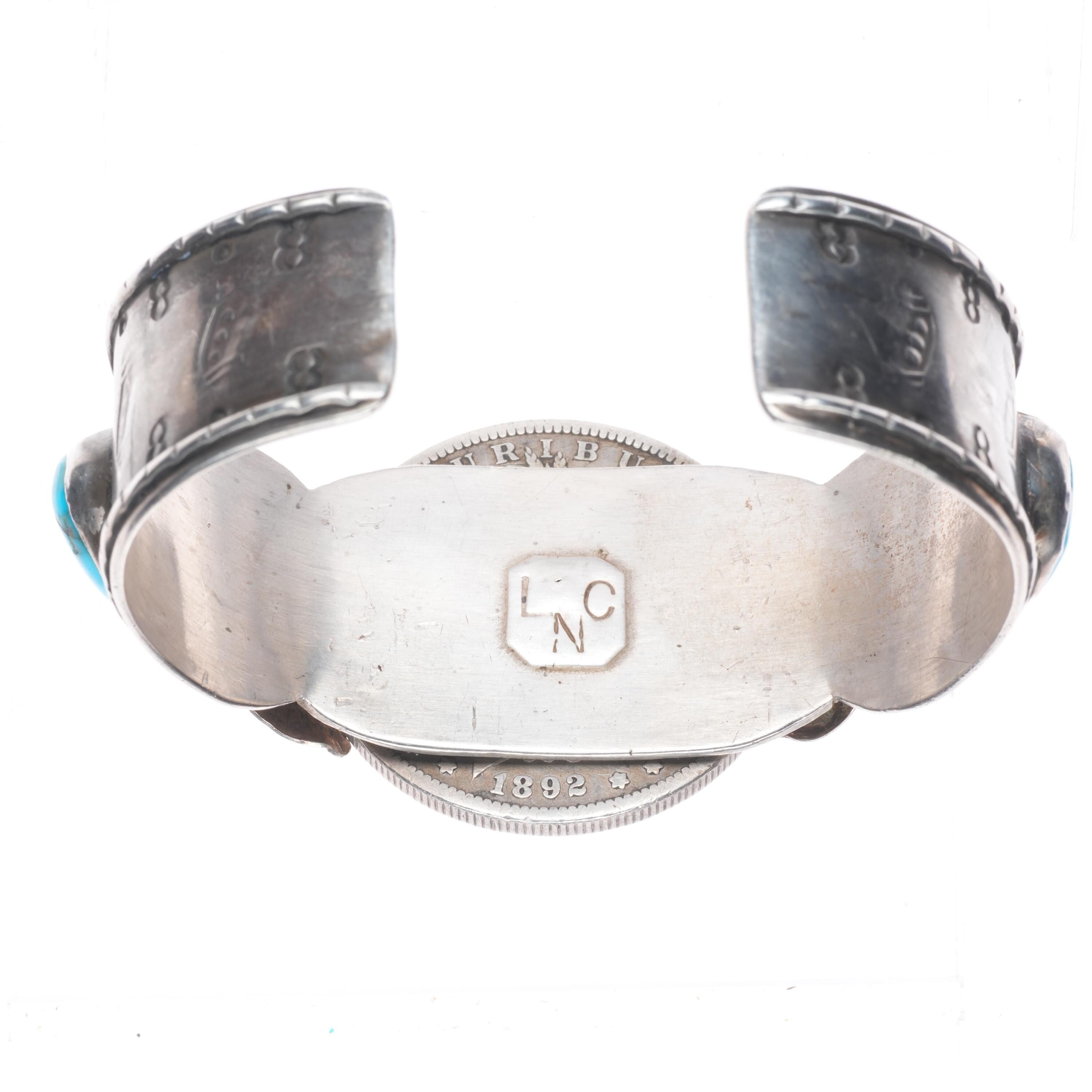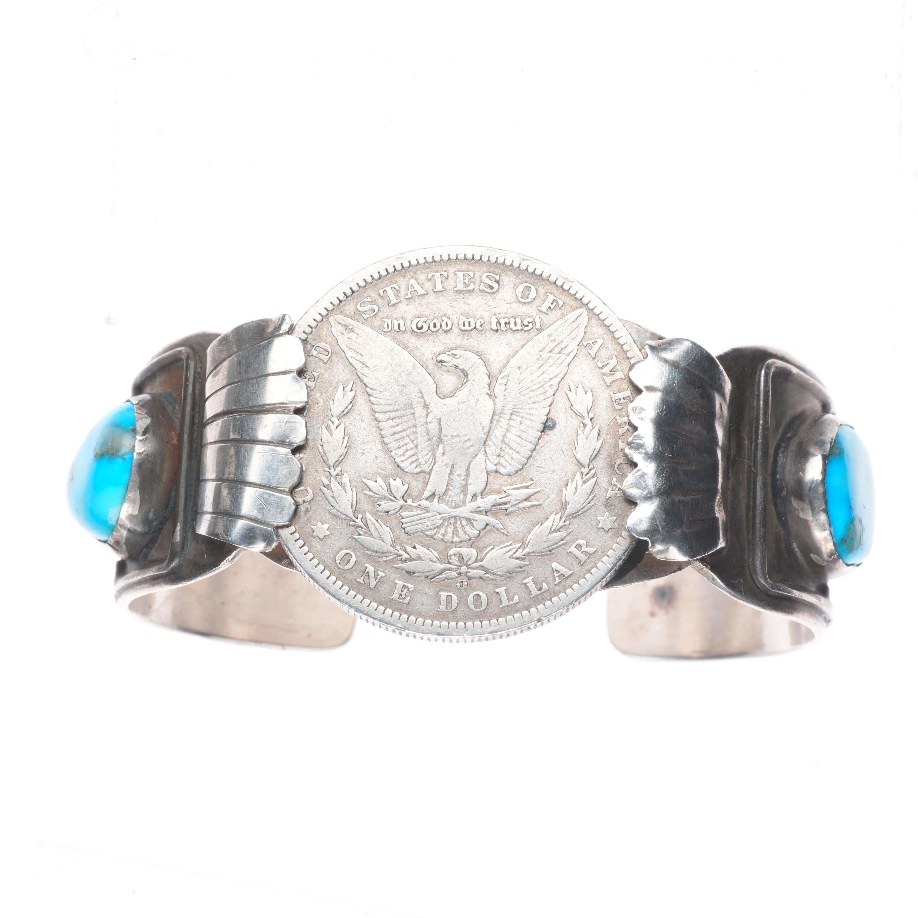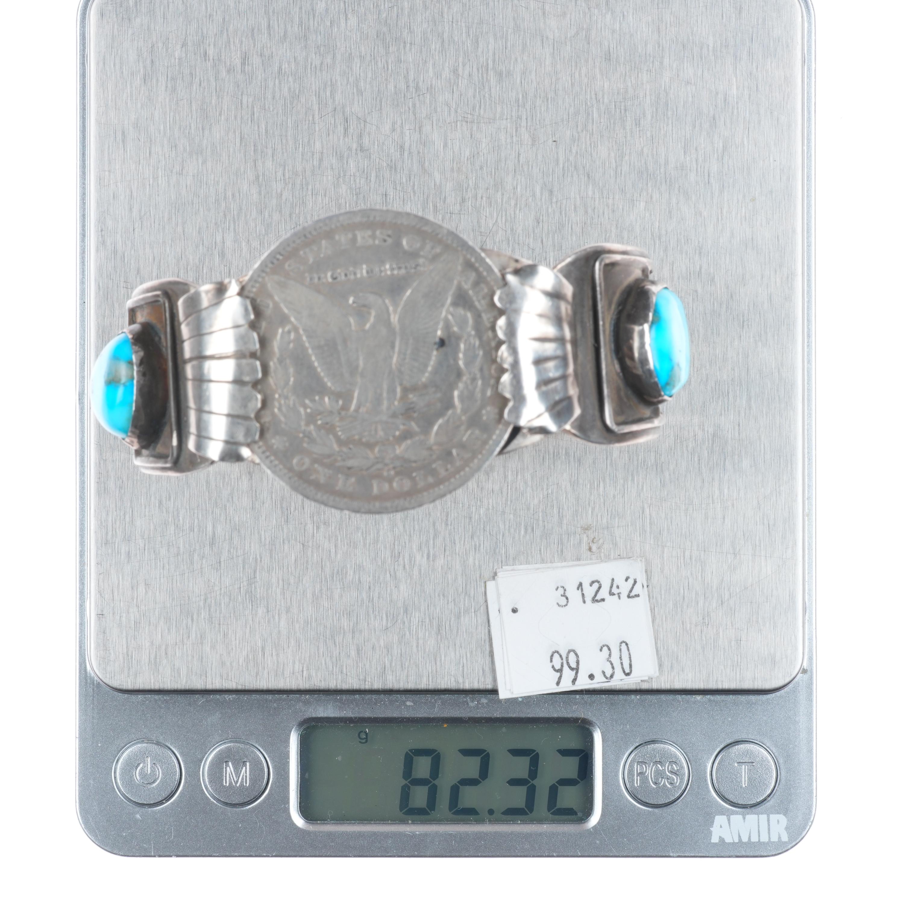 7" Vintage Navajo sterling silver cuff bracelet with turquoise dollar coin. Tested and guaranteed solid sterling silver with weight and measurements in pictures. Circa third quarter of the 20th century. Fits up to a 7" wrist without adjustment, though .25" or more of careful adjustment is typically very simple. Any adjustment will change the gap size of course which is shown in the pictures. This was once a watch cuff with the coin later put where the watch would go.