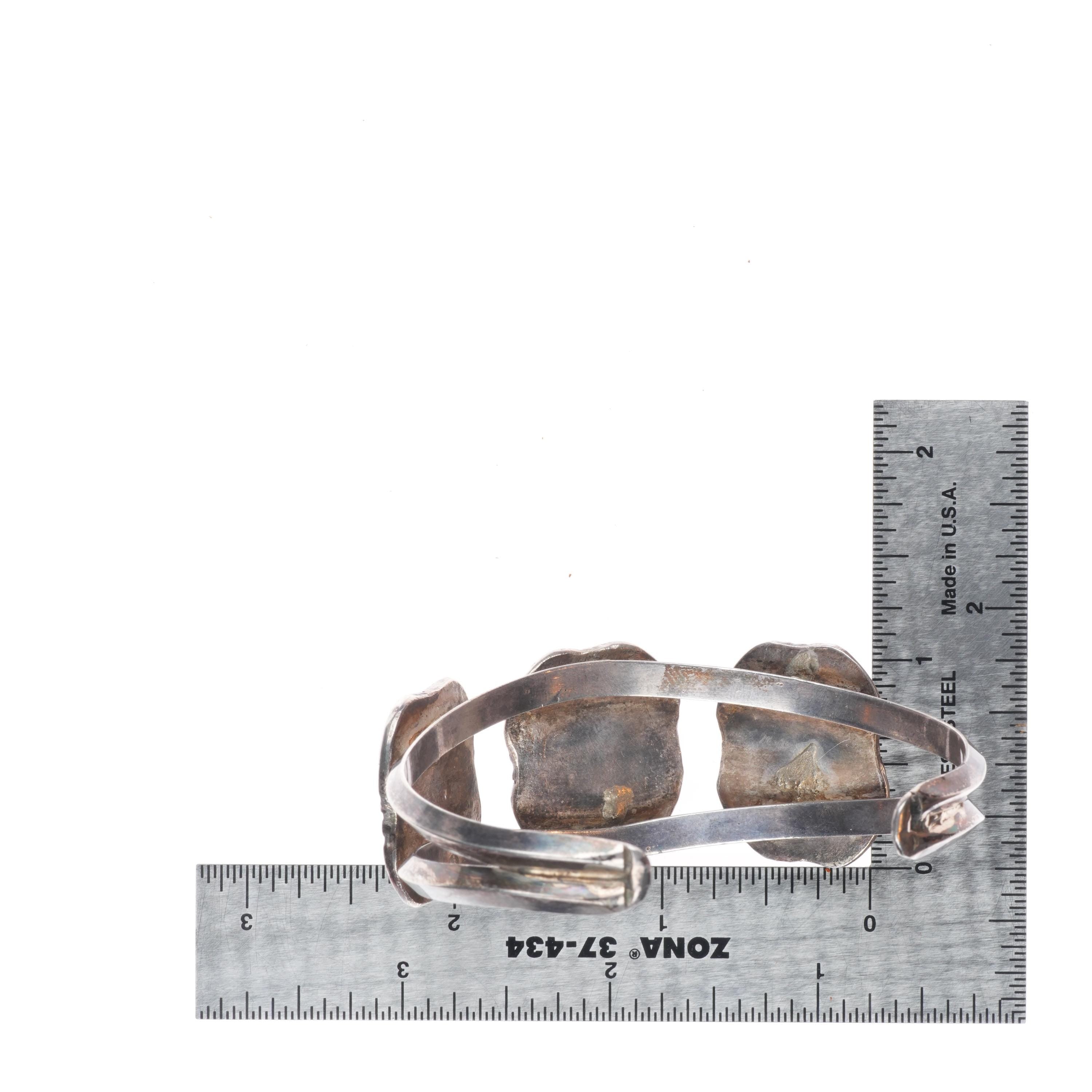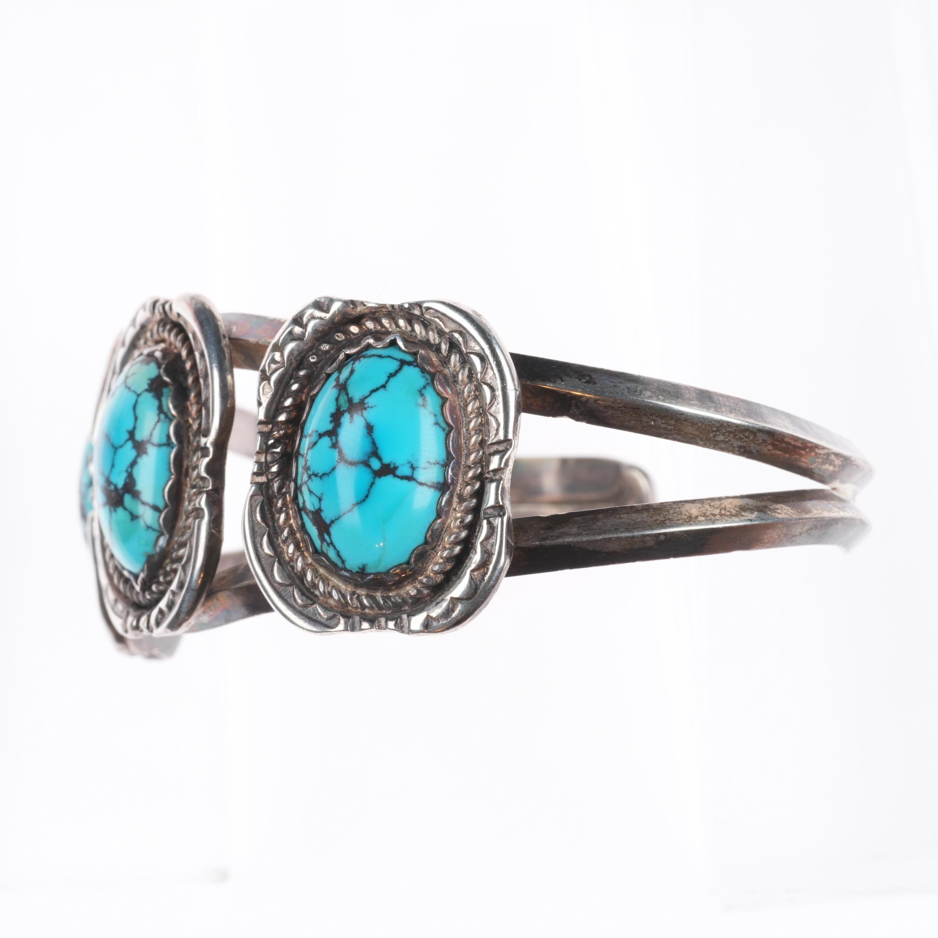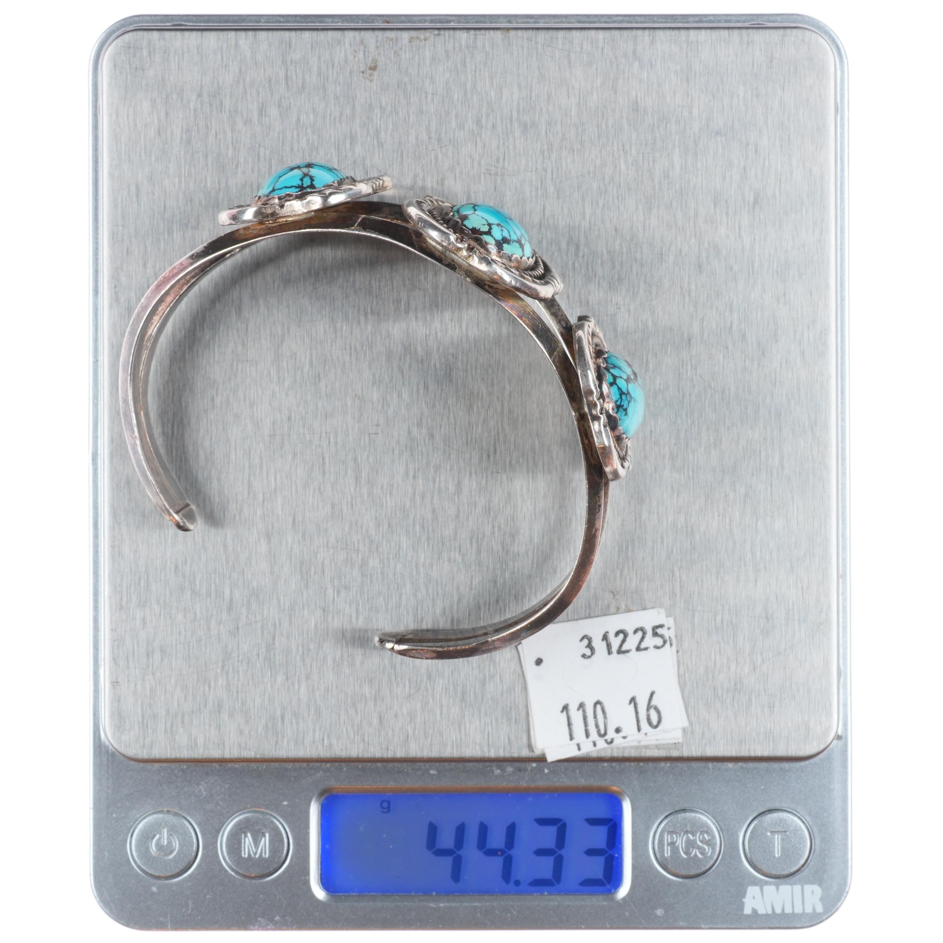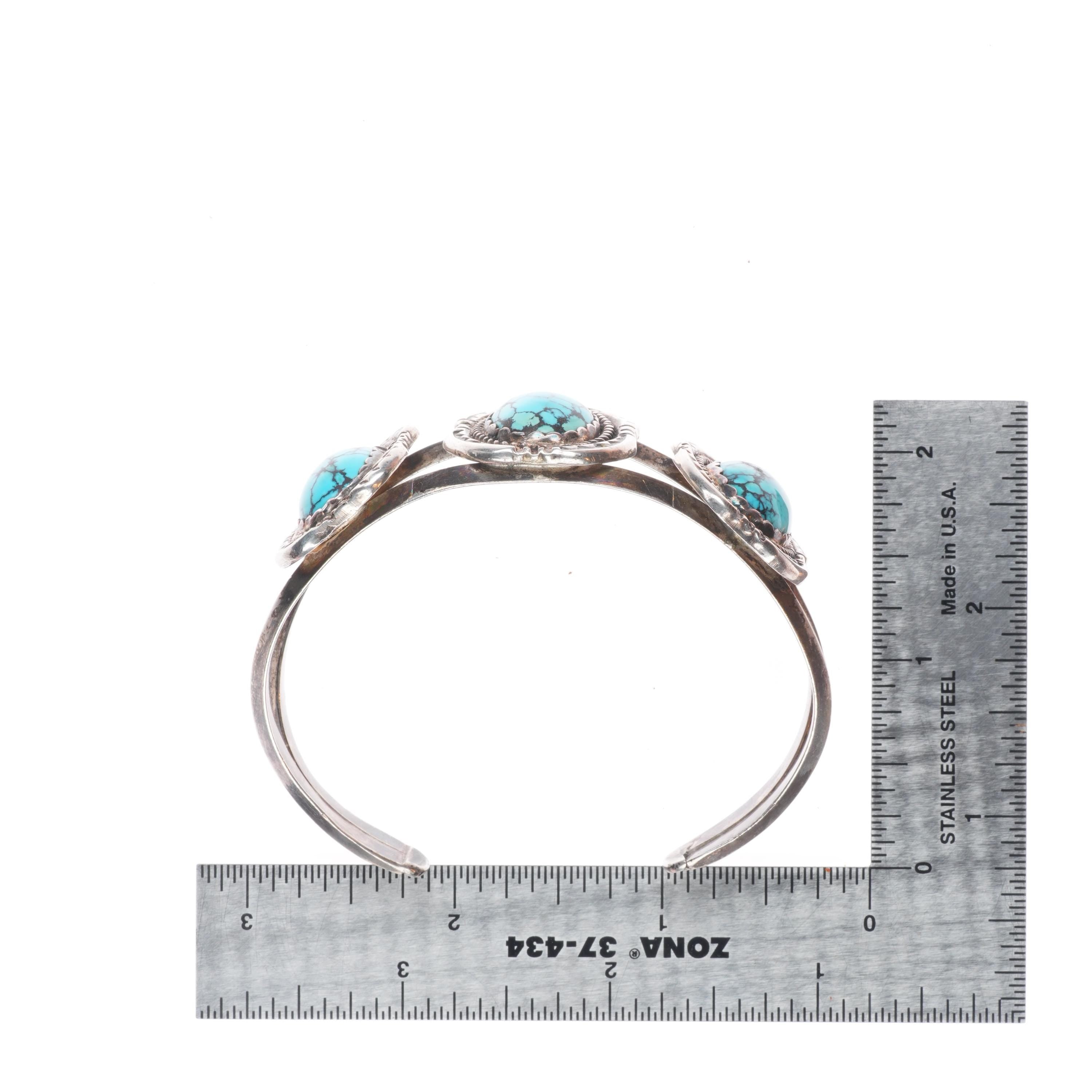 7" Vintage Navajo sterling silver spiderweb turquoise 3 stone cuff bracelet. Tested and guaranteed solid sterling silver with weight and measurements in pictures. Circa third quarter of the 20th century with age appropriate wear.. No apparent markings.