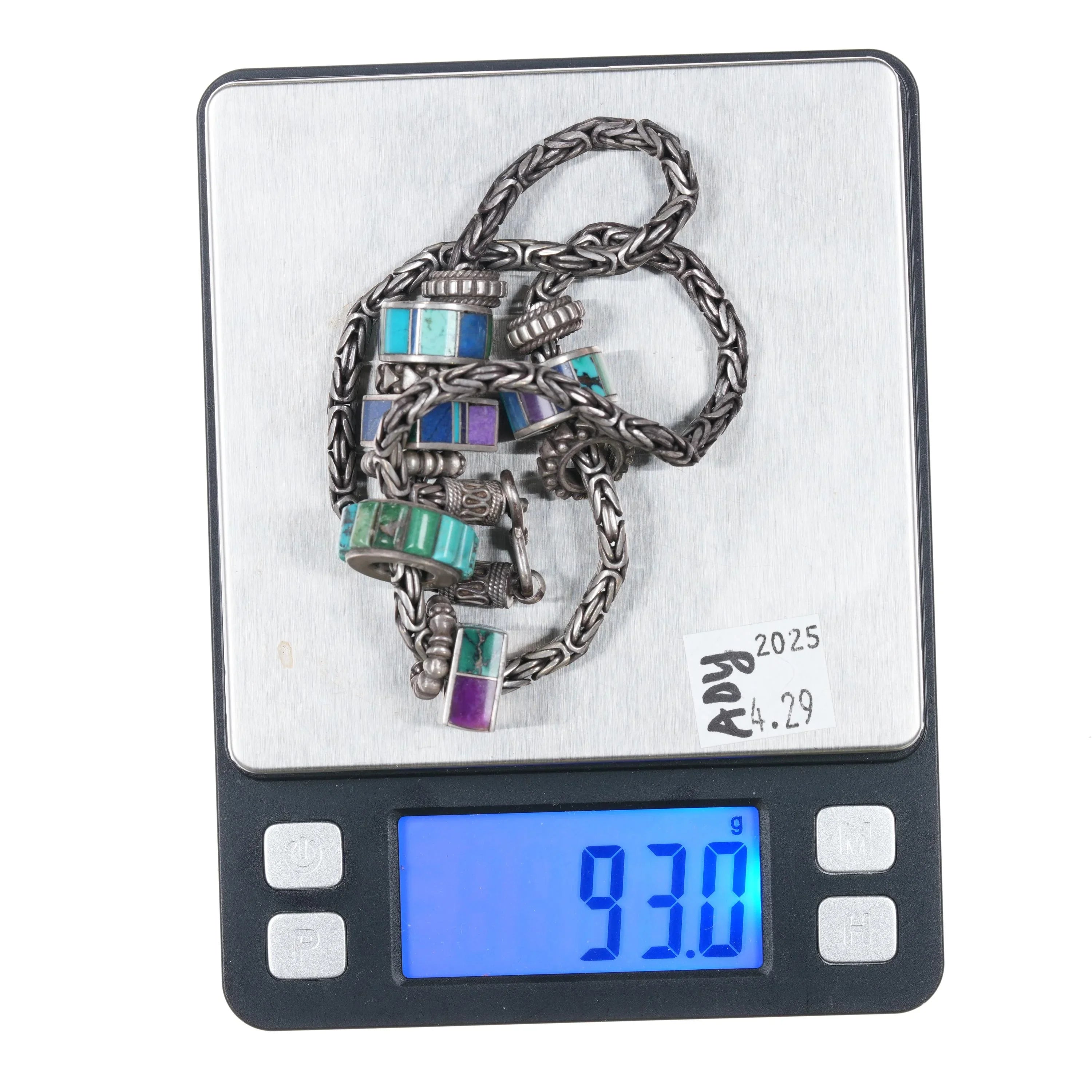 90‘s Santa Fe Sterling silver, Sugilite, turquoise, lapis inlay beaded necklace. Weight and measurements in pics, all solid sterling. NO issues. Unresearched by me unsigned in any way, incredible piece 18" long necklace. Very high quality piece from an extremely high quality collection put together in the 90‘s. These inlaid slide beads are very unusual and amazing. The necklace looks Balinese but high quality. I didn‘t have time to try to idenify much of it as there just is no time, but the pieces I did recognize were all from very high end mostly Santa Fe, New Mexico artists. It was all collected on trips to Santa Fe in the 90‘s.