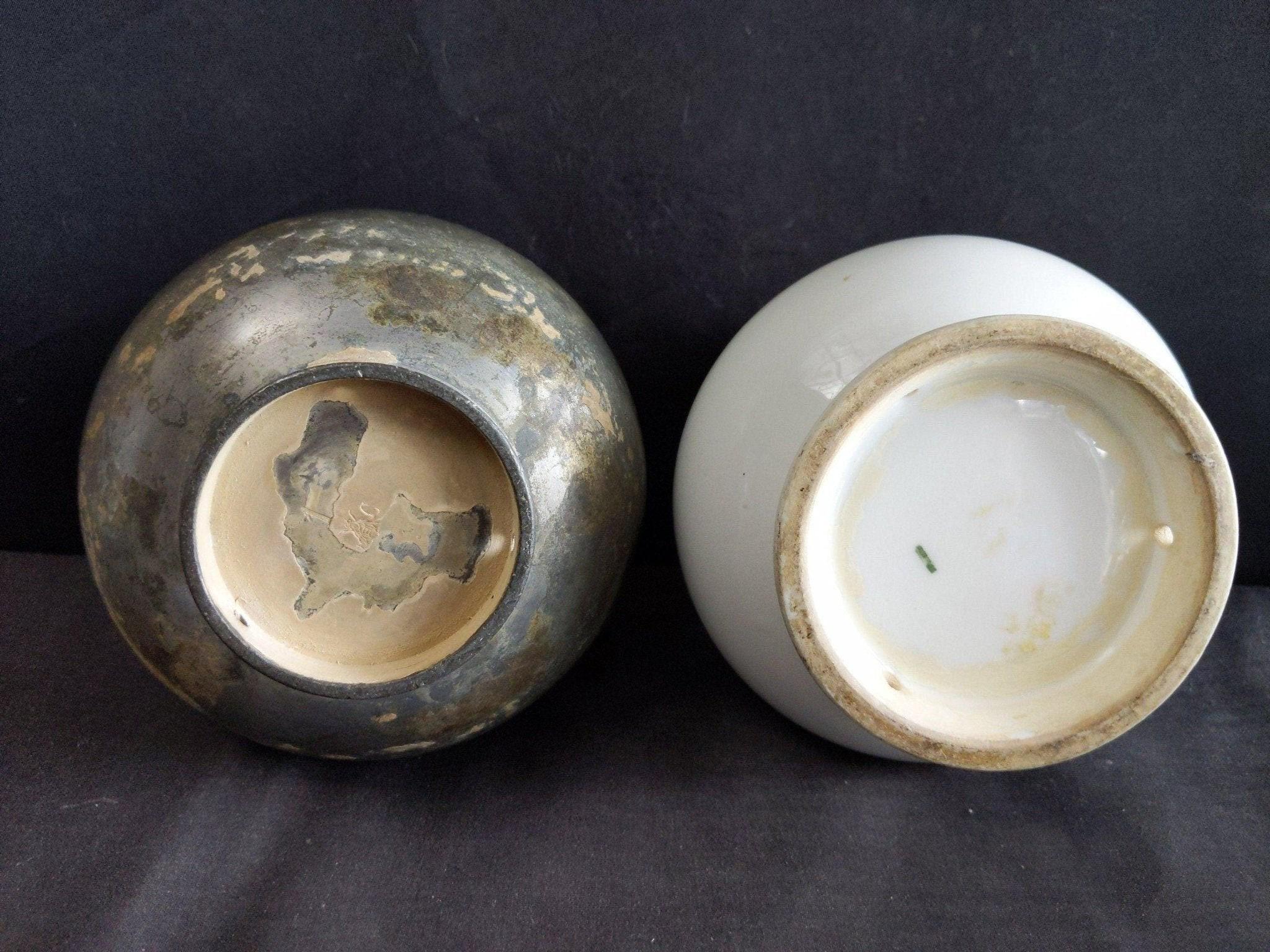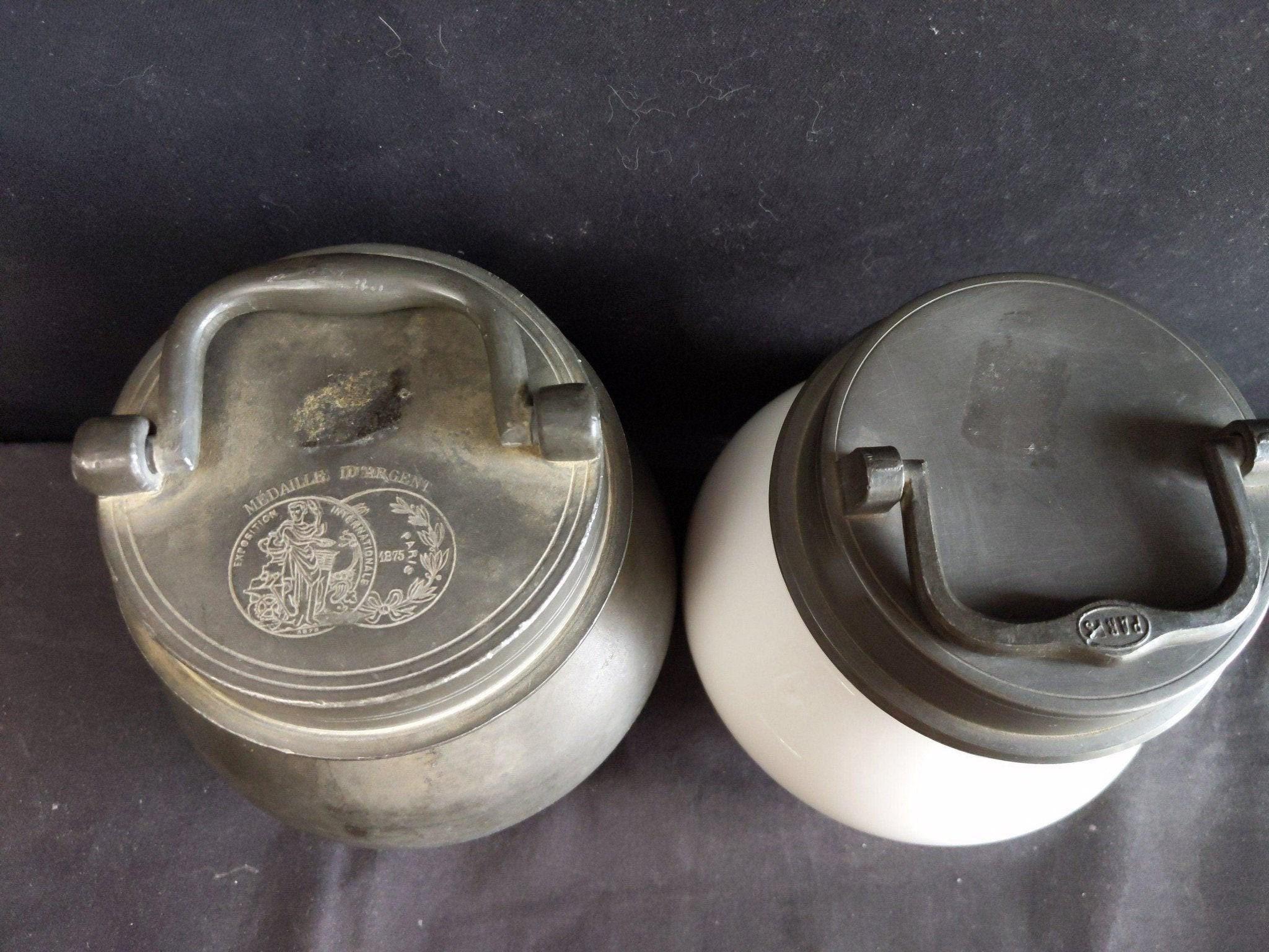 Antique French pewter Sustenteur Medical Apothecary Jars for Sterilization both<br>6" tall x 5" wide. Both guaranteed 19th century.<br>I have found that this style of jar, called Sustenteur, was popular in France in<br>the late 18th century, and were created as a piece of medical equipment to help<br>heal stomach problems. They work as pressure cookers and they were used to<br>prepare either meat or vegetable broths, which were cooked in a hermetically<br>sealed pot for hours in a water bath, thus providing a germ-free broth for<br>people with delicate stomachs. There are three holes at the base of the pot.<br>When oxygen would escape form the boiling water, it made bubbles, and the holes<br>allowed the bubbles to escape, so the pot would not tip over. The handle at the<br>top of the pewter cap allowed the pot to be easily removed from the water bath<br>and carried. Given that they are air-tight, these sustenteurs were also used as<br>tobacco jars, tea caddies, or coffee containers.<br>Tw31