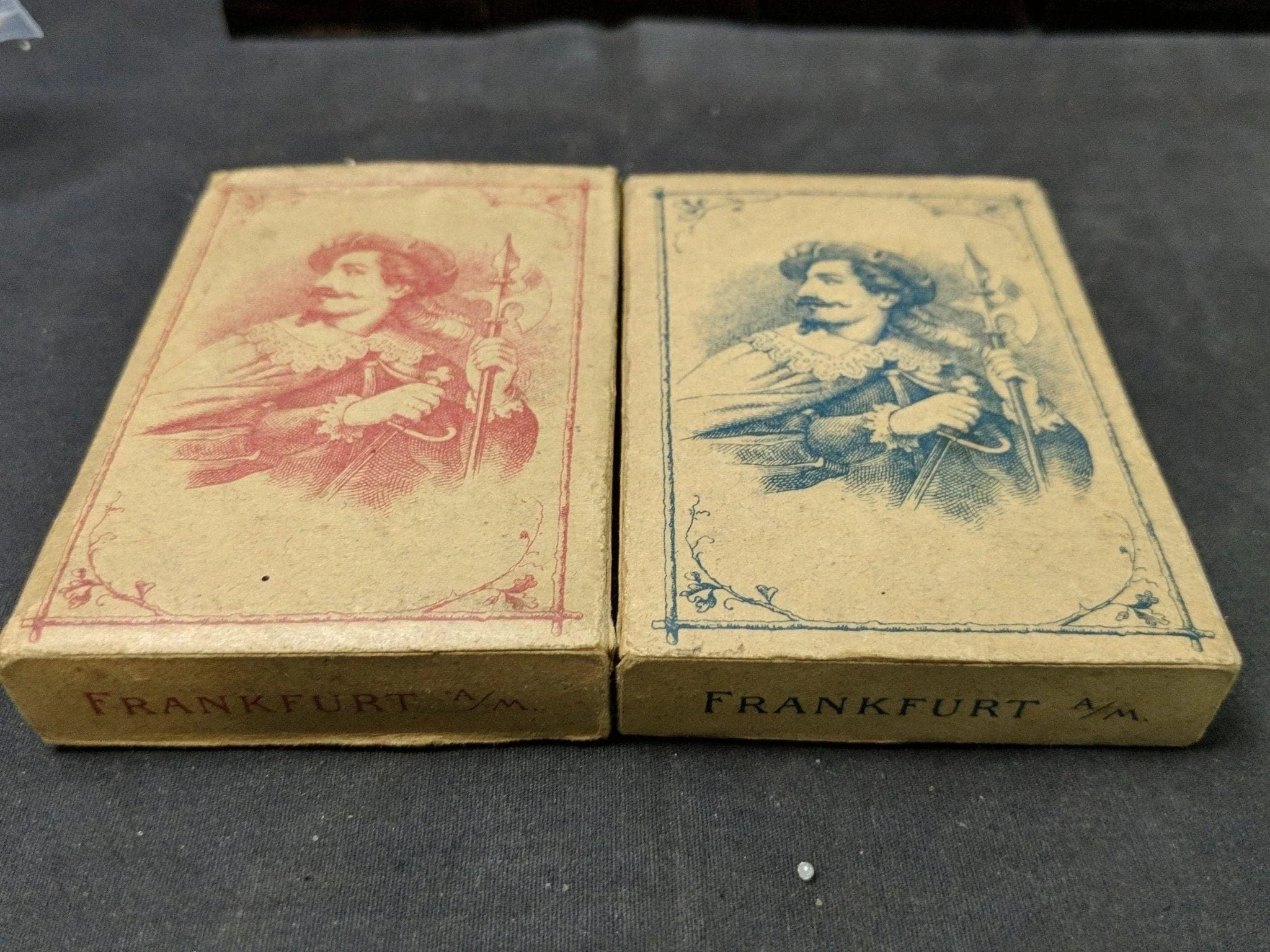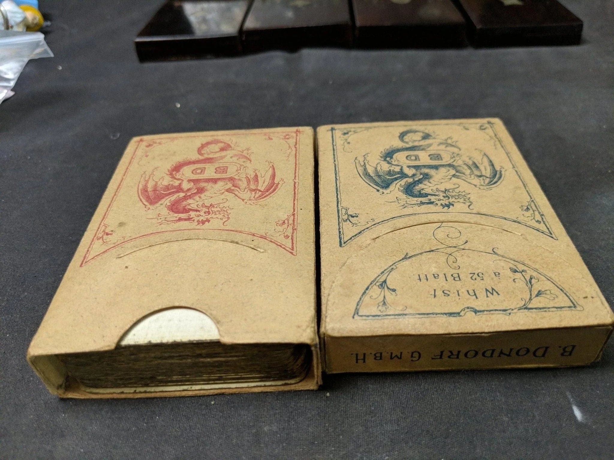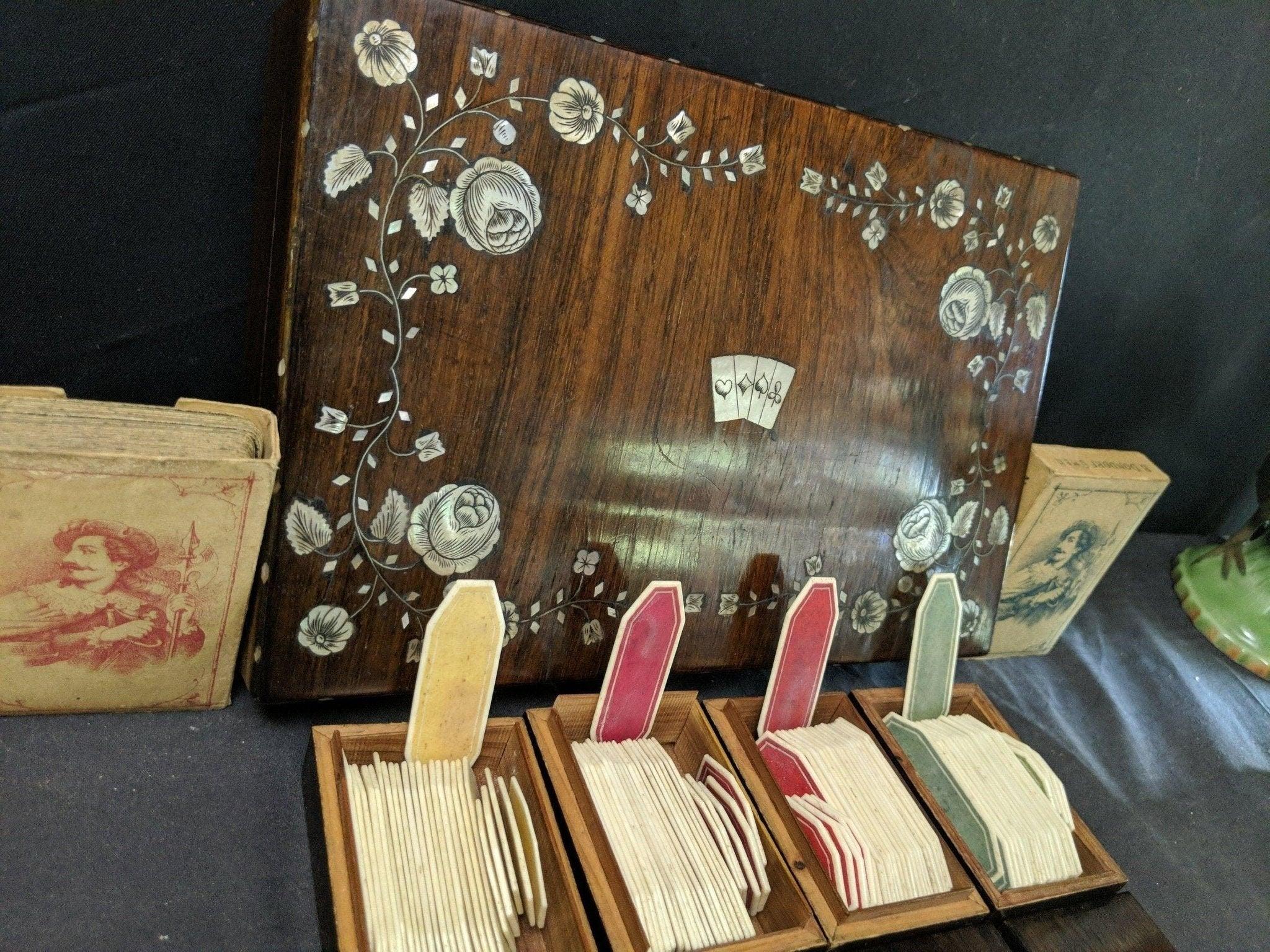 Antique Gambling Whist Set in Mother of Pearl Marquetry Box. Appears complete.<br>52 cards in each deck. Some wear to cards, but good condition for their age,<br>flap missing on one card box. I believe the box and pieces to be circa 1870's. I<br>don't know enough about cards to guarantee them that old, but they are very old.<br>Box measures 6 7/8" x 10 1/8" x 2.25". Large box is in good condition with thin<br>cracks in verneer. Small boxes that hold markers missing some of the top pieces<br>that hold lids on.