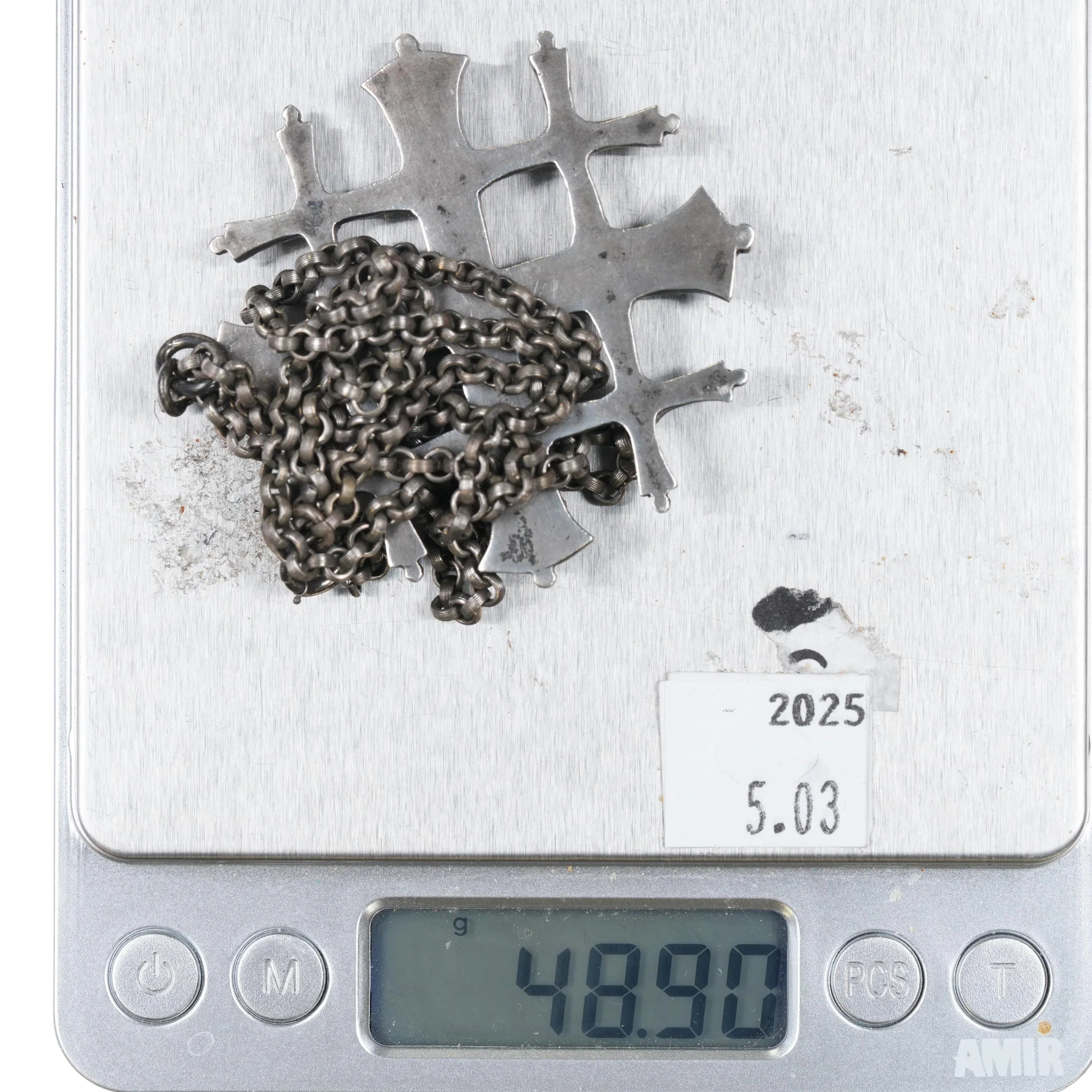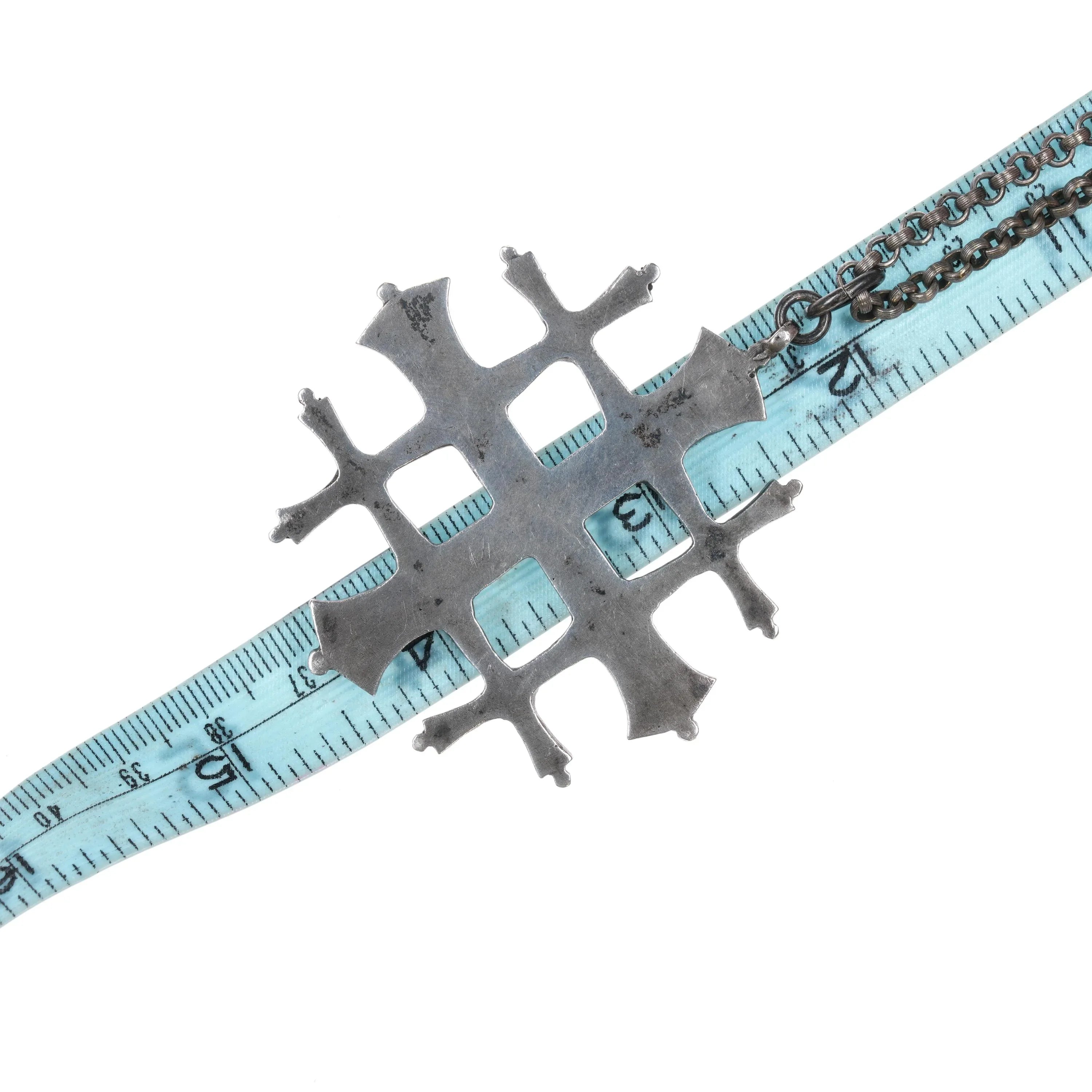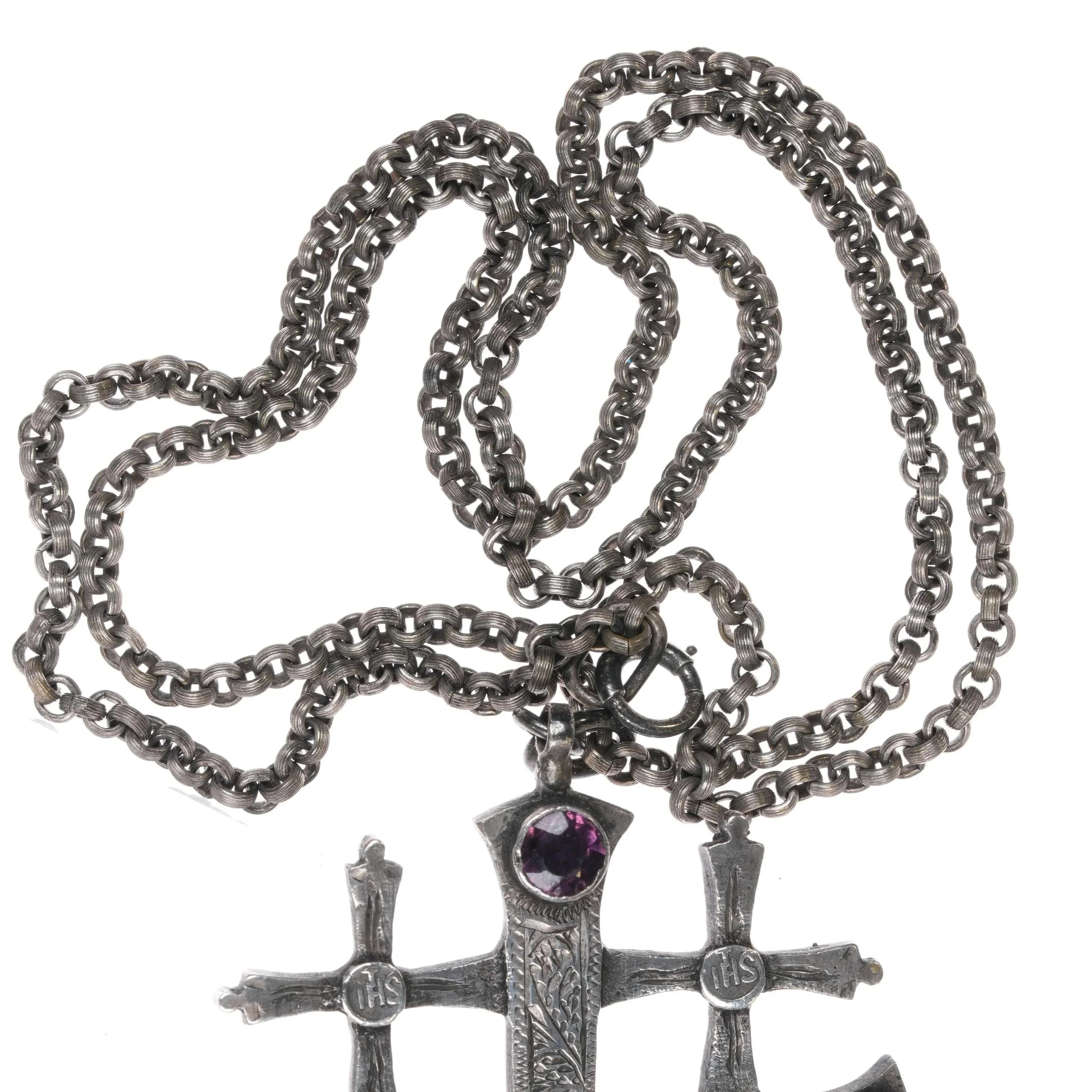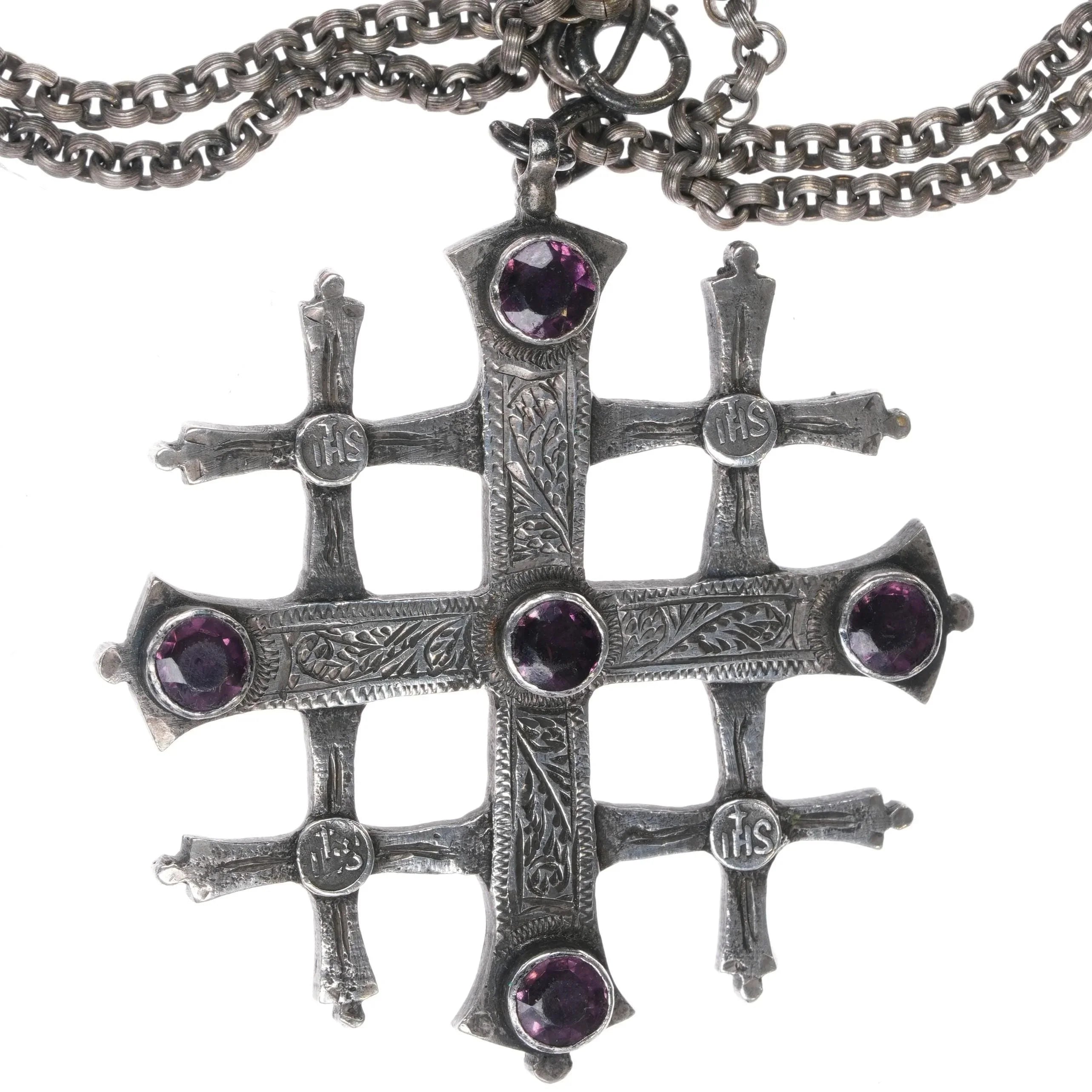 Antique Sterling silver Hand engraved Amethyst Jeruselum cross pendant necklace. Circa first quarter of the 20th century, pendant possibly older and unmarked. Mark shown in pics on necklace. Some minor wear to stones.