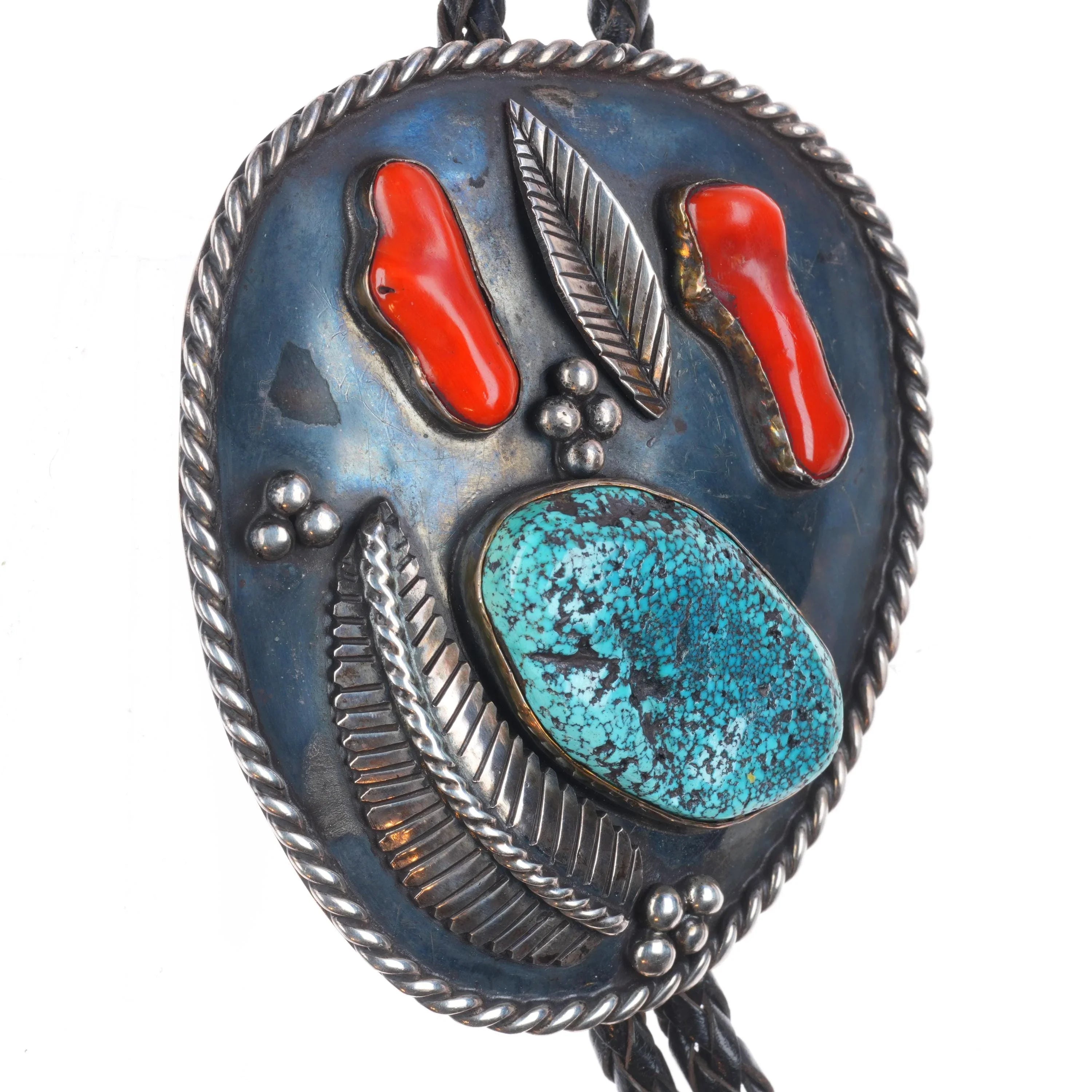 Big c1960 c-31 Navajo sterling silver spiderweb turquoise/coral bolo tie