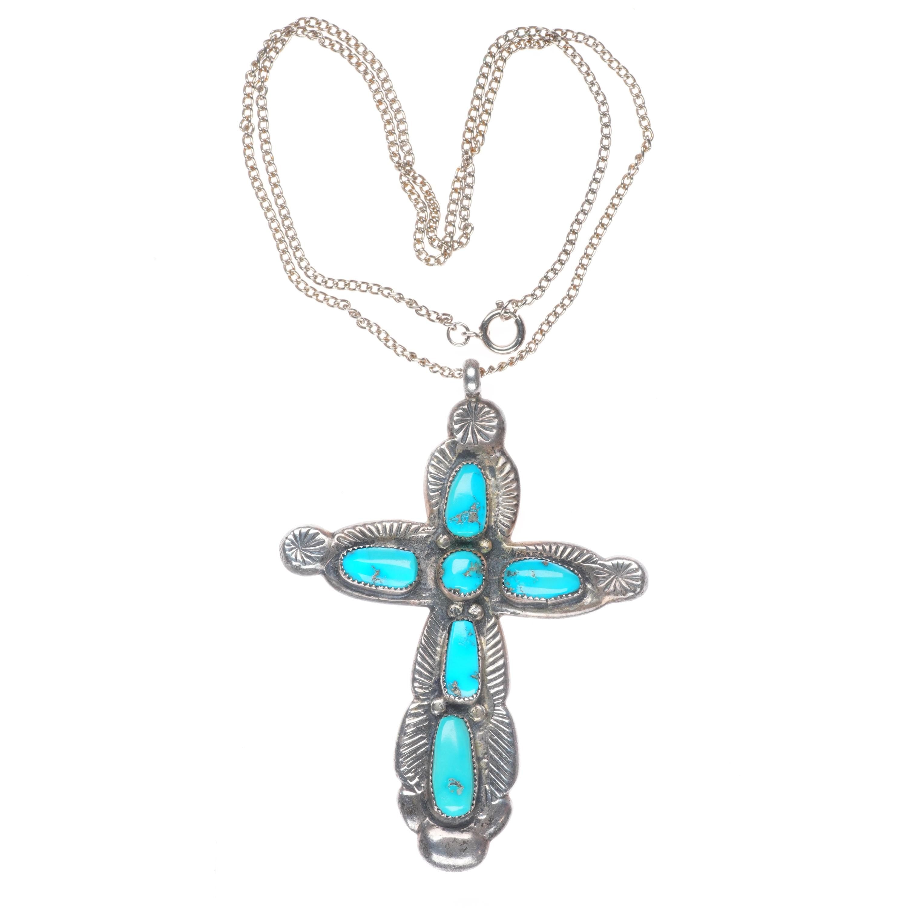 Big vintage Horace Iule Zuni filed/cast sterling silver turquoise cross pendant . Selling the necklace and pendant shown in good condition with weight and measurements in pictures. Tested and guaranteed solid sterling silver.