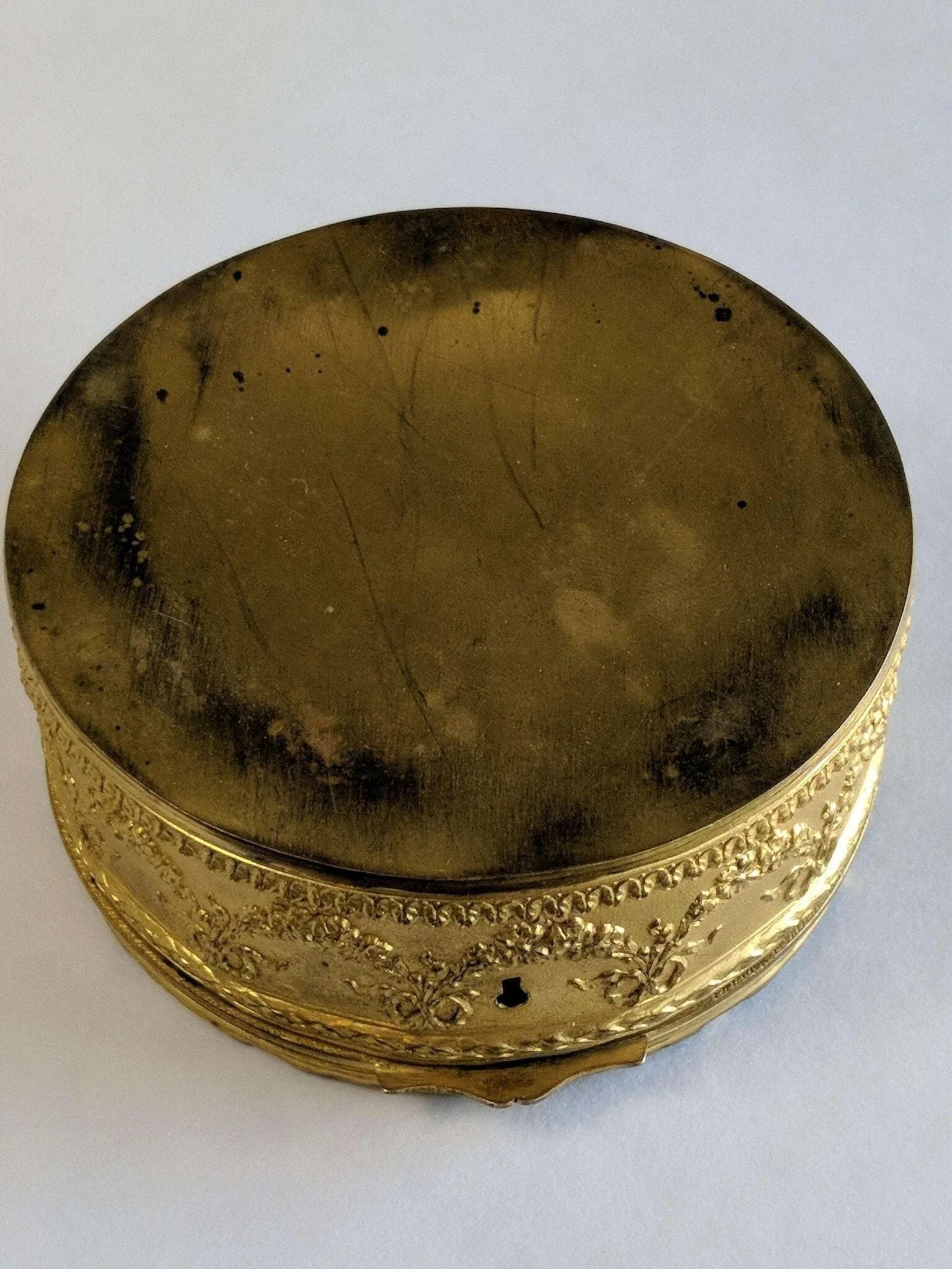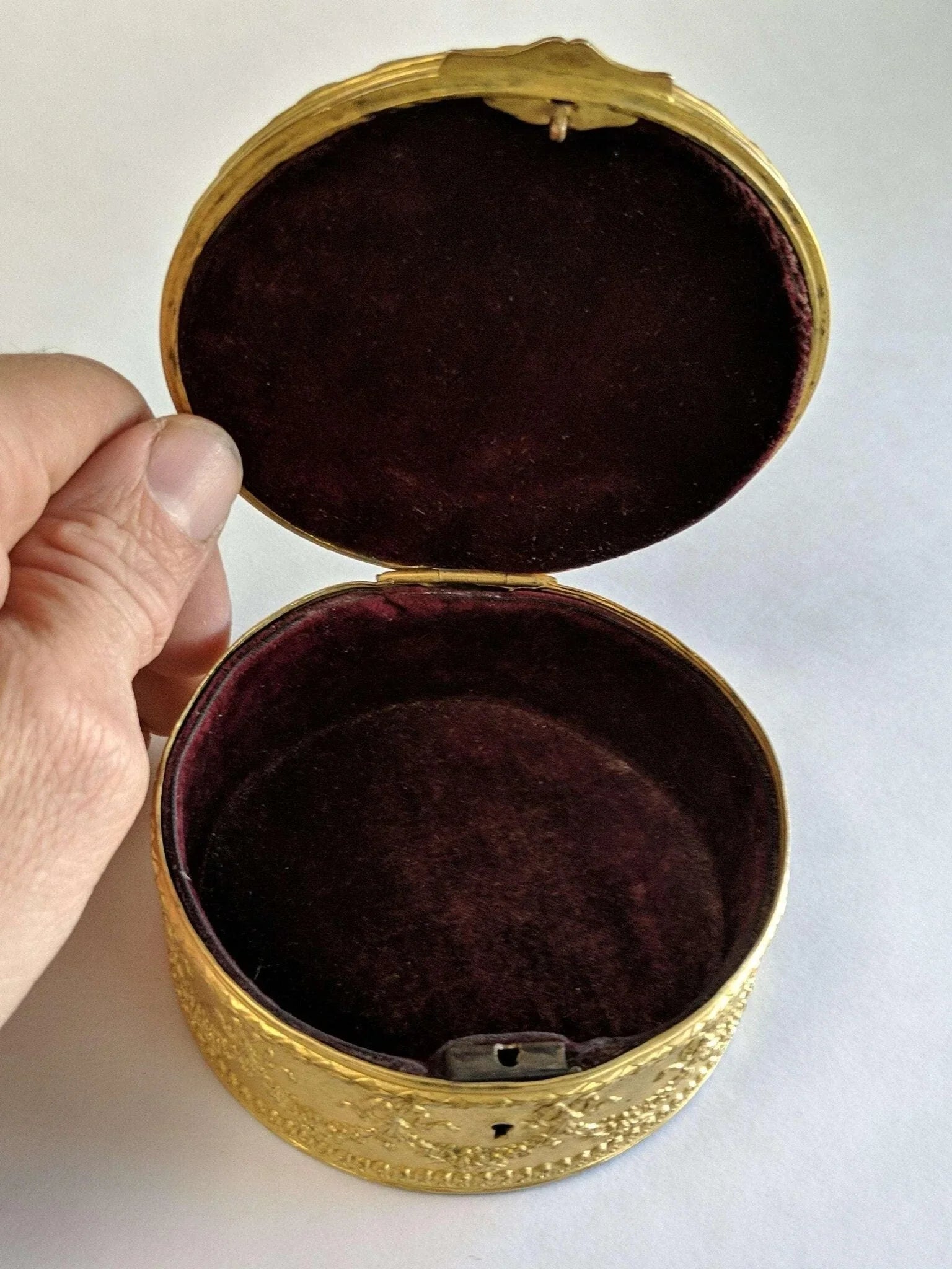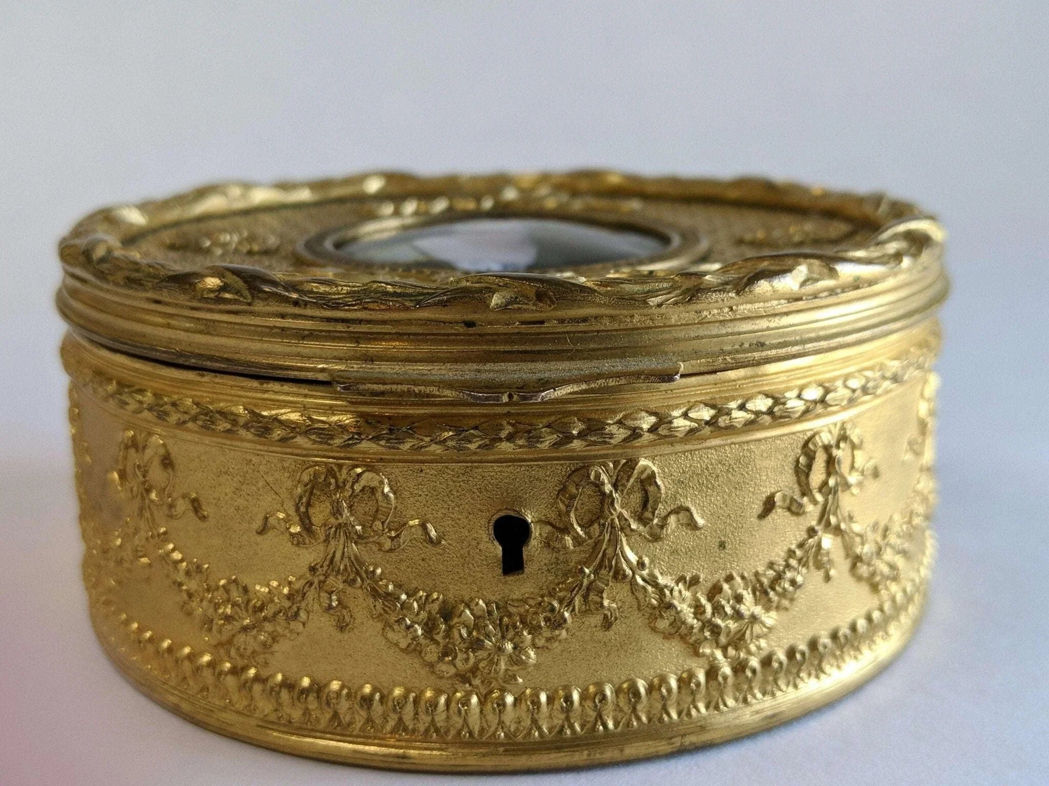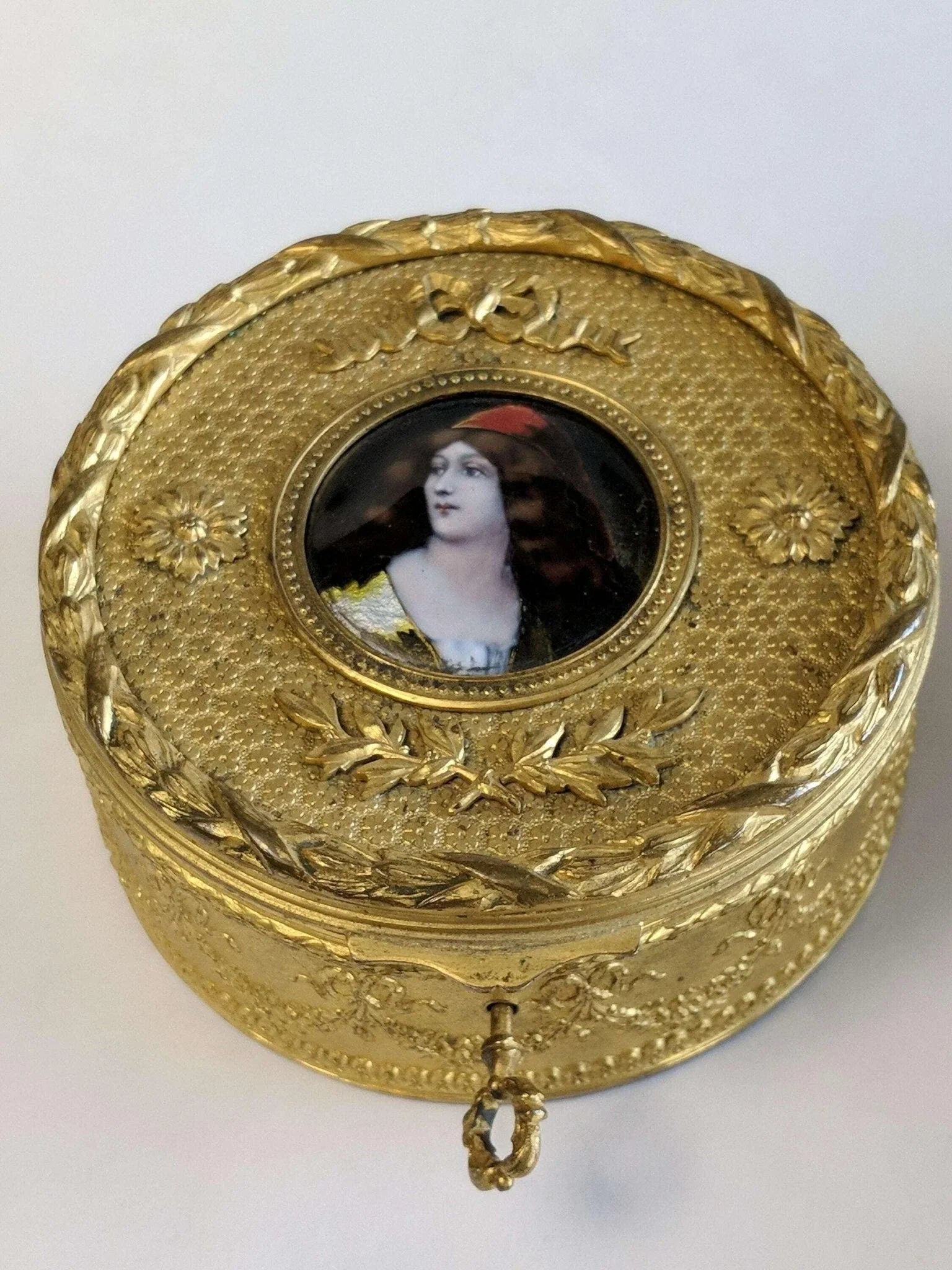 c1890 French Gilt Bronze Mounted French Enamel Portrait Plaque Jewelry Box. 3.75" wide x 1.75" tall 1.5" plaque. Faint signature on plaque. Original key, hinge is slightly bent but it still closes and locks.