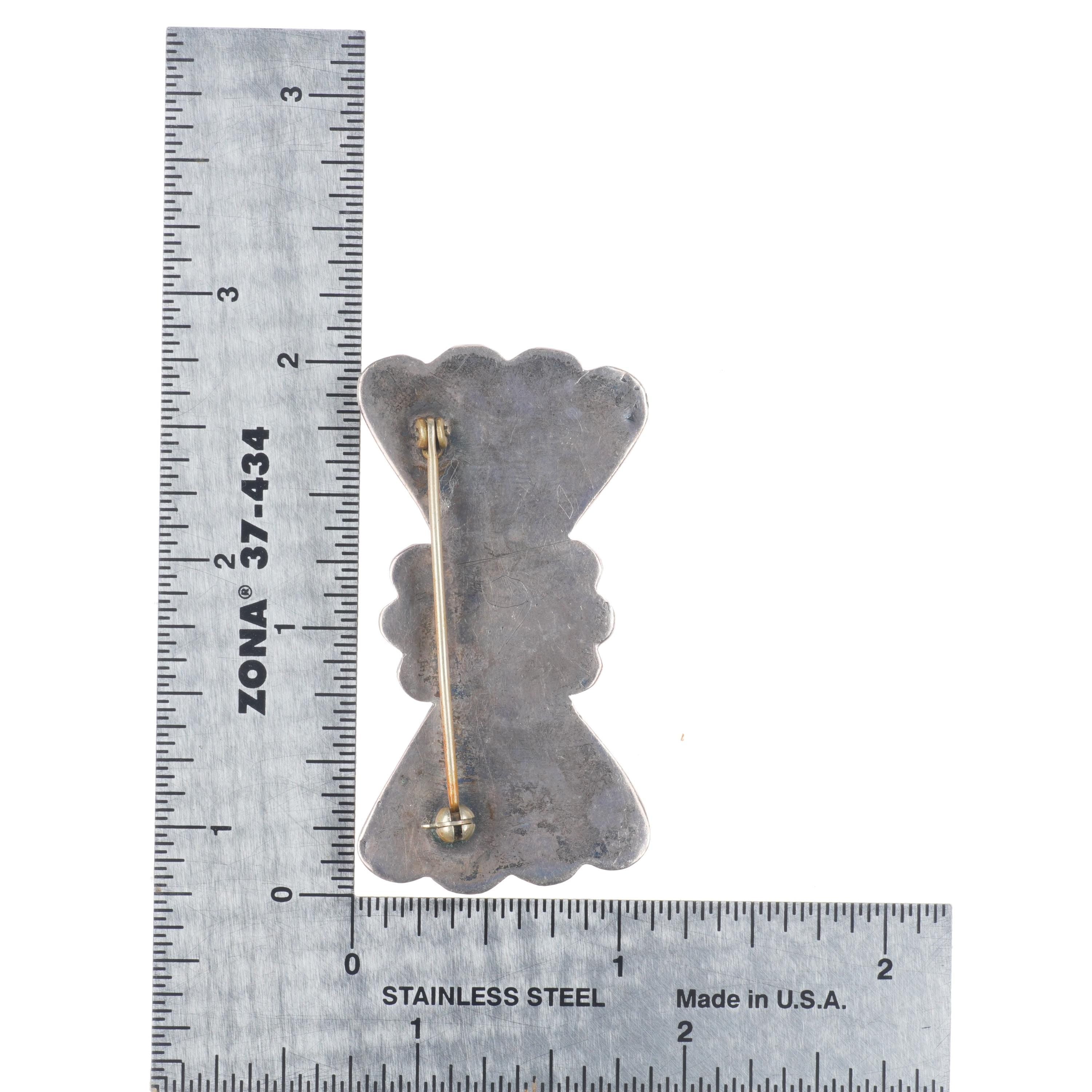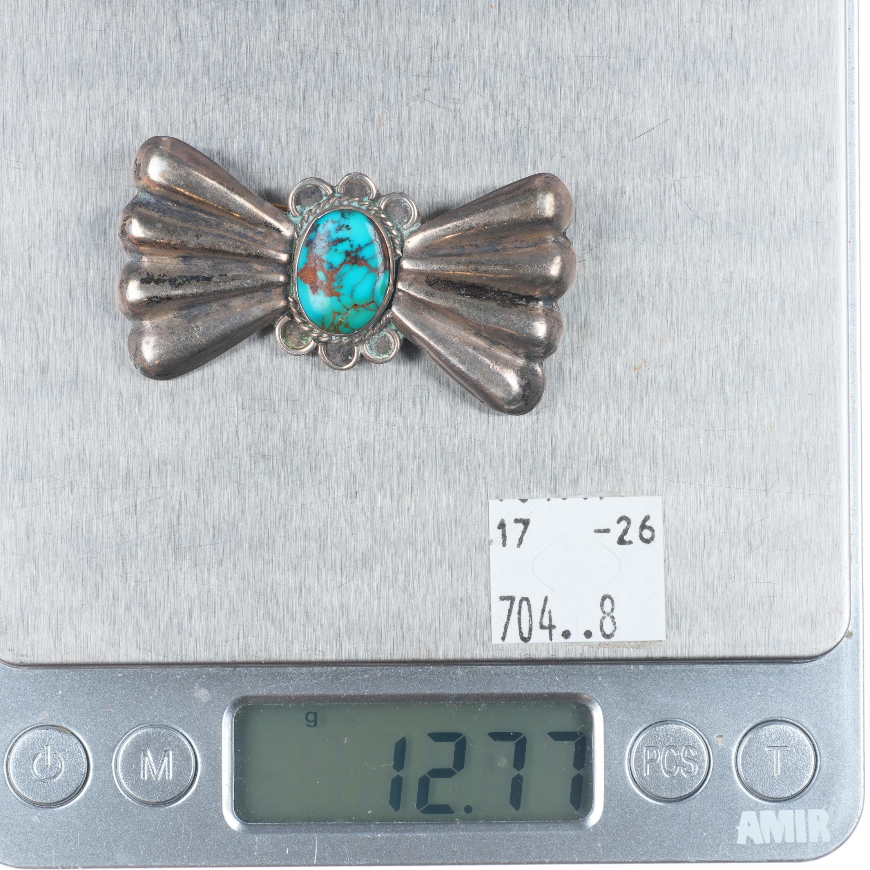 c1940 Vintage Navajo sterling silver bowtie pin/brooch with nice turquoise. Selling the pin shown in good condition with weight and measurements in pictures. Tested and guaranteed solid sterling silver. Circa second quarter of the 20th century.