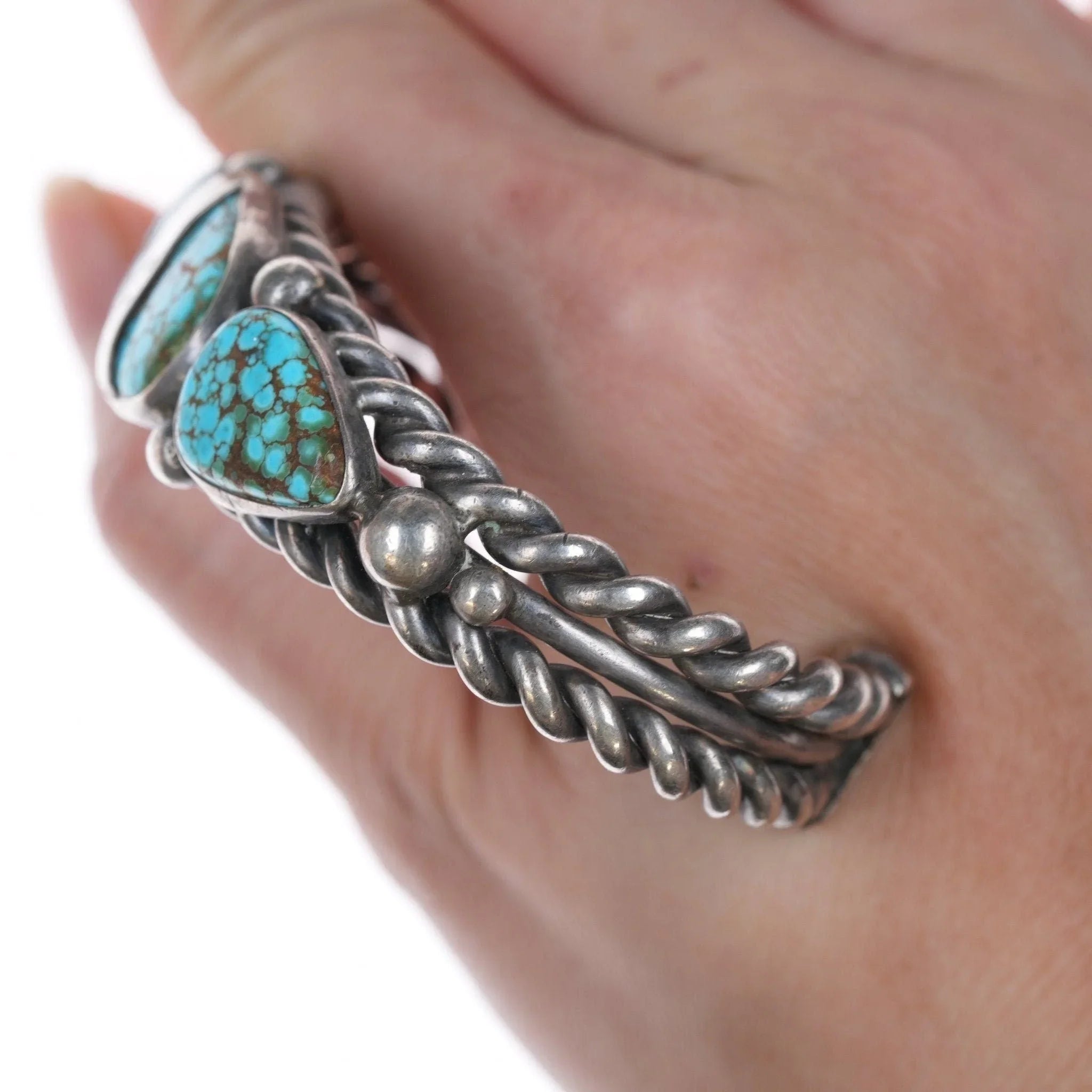 Gelang manset kawat perak bengkok Navajo #8 tahun 1940-an 6,5 inci, lebar 18 mm, 65,6 gram, gelang pirus alami bermutu sangat tinggi dari kuartal kedua abad ke-20.