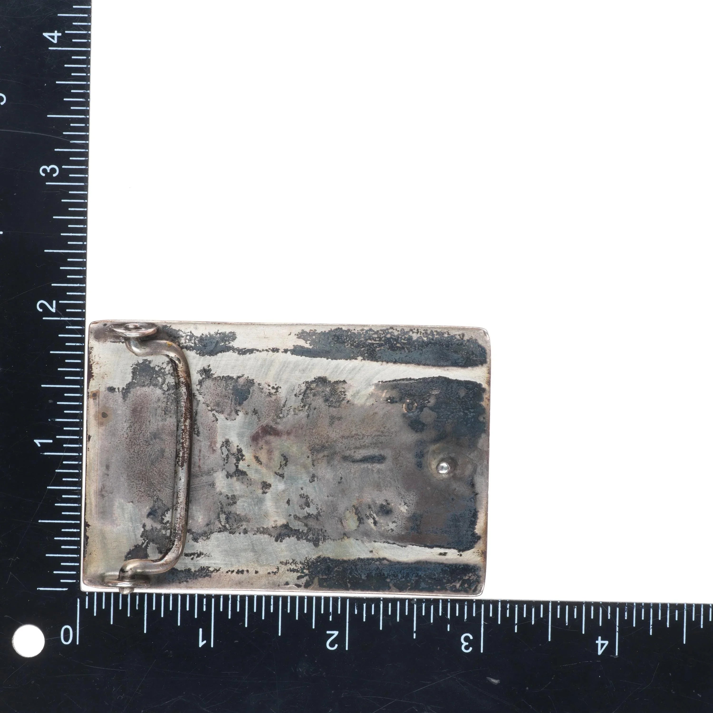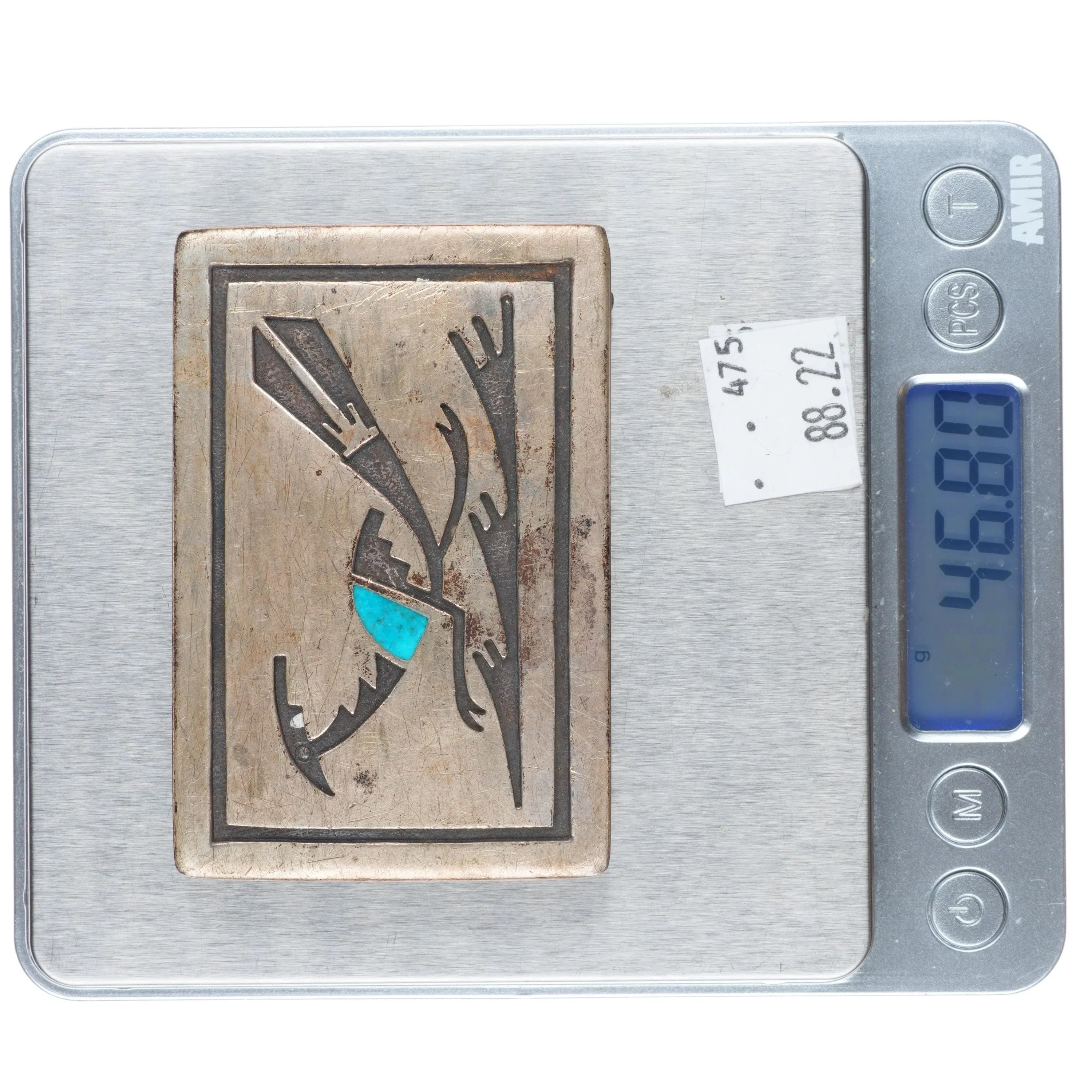 c1950‘s Navajo Overlay turquoise inlaid sterling silver roadrunner belt buckle. Tested and guaranteed solid sterling silver, fits up to a 1.5" wide belt. Weight and measurements in pictures, circa mid 20th century.