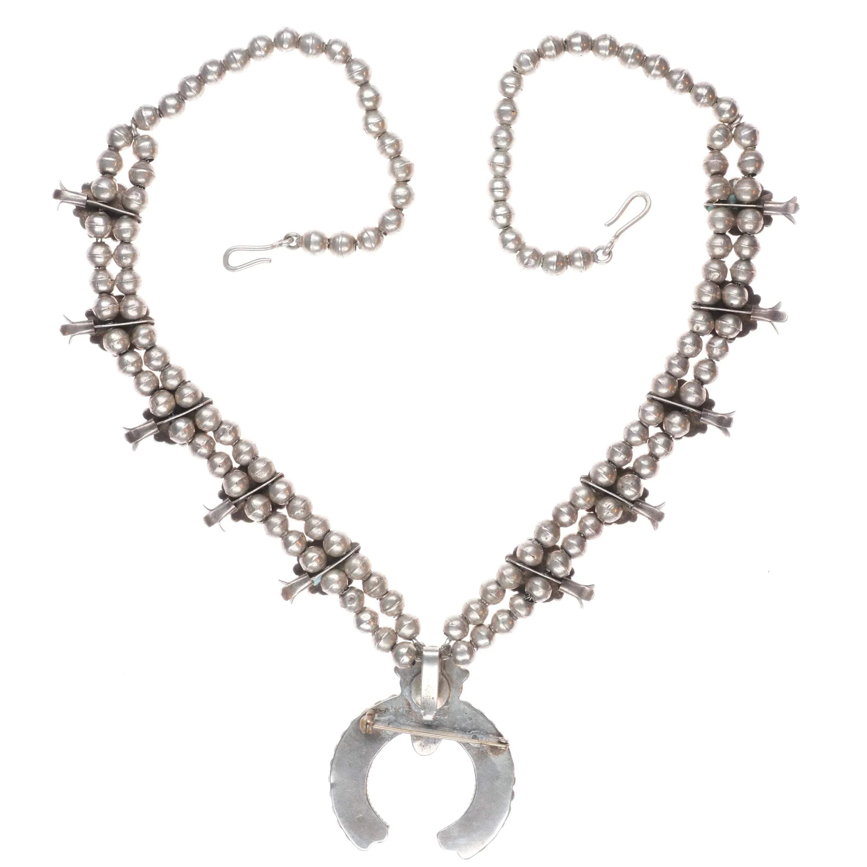 c1950‘s Zuni sterling silver Sleeping Beauty turquoise squash blossom necklace. Circa mid 20th century, tested and guaranteed solid sterling silver. No apparent issues. 21" long with no apparent markings.