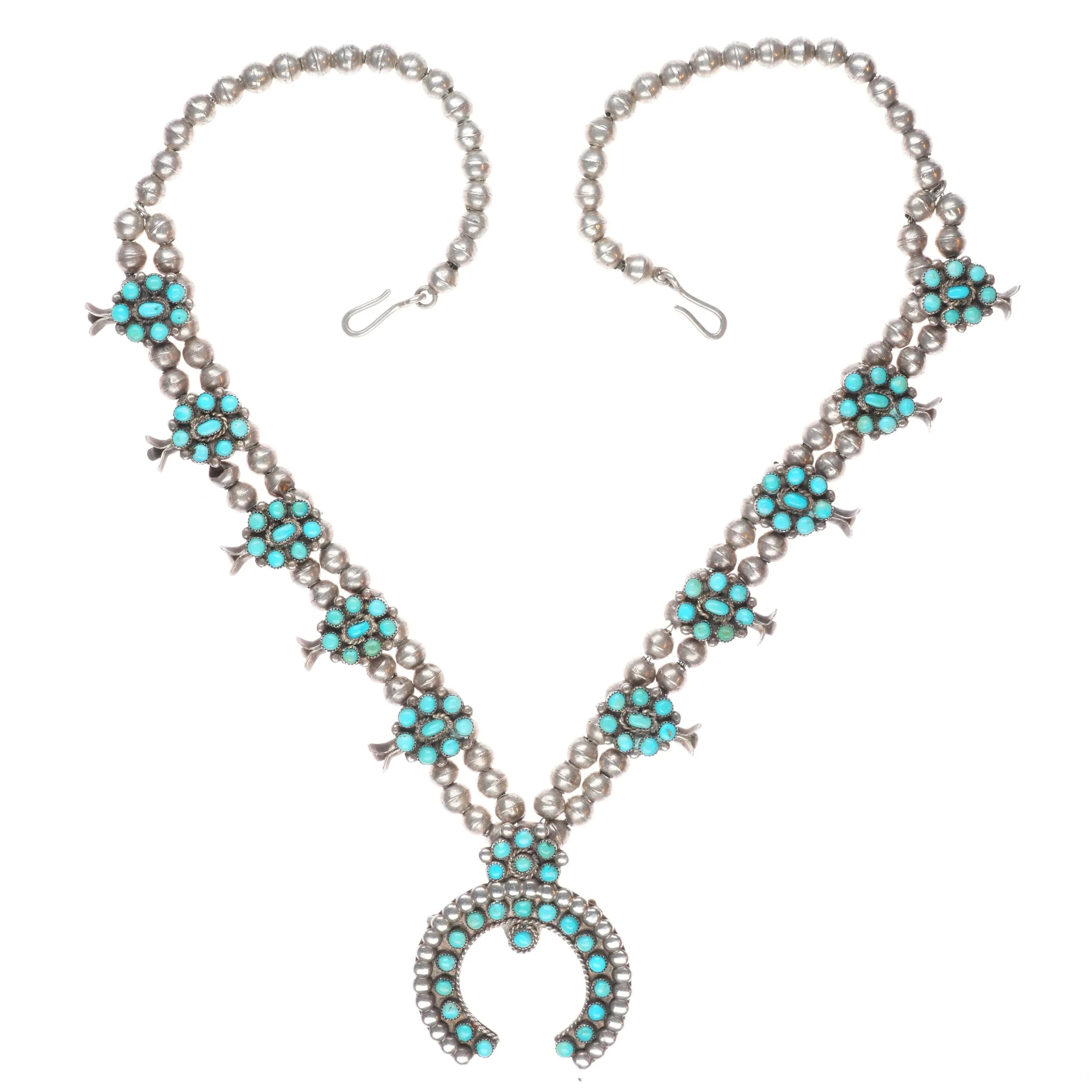 c1950's Zuni sterling silver Sleeping Beauty turquoise squash blossom necklace