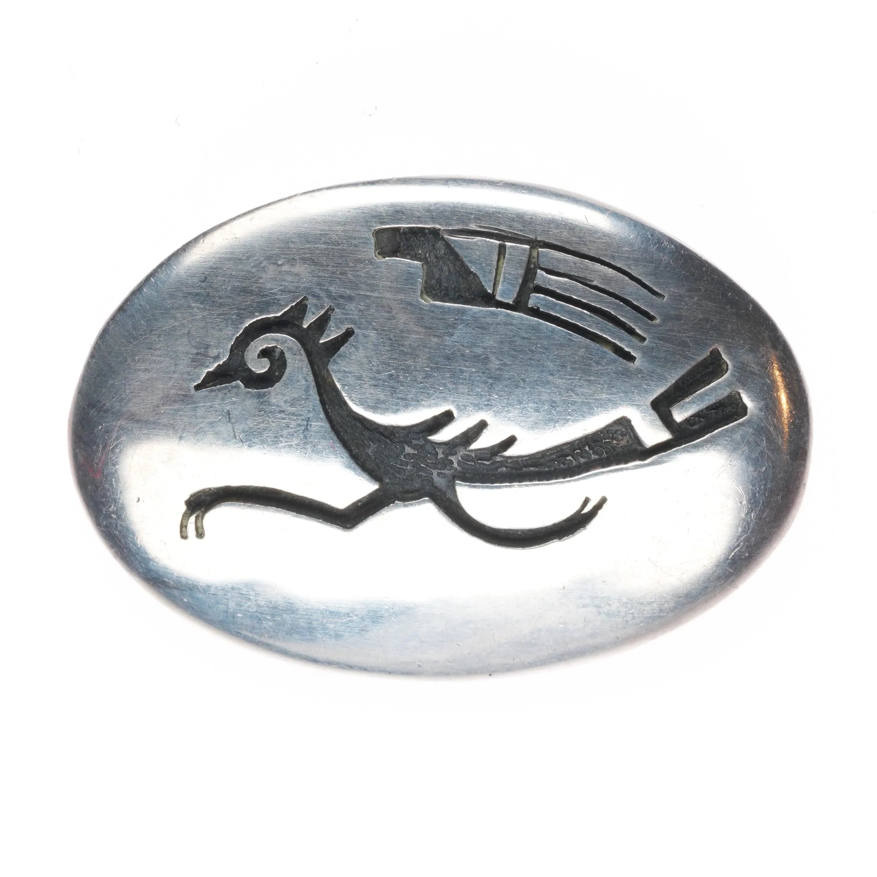 c1960's Walter Polelonema Hopi Overlay Vintage sterling silver roadrunner pin