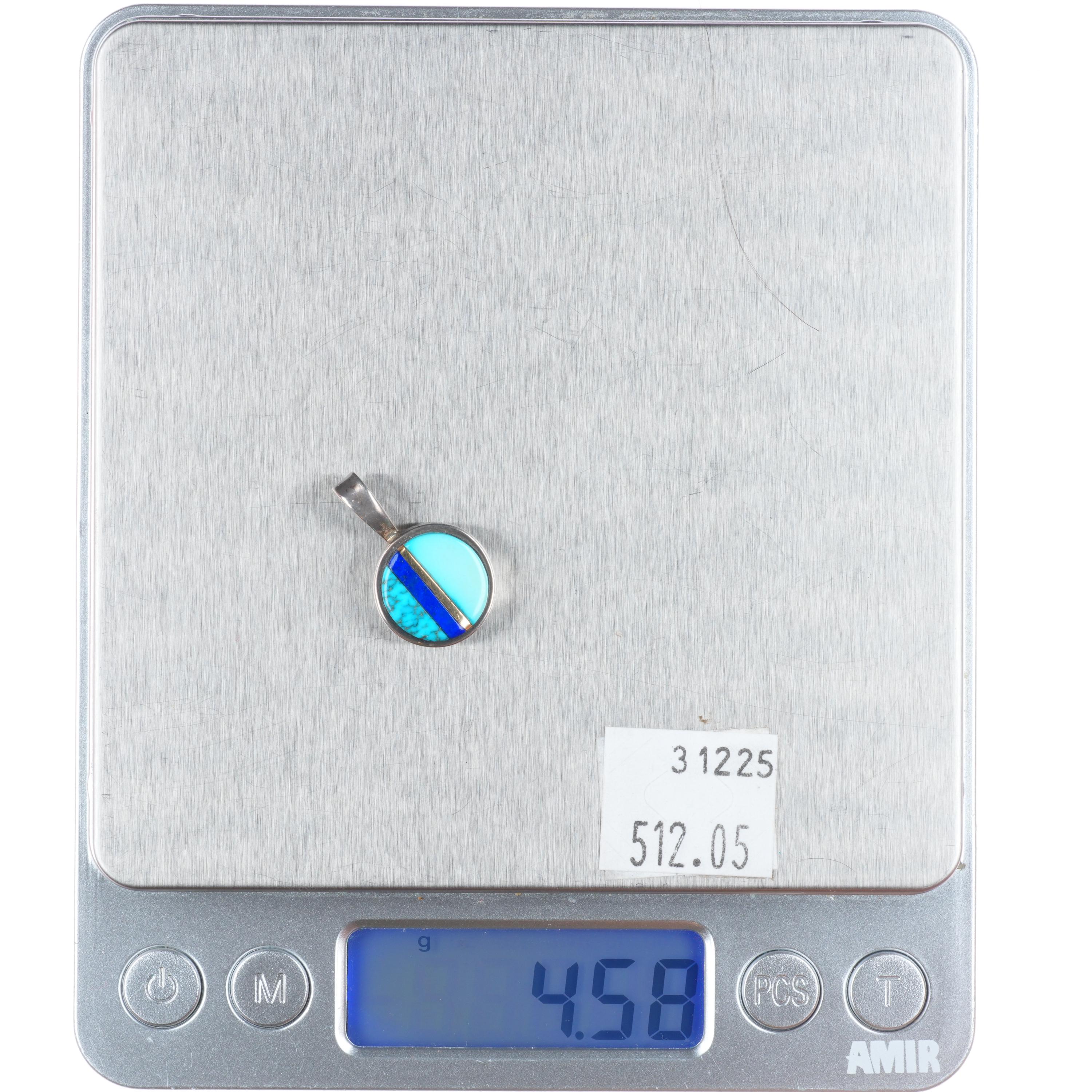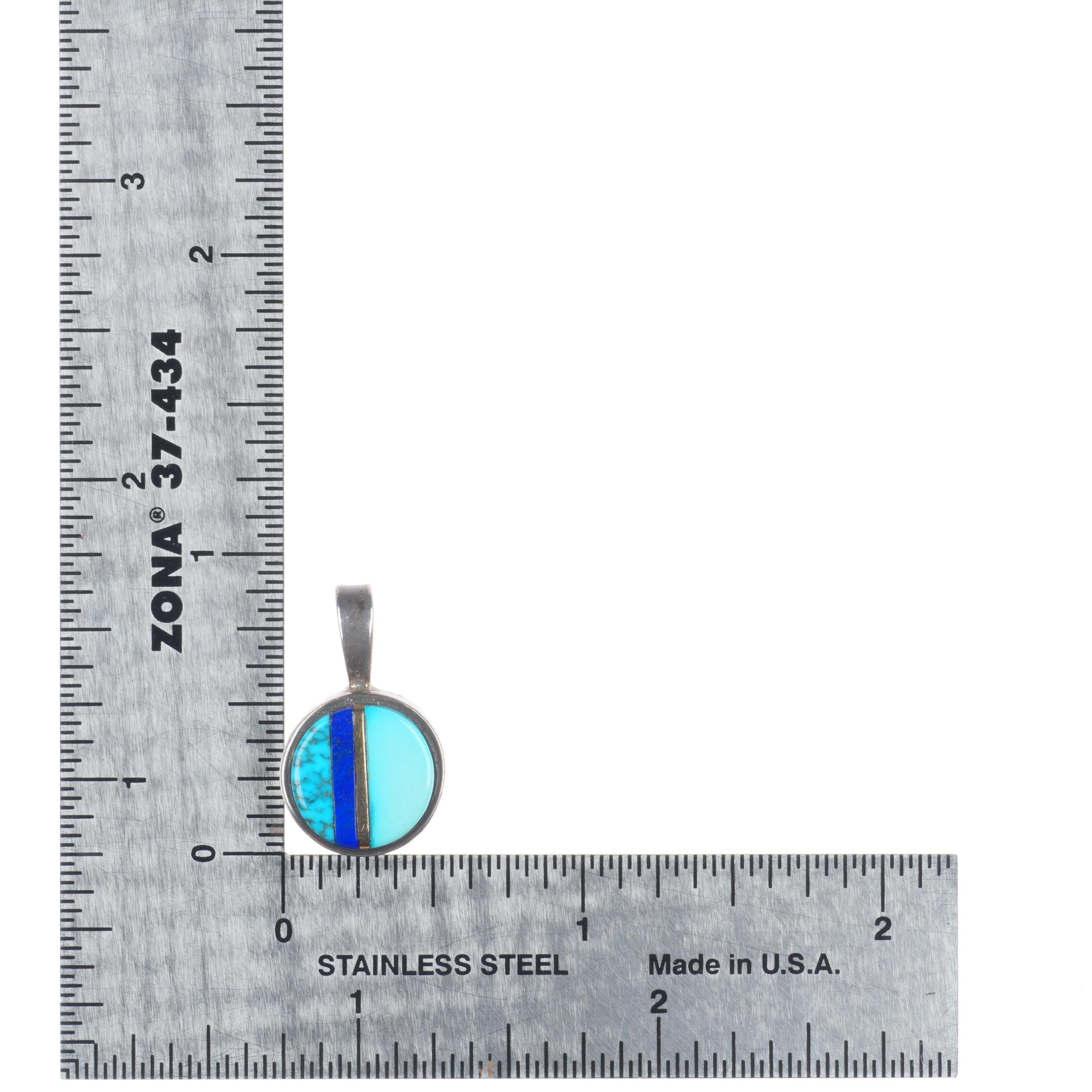Charles Loloma Hopi 18k gold, sterling silver high grade Turquoise pendant. Tested and guaranteed solid sterling silver with solid 18k gold inlay bar weight and measurements in pictures. Marked as shown, circa last quarter of the 20th century (1980's). Small but great, authentic. High grade natural American turquoise, likely Lone Mountain and Sleeping Beauty, with Lapis, 14k gold, and sterling silver. High quality as shown.