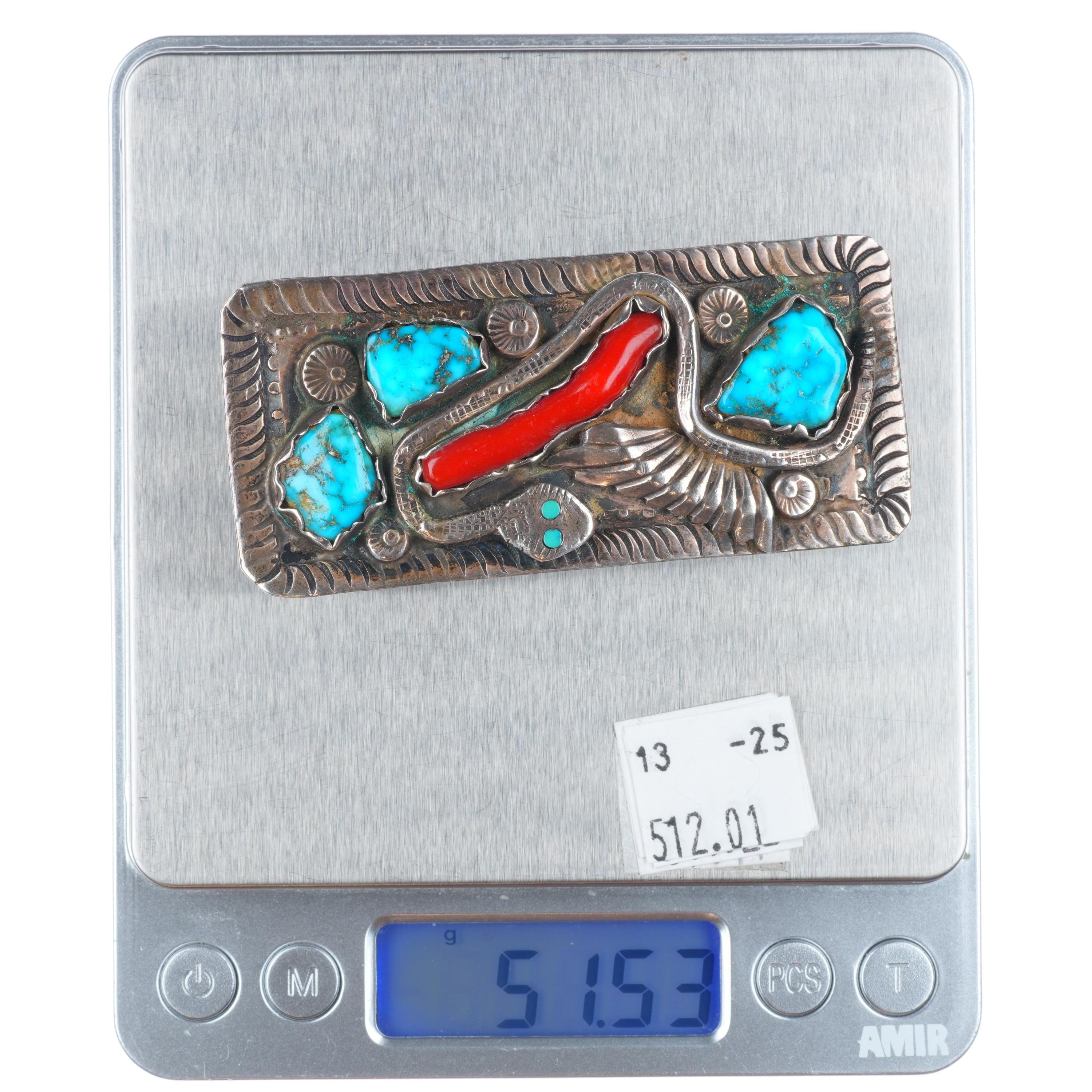 Dan Simplicio Zuni sterling silver snake belt buckle turquoise/branch coral. Tested and guaranteed solid sterling silver with weight and measurements in pictures. Fits up to a 1" belt, circa third quarter of the 20th century. Unmarked, attributed. Dan Simplicio (1917-1969) is best known for innovative turquoise and coral settings as well as his impeccable silver work. Dan worked at C.G. Wallace’s trading post and ultimately Wallace became one of the biggest Simplicio collectors. He used branch coral it its natural form, which was unheard of during this time period. He innovated the natural coral and turquoise style of jewelry while simultaneously excelling with his silver work. He was also a master of inlay, which he did only in his formative years of which we have few examples of today. Simplicio worked with silver in a very interesting way, a way that his son credits to his time overseas in WWII. He was influenced by the French, German and Italian use of leaf patterns. It is this leaf work that sets Simplicio’s pieces apart from traditional Zuni work.