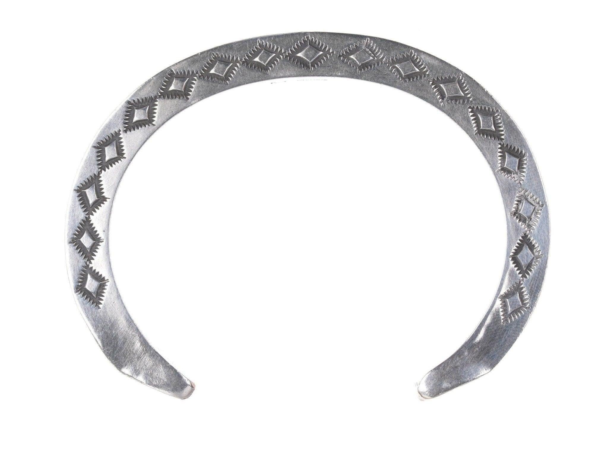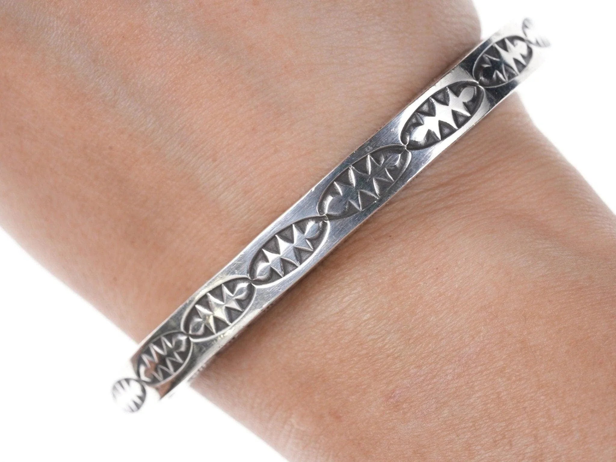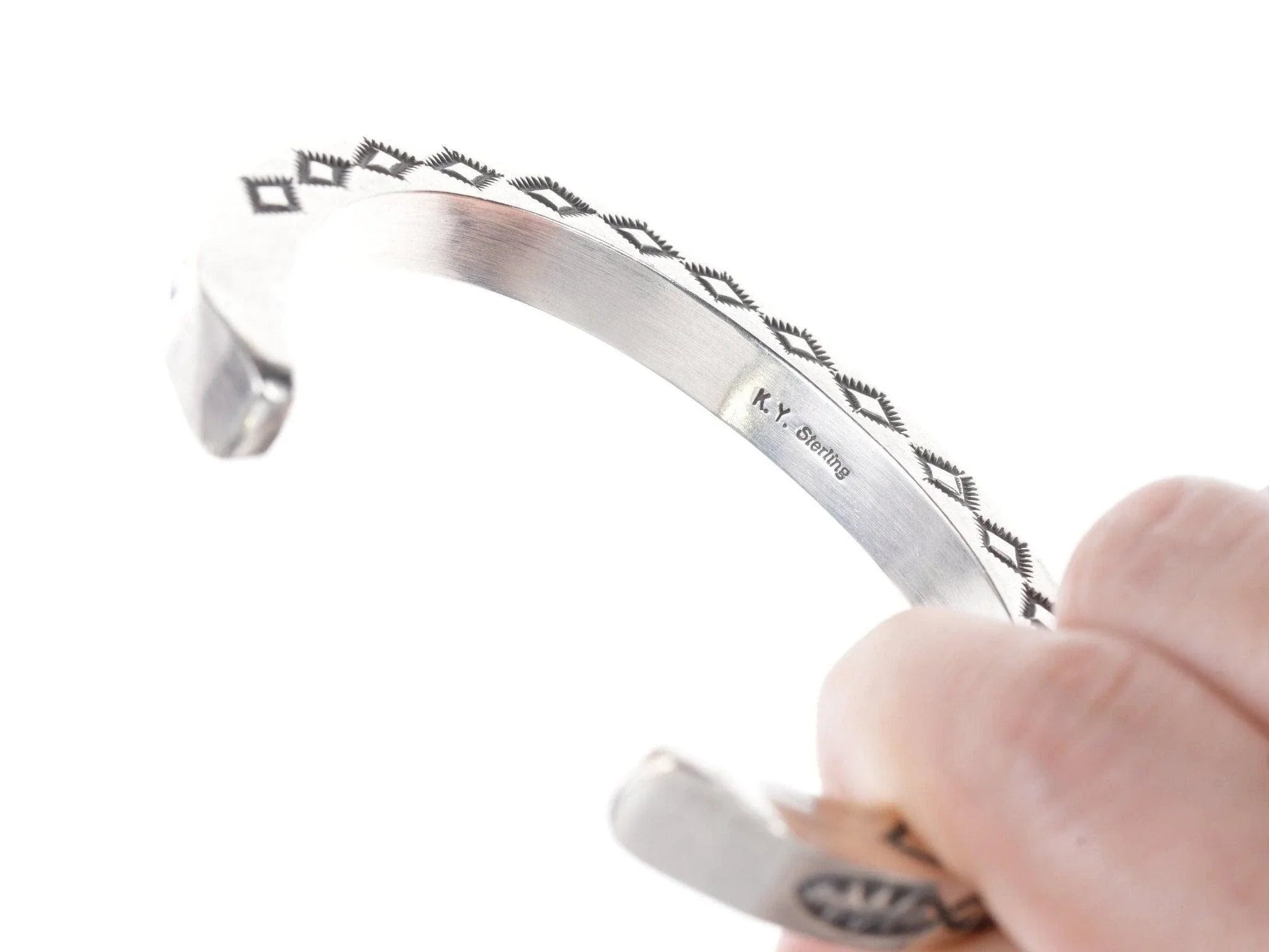 7" Heavy Kay Yazzie Navajo Sterling silver heavy stamped bracelet. Very heavy<br>for it's size with no issues, fits up to a 7" wrist.<br><br>All precious metals are tested and guaranteed, any Native American jewelry<br>referred to as Silver or Sterling is guaranteed to be a minimum of 90% (coin)<br>silver and possibly higher content. Anything marked is guaranteed to be what<br>it's marked, most bracelets are photographed on a 6" wrist (non hairy), rings<br>photographed on the appropriate sized finger when possible. With bracelets if<br>the measurement is not given in the description then inside circumference is<br>shown where the metal meets the number on the the cloth tape measure.