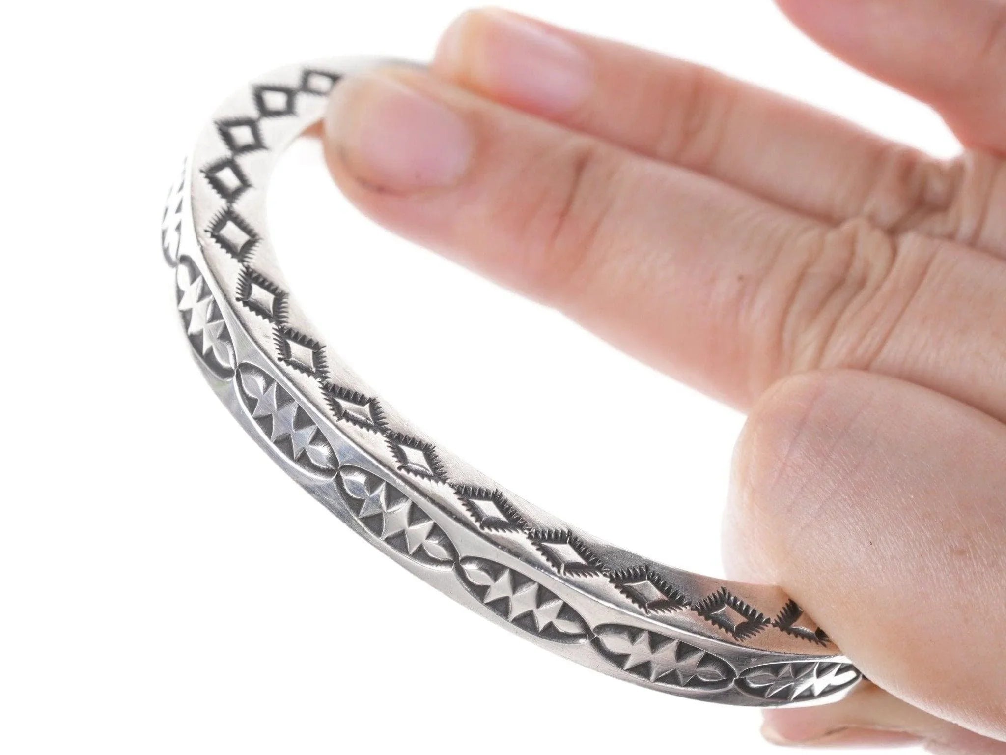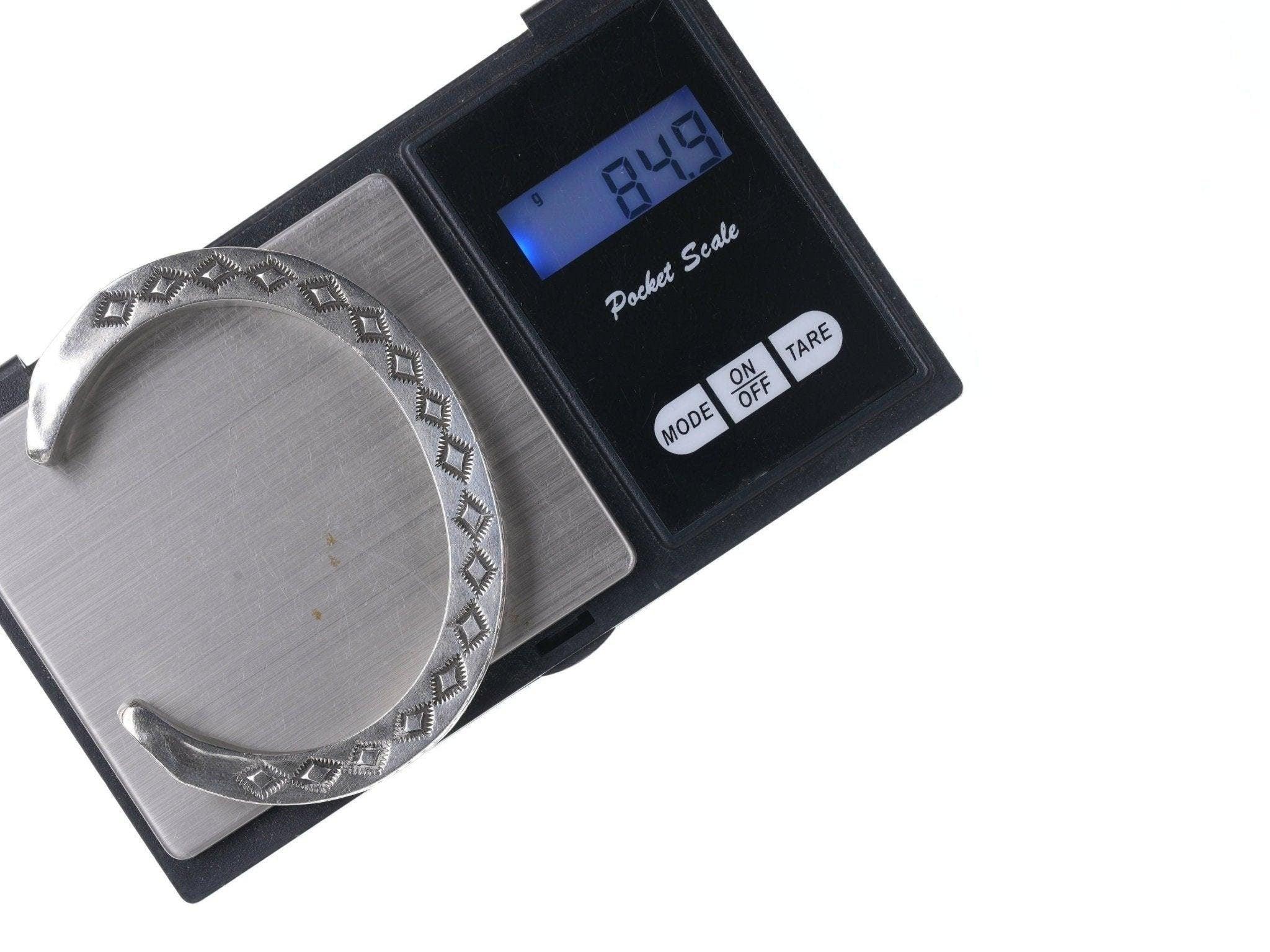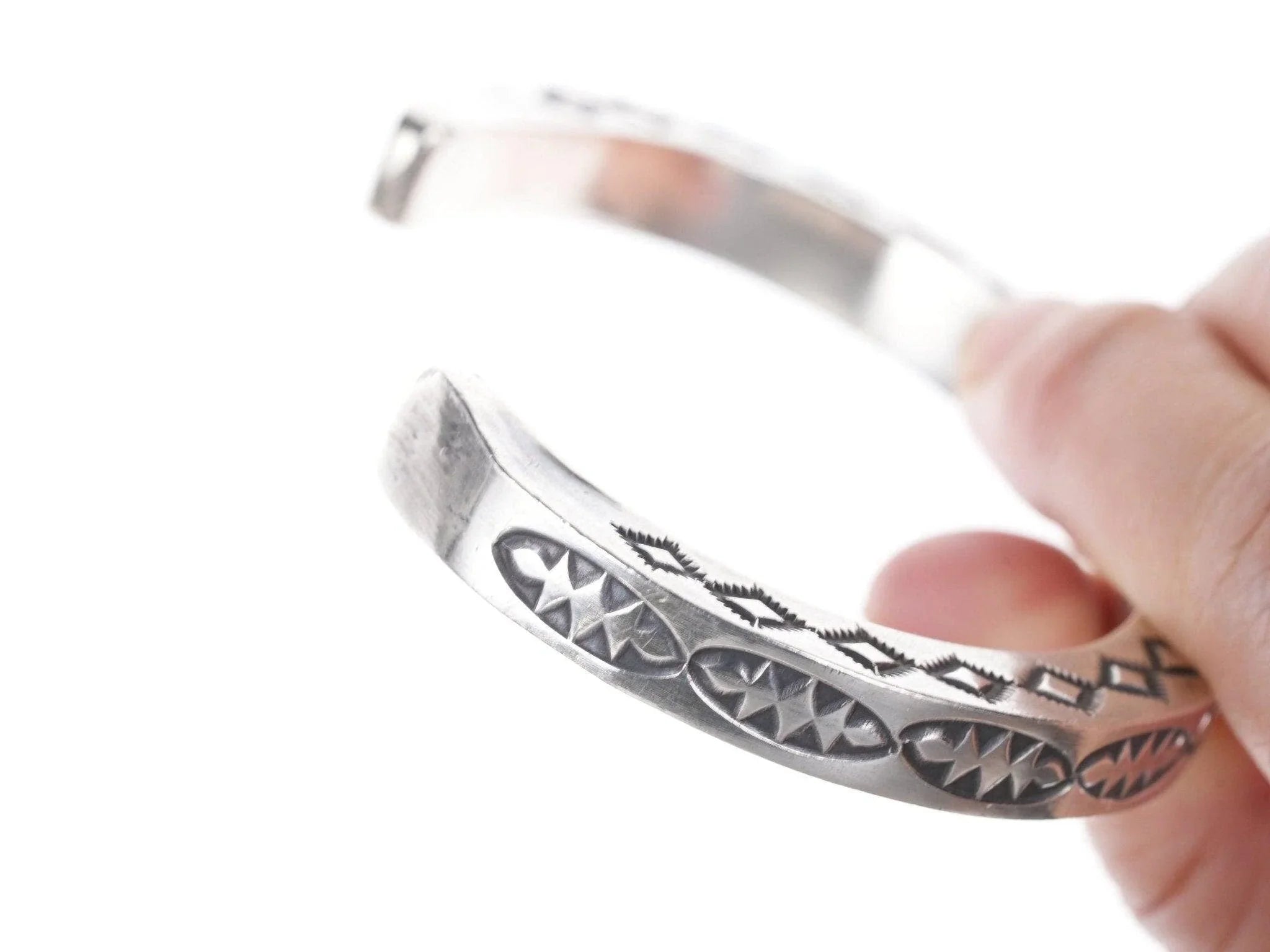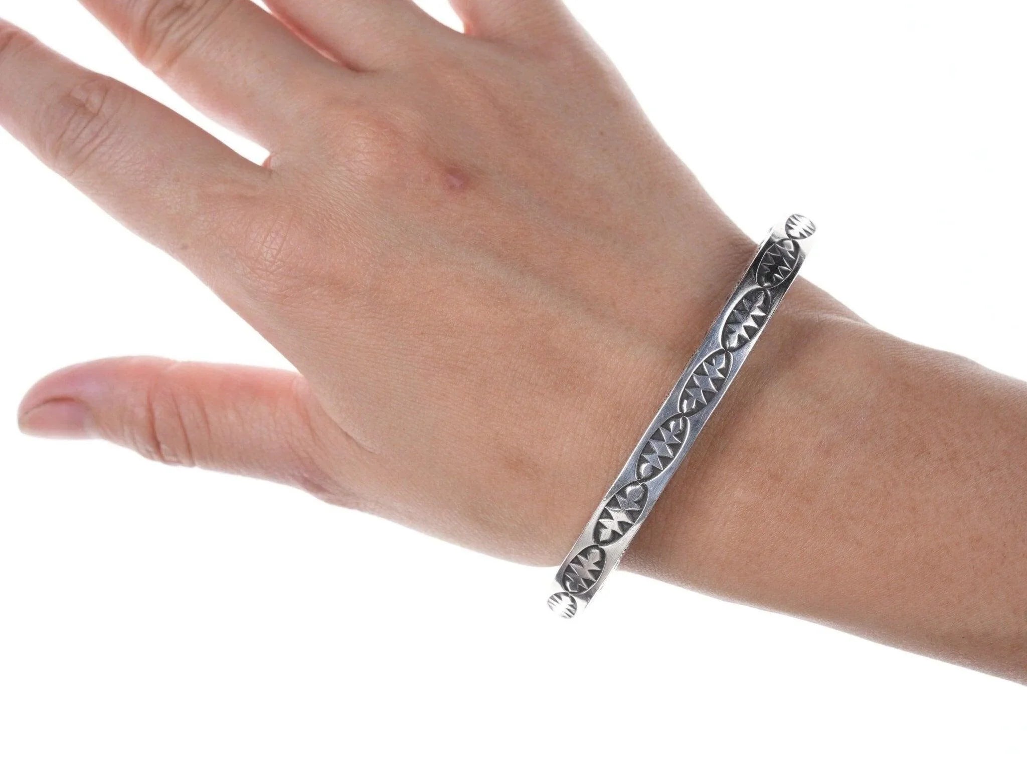 7" Heavy Kay Yazzie Navajo Sterling silver heavy stamped bracelet. Very heavy<br>for it's size with no issues, fits up to a 7" wrist.<br><br>All precious metals are tested and guaranteed, any Native American jewelry<br>referred to as Silver or Sterling is guaranteed to be a minimum of 90% (coin)<br>silver and possibly higher content. Anything marked is guaranteed to be what<br>it's marked, most bracelets are photographed on a 6" wrist (non hairy), rings<br>photographed on the appropriate sized finger when possible. With bracelets if<br>the measurement is not given in the description then inside circumference is<br>shown where the metal meets the number on the the cloth tape measure.